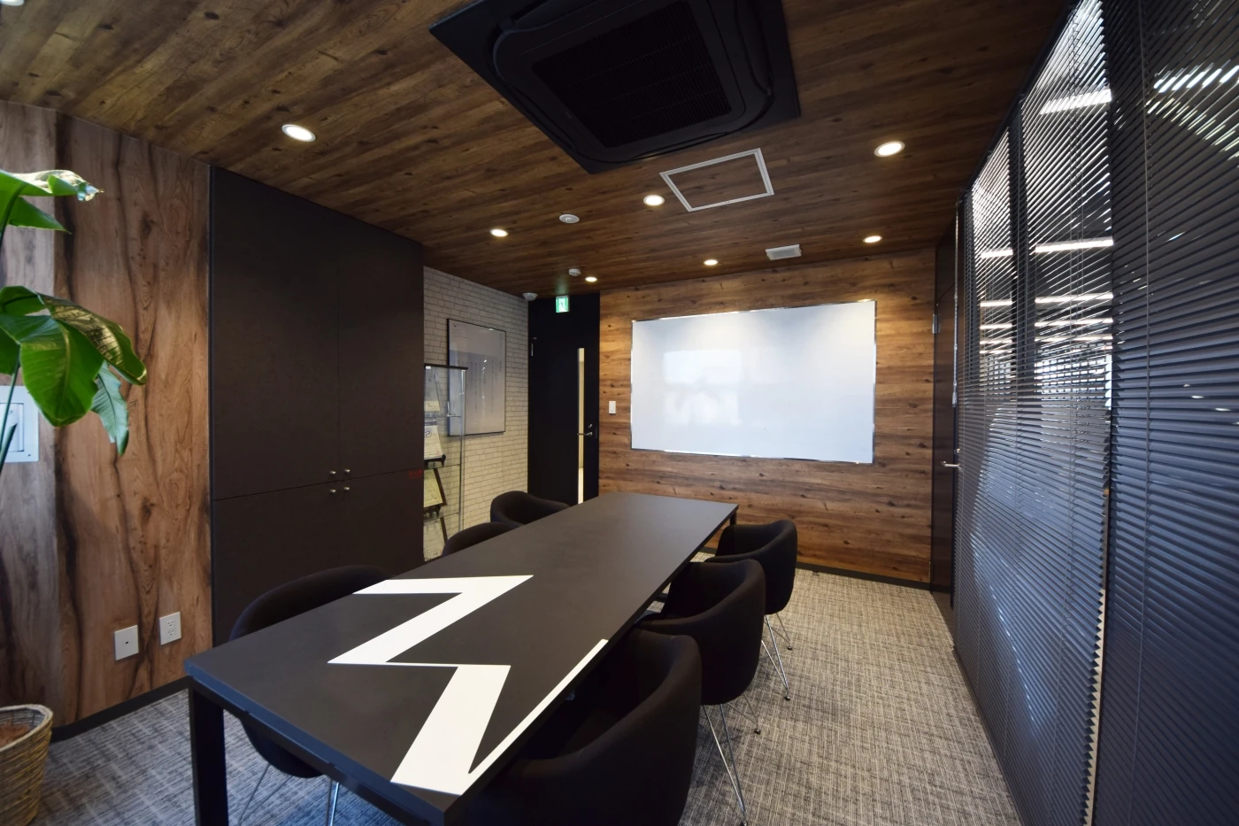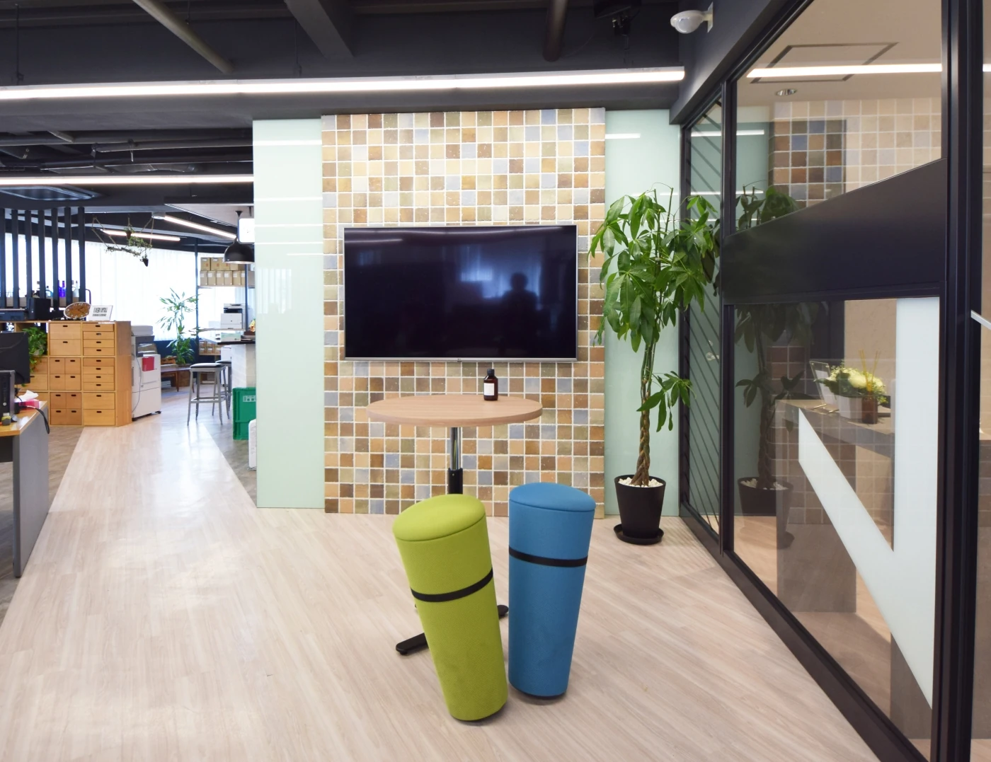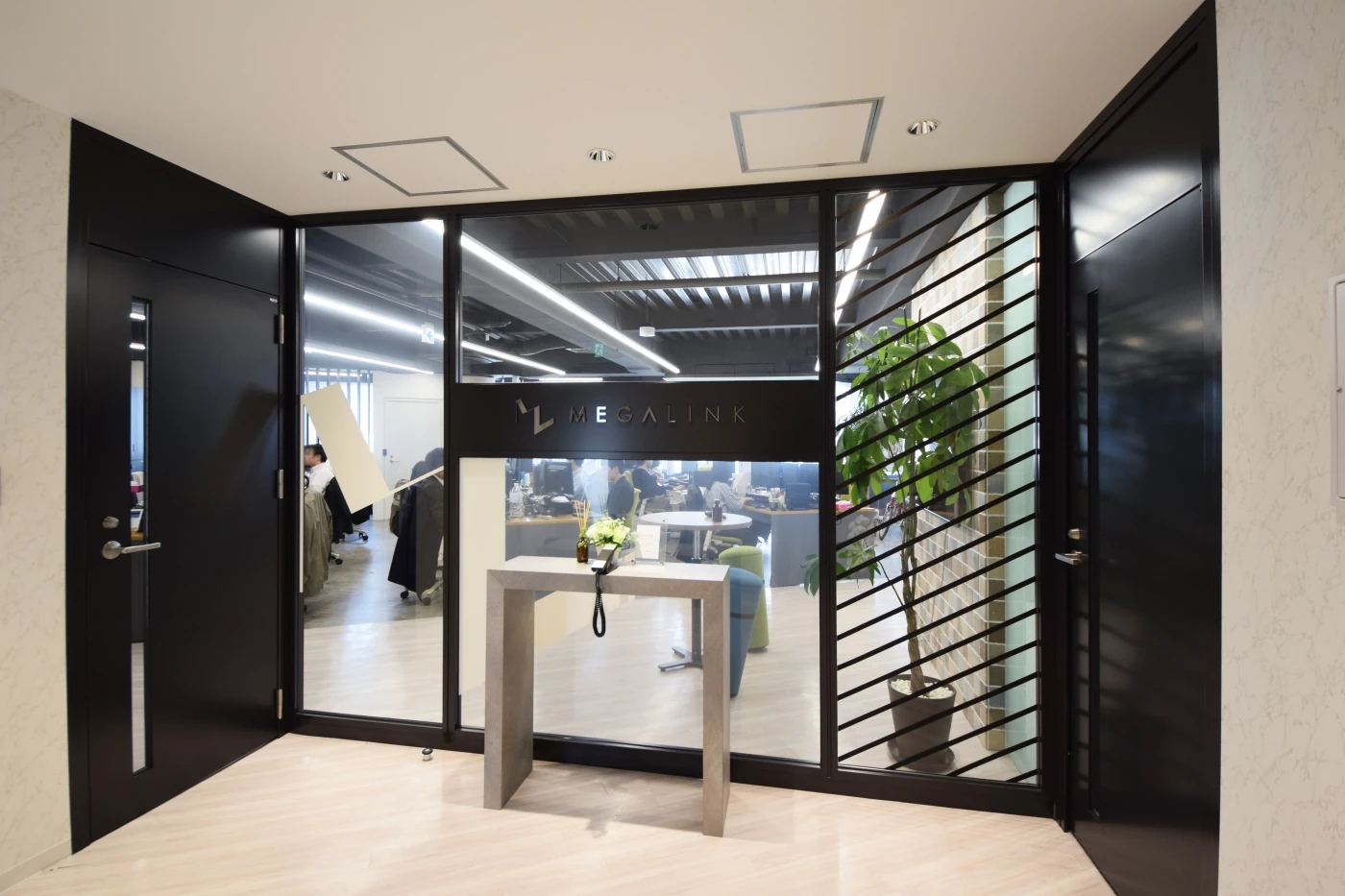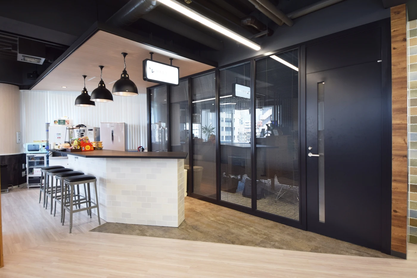3度目のご移転となった今回のプロジェクト。最初の頃からデザインされている「白・黒・グレー」の"メガリンク"らしいカラーリングをベースに、やさしい木目の色合い、淡い色使いのタイル貼りなどの”女性らしさ”も取り込み、上手くマッチングさせることができました。また、前回に引き続きバーカウンターも設置し、休憩はもちろんのこと作業もできるように電源を設置し、カウンター裏面に可動式の棚も備えるなど機能面も工夫しました。