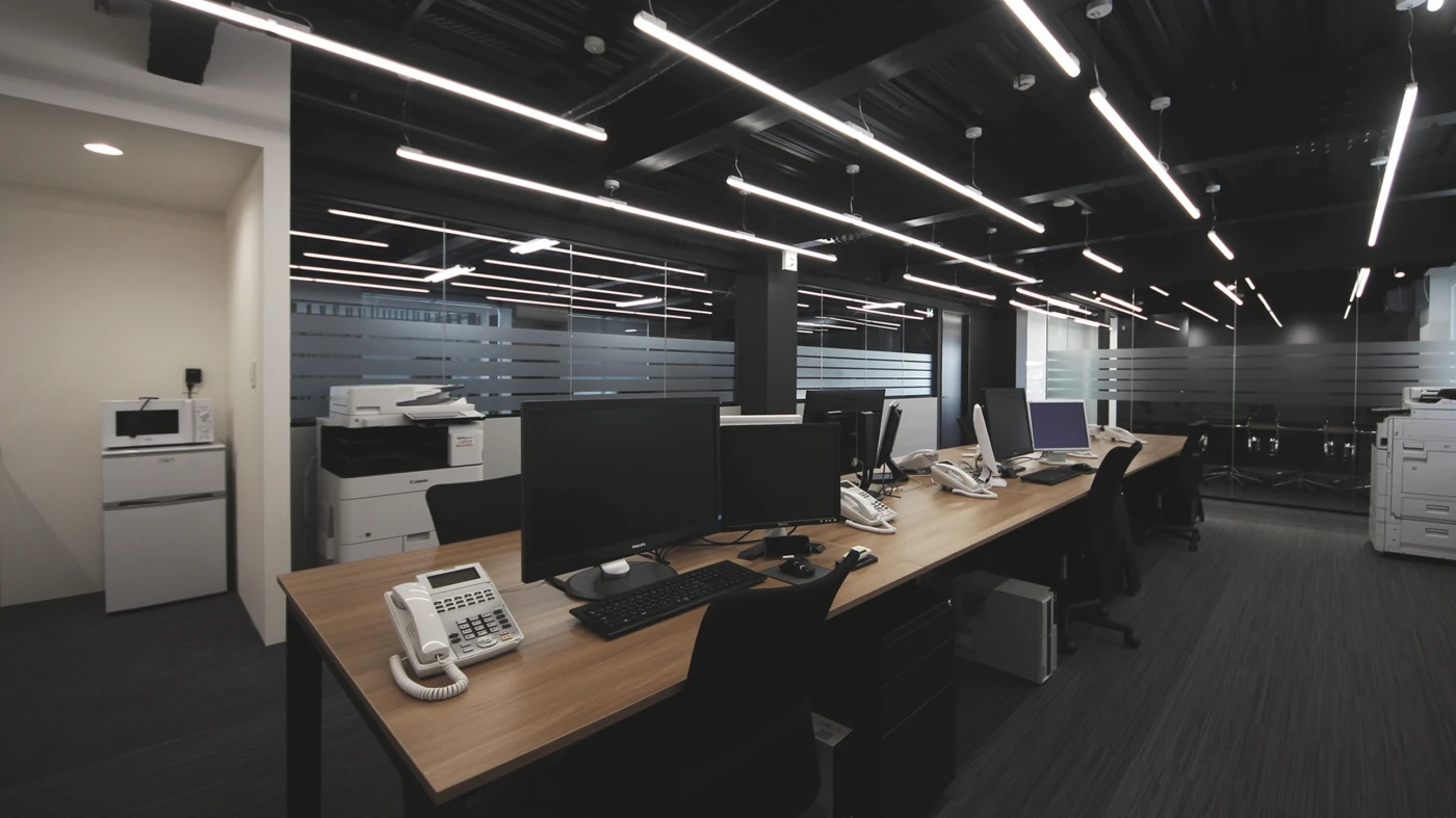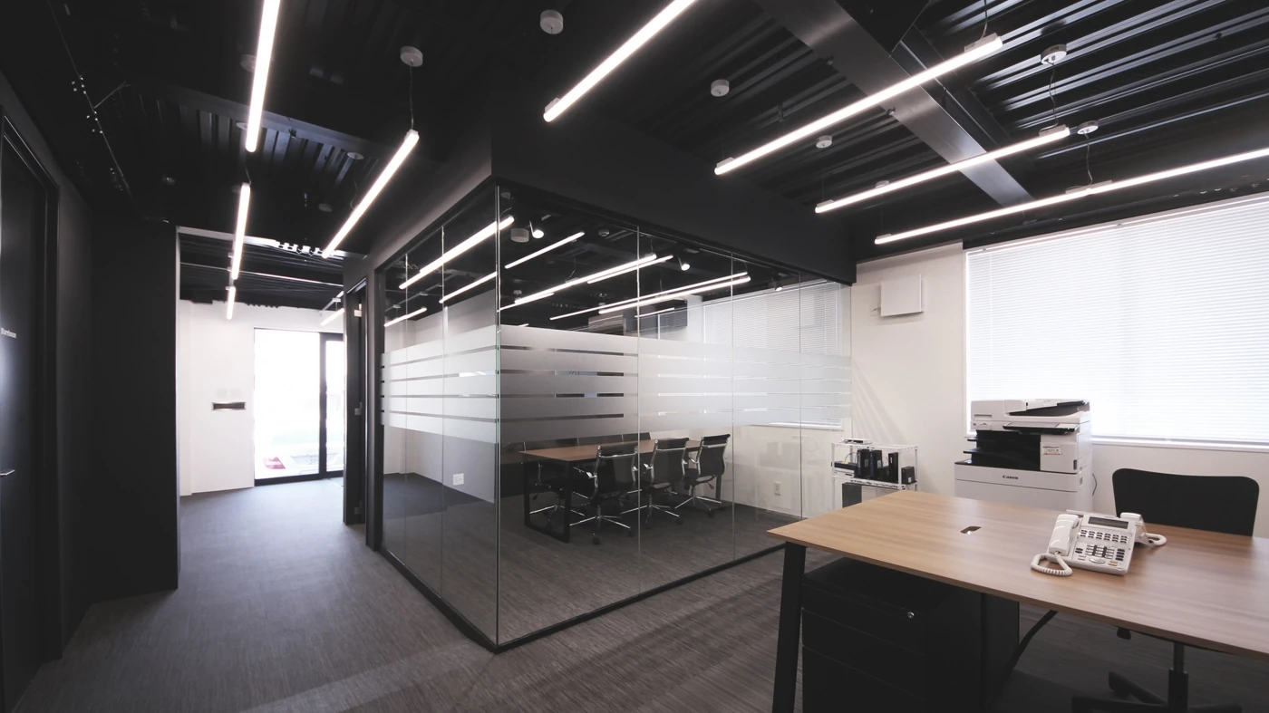 名古屋への拠点拡大に際し、「昔の固い風土・事務所感を一新したオフィスを開設したい」とのご要望のもと、3階建ての倉庫をフルリニューアルしました。外装も内装も事業内容が伝わることを意図し、輸入車と親密に関わる企業としての誇り、姿勢を魅せ、魂を湧き立たせる空間をデザインしました。空間構成はシンプルにオフィス、リフレッシュスペース、倉庫、更衣室ですが、ガラスや塗装の色、サインなどマテリアルにも一つ一つこだわり、躍動感とリアルを追求しました。天井を流れる照明は高級車の機敏さを表現しており、壁面の5本ラインは企業ロゴイメージを踏襲したデザインです。リフレッシュスペースはかっこよさを忘れず、木目を取り入れることで休まる空間を演出しています。どの部分を取ってみても、企業としての誇りや魂が感じられるスタイリッシュな空間となりました。