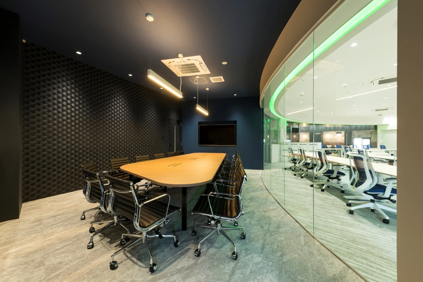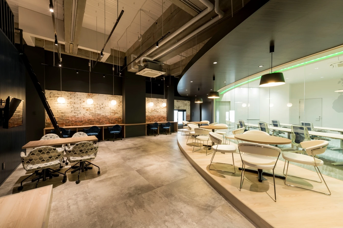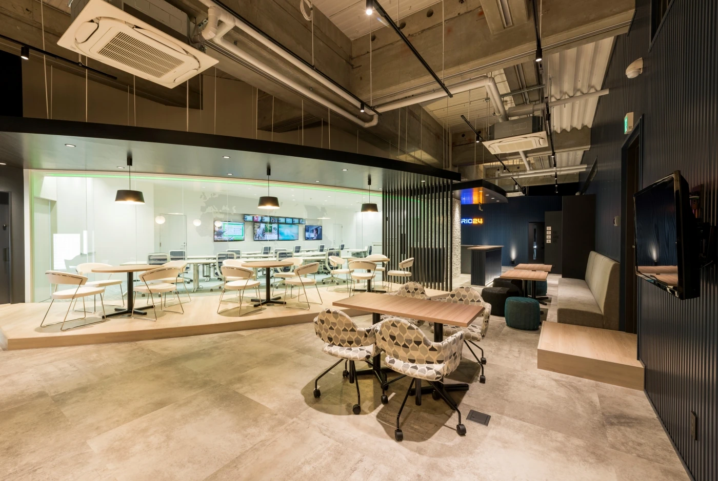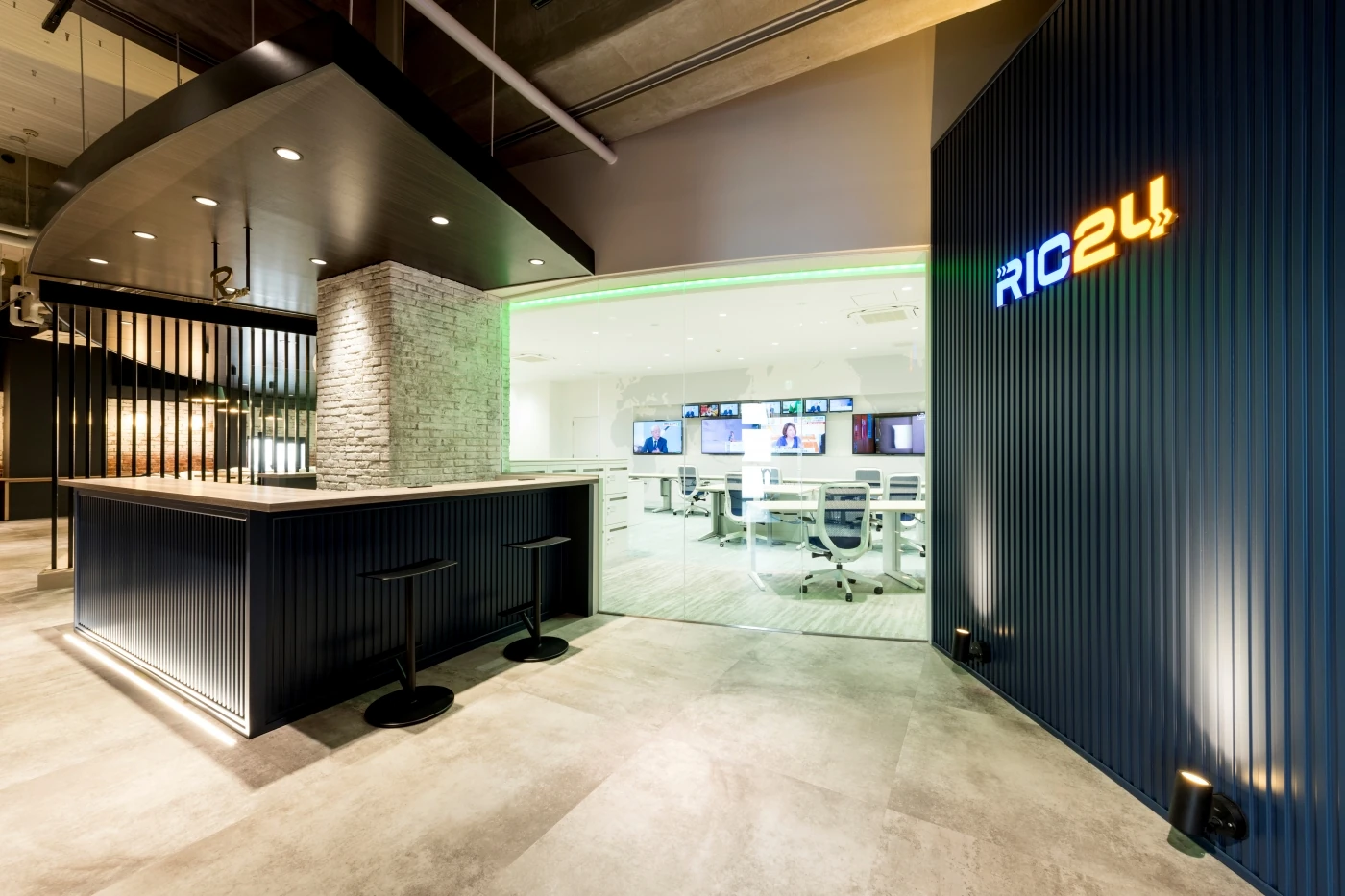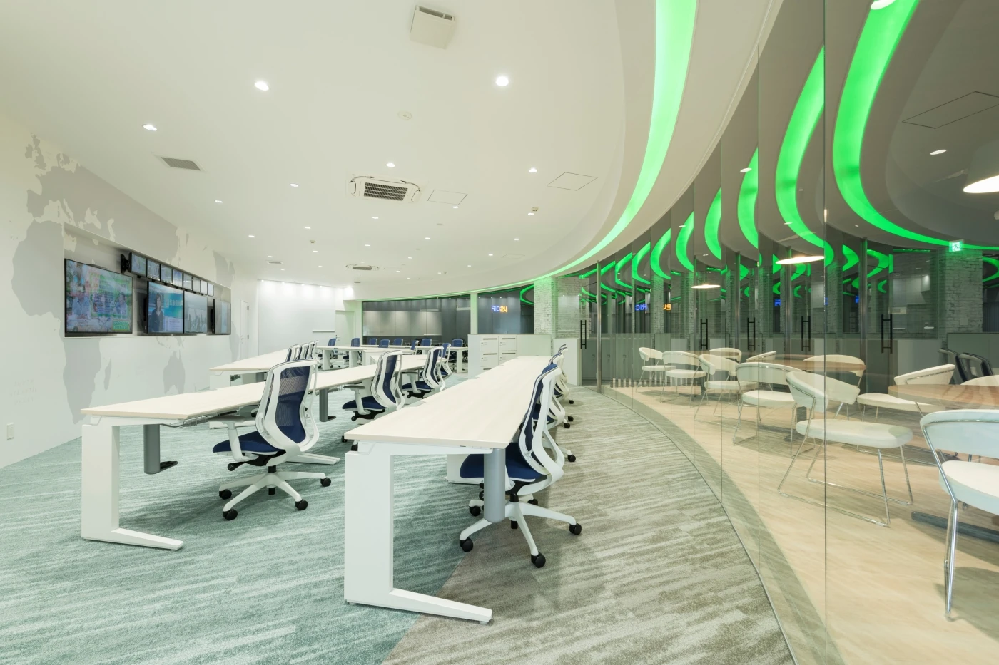 危機管理情報センターとして24時間365日オフィスを稼働させるため、センター内外は違う雰囲気にして空間にメリハリを持たせました。入った瞬間に目に飛び込んでくるセンターはスタッフの方々が働いている姿を見ることができ、基地のような空間となっています。「見せるオフィス」として、埋め込みの12面モニターと世界地図のグラフィックがインパクトを与え、3つのコードのもとで遷移する情報収集体制に合わせてカラーライトを変更できるようにしました。センター外は全体的にトーンを落とし、落ち着き洗練された空間に。壁はエイジングしたブリックタイルやガルバニウムを使用し、家具もゆったりとしたもので選定しました。集中して働くときと少しリラックスをして働くときの切り替えができるオフィスです。