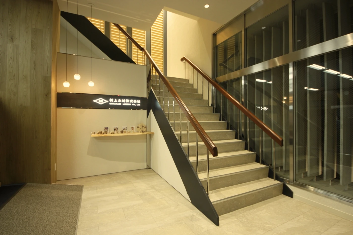 創業125年の歴史を持つ村上木材様の自社ビルの改装PROJECT。なにもかもを今風に刷新するのではなく、伝統を活かしながら現代テイストを盛り込むことで品格を感じられるオフィス空間を演出しました。また、随所に木材を散りばめることで、村上木材様の事業内容を視覚的に伝えながらも、取り扱っている木材の質感や素材の良さをアピール。お越しになる来客者だけではなく、社員の方々にとっても心地よい空間を意識しました。
