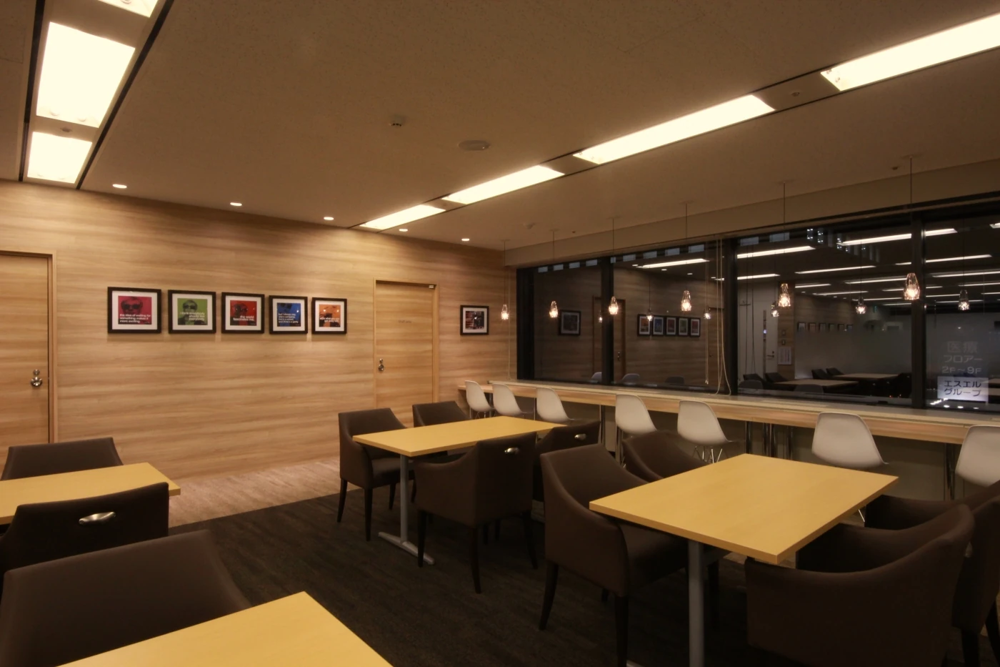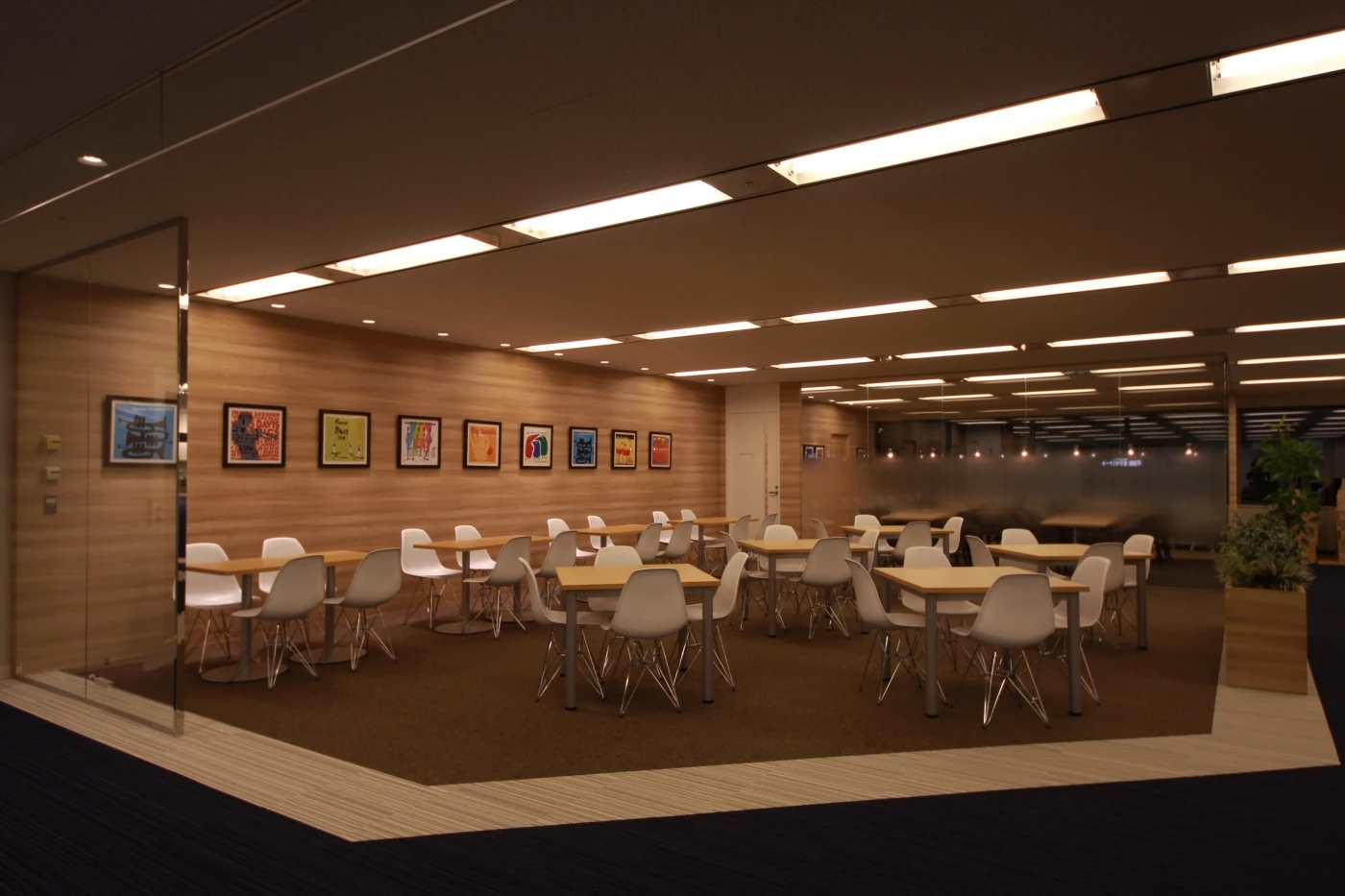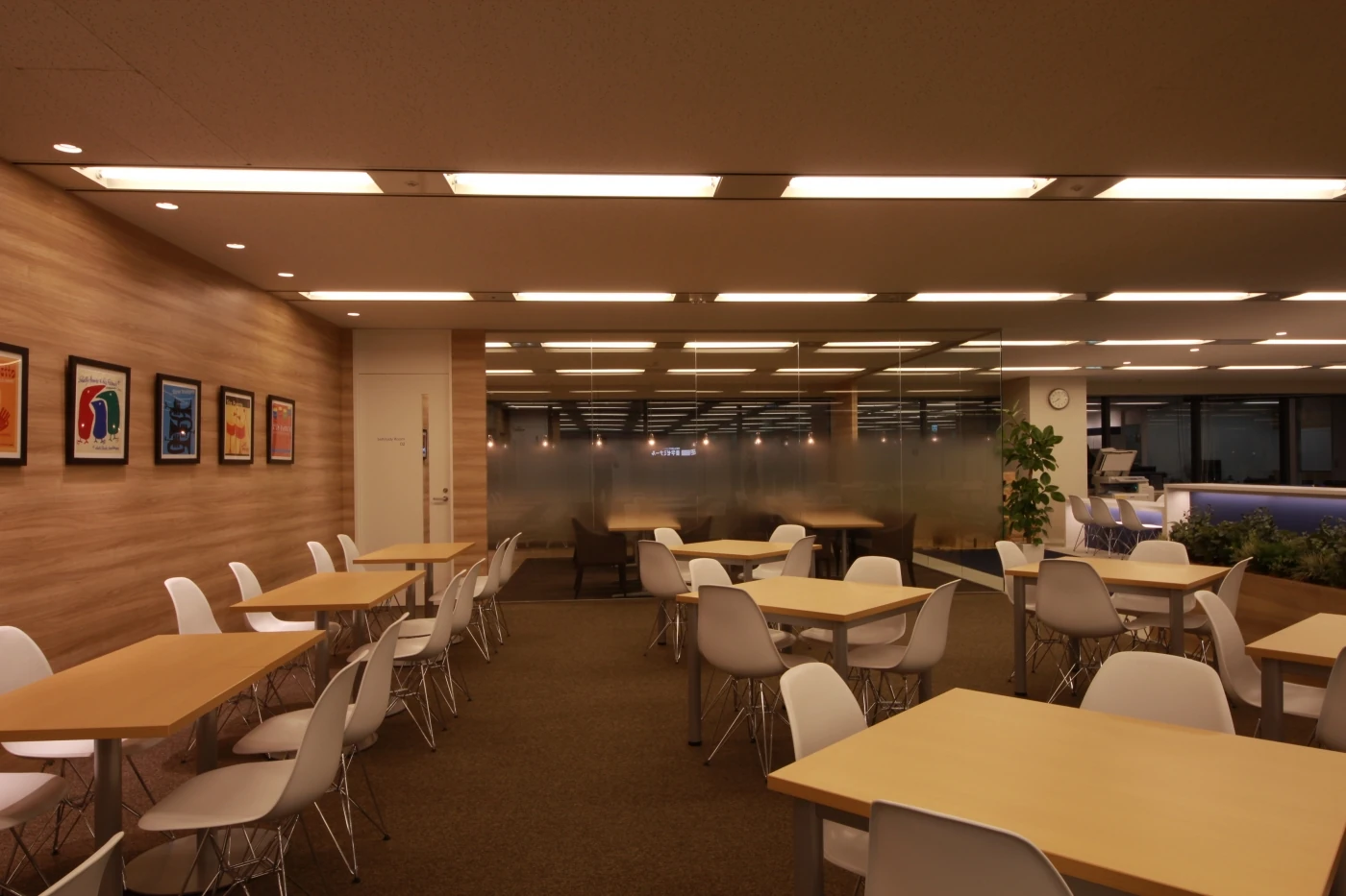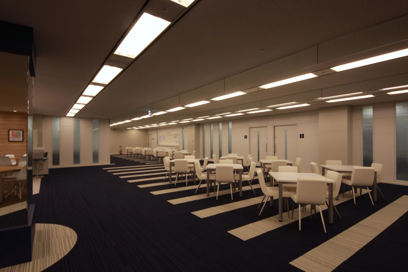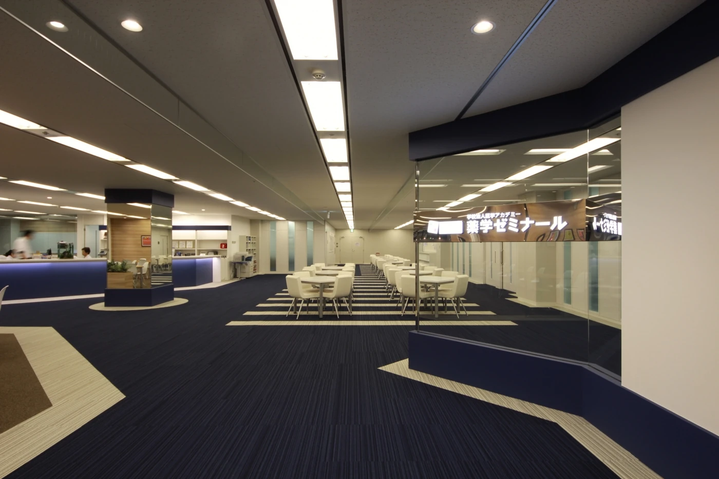床のホワイトラインが印象的な名古屋オフィス。極力間仕切をなくし、ガラスを多用することで、さらに広がりを感じられる開放的な空間に。また、ブルーのスタイリッシュなスペースとカフェ風の暖かいスペースに分かれた学生ホールは、そのときの気持ちに合わせて使い分けることができます。ワンフロアで講師と学生のコミュニケーションが取りやすく、快適な空間となっております。