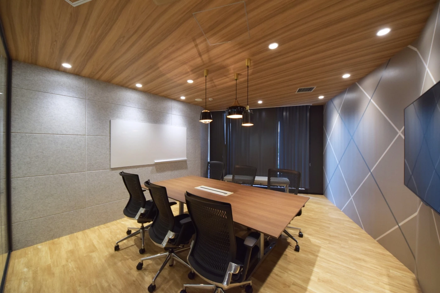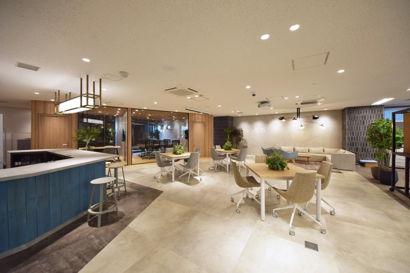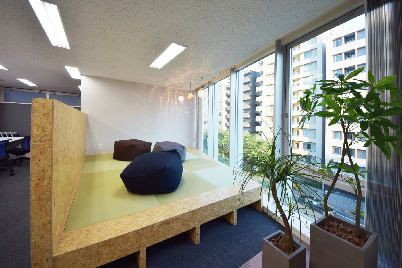 エレベーターホールの自動ドアを開けるとフリースペースがオープンに広がります。中に入って振り返った位置には、コーポレートカラーのブルーを基調とした「AI STAND」(カフェ)を設置し、社員のコミュニケーションの核となるような場所としました。誠実さや明るさを感じられるクールなデザインに仕上げています。一方開発室のフロアには壁面にホワイトボードやオープンミーティングスペース、靴を脱いで上がれる畳スペースを設けることで、社員のヒラメキがいたるところで発生する仕掛けづくりを行いました。
