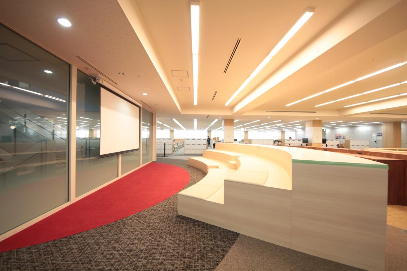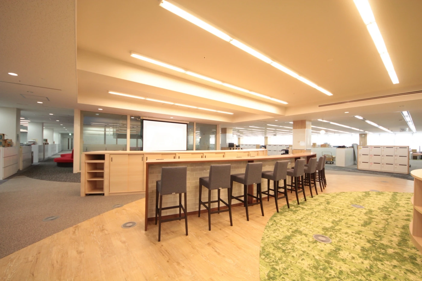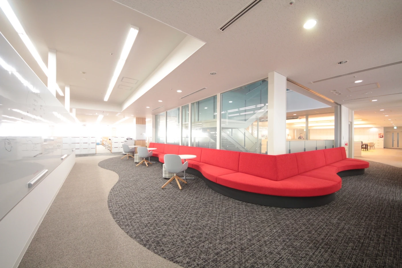 『Crafting the Core』をスローガンに全世界に顧客を持ち、圧倒的な開発力と人材力で新しい未来を切り開くデンソー様の本社開発フロアの改装プロジェクト。ワンフロアに400名、20を超える開発プロジェクトが共存するワークスペースに、相互の智の共有とコミュニケーションの活性化を目指しデザインを進めました。これまで執務と物置になっていた窓側のスペースは部署を横断して続くオープンミーティングエリアにすることで連帯感と解放感をもたらし、フロア中央の上下階を繋ぐ階段付近には気軽に座れるベンチスペースを配することで、他フロアからの来訪者と気軽に情報交換ができる環境を整えました。執務スペース全体をコミュニケーションエリアで囲む設計としたことで、開発者たちが自席を離れ、プロジェクトを越えてコミュニケーションする姿が多く見られるようになりました。