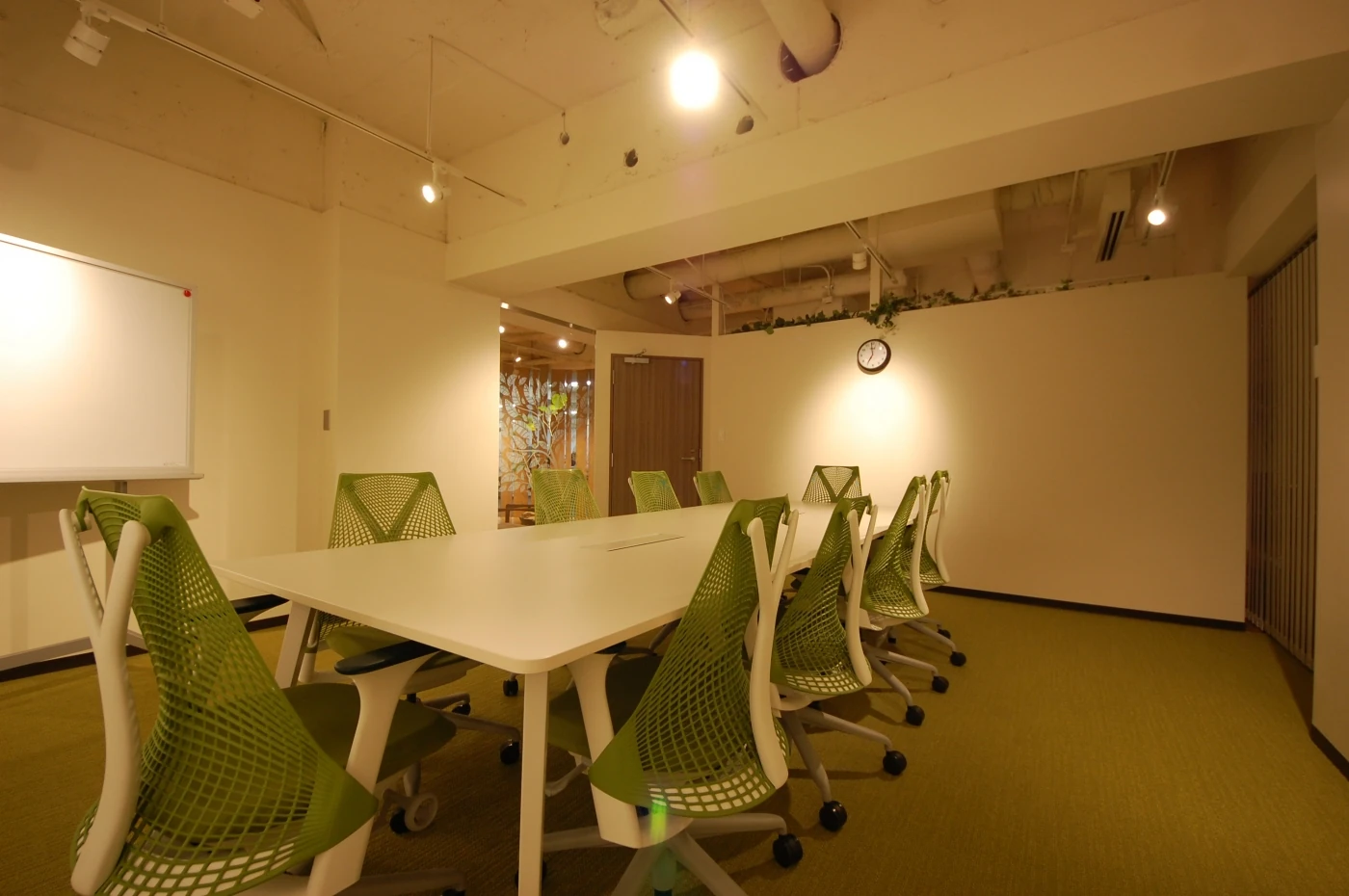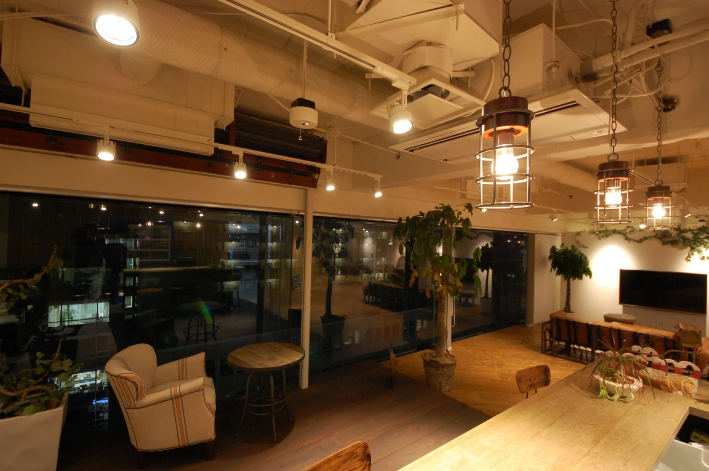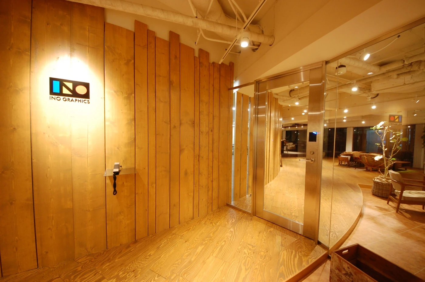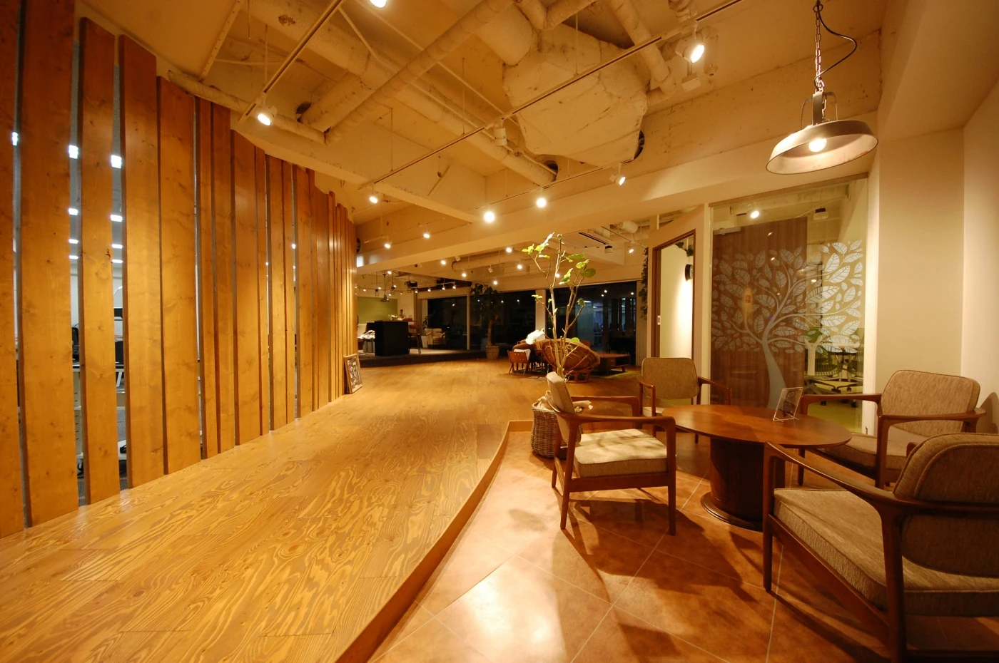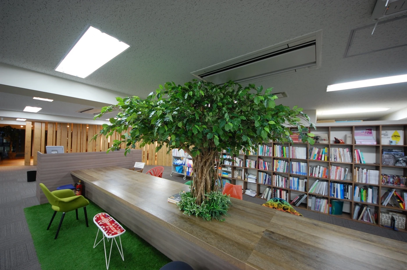 オフィスだけどオフィスじゃない。家族で団らんするイメージで空間を作りました。エントランスはお家の塀。塗装した数種類の幅のパイン材で作成しました。リフレッシュエリアは庭をイメージ。社員の皆様がOFFにもなれるリフレッシュ兼お仕事スペースとして設定しました。天井は在来の天井を解体し白く塗装。床も2種類の床材を使い分け、広々とした味のあるエリアに。ワークスペースには象徴的な木の生えたビッグテーブル。出力したものを広げたり、2名で横並びで打ち合わせしたり様々な用途で使えます。そのテーブル横には大きな書棚があり、書斎でもあり、皆様の集まるスペースです。