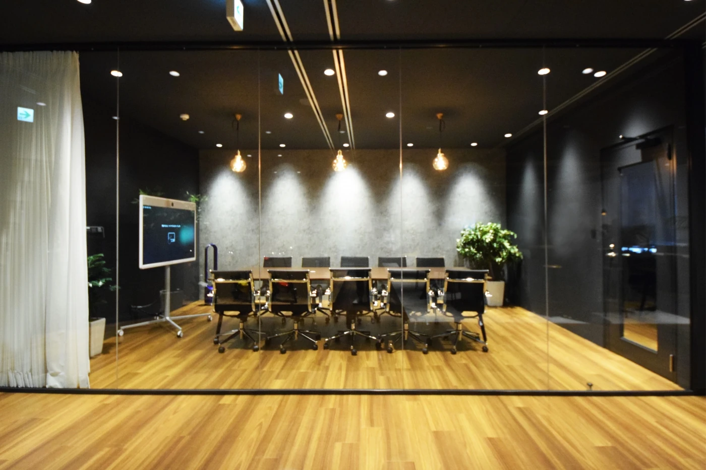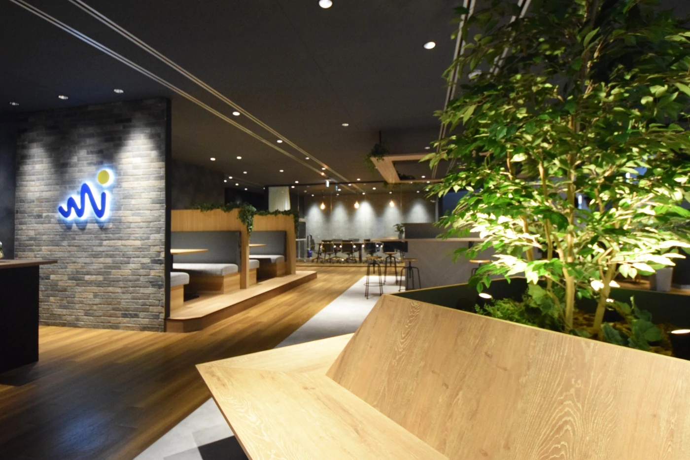 1Fで外に面している空間でしたので、通行する人や他の階に訪れる方の目線も考えてデザインしました。照度を落とし落ち着いた雰囲気にする一方、ブラインドの上げ下げで外光を調整することにより空間の表情が180°様変わりします。様々な素材を用いて洗練された雰囲気を出しつつ、グリーンを多用することでナチュラルさも演出しております。フリースペースでは社員様が気分を変えて仕事ができるように様々なスポットを用意いたしました。来社されるお客様や働かれている社員様によっても雰囲気が変わる多様な表情を持ったオフィスになりました。