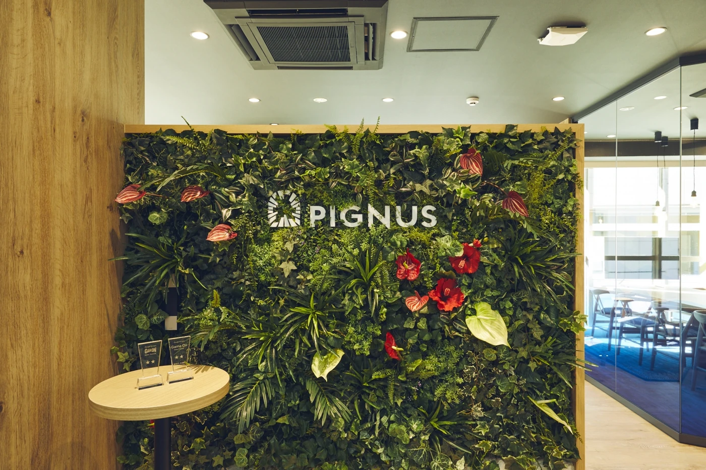 エントランス正面のグリーンウォールの中にハイビスカスを散りばめることで、南国らしさを際立たせています。また、壁面や家具に青色を入れることでオフィス全体で海を感じられるようにしつつ、会議室の壁面をガラスにすることで抜け感を演出し、青いグラデーションシートで波の動きを表現しました。床や壁面には薄めの木目を選定し、爽やかな空間に落ち着きと温もりをもたらしています。建物の造り上、窓面が多く陽当たりも良いのでその特性を活かせたのも南国らしさを強調するアクセントになり、非常に居心地の良い空間に仕上がりました。
