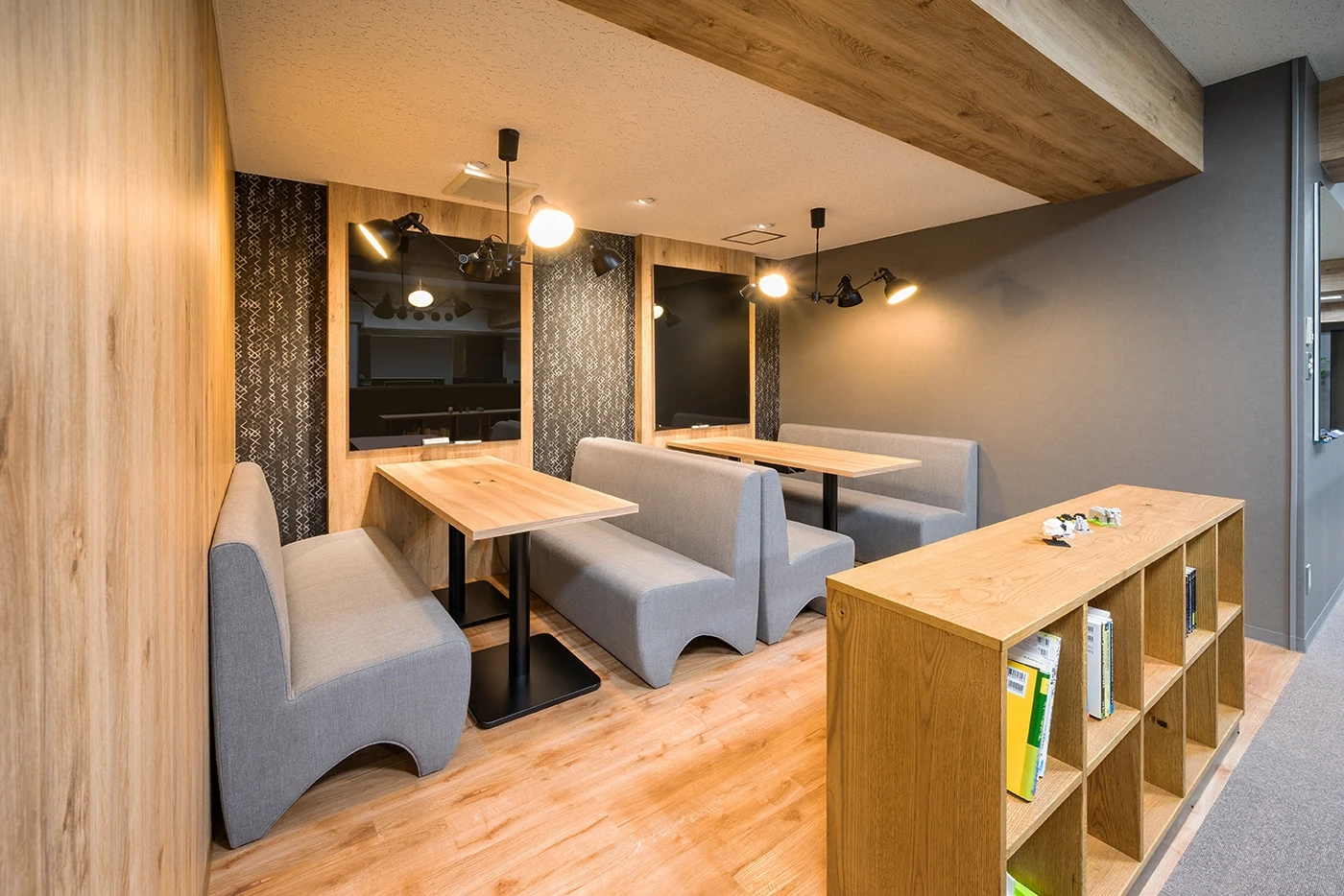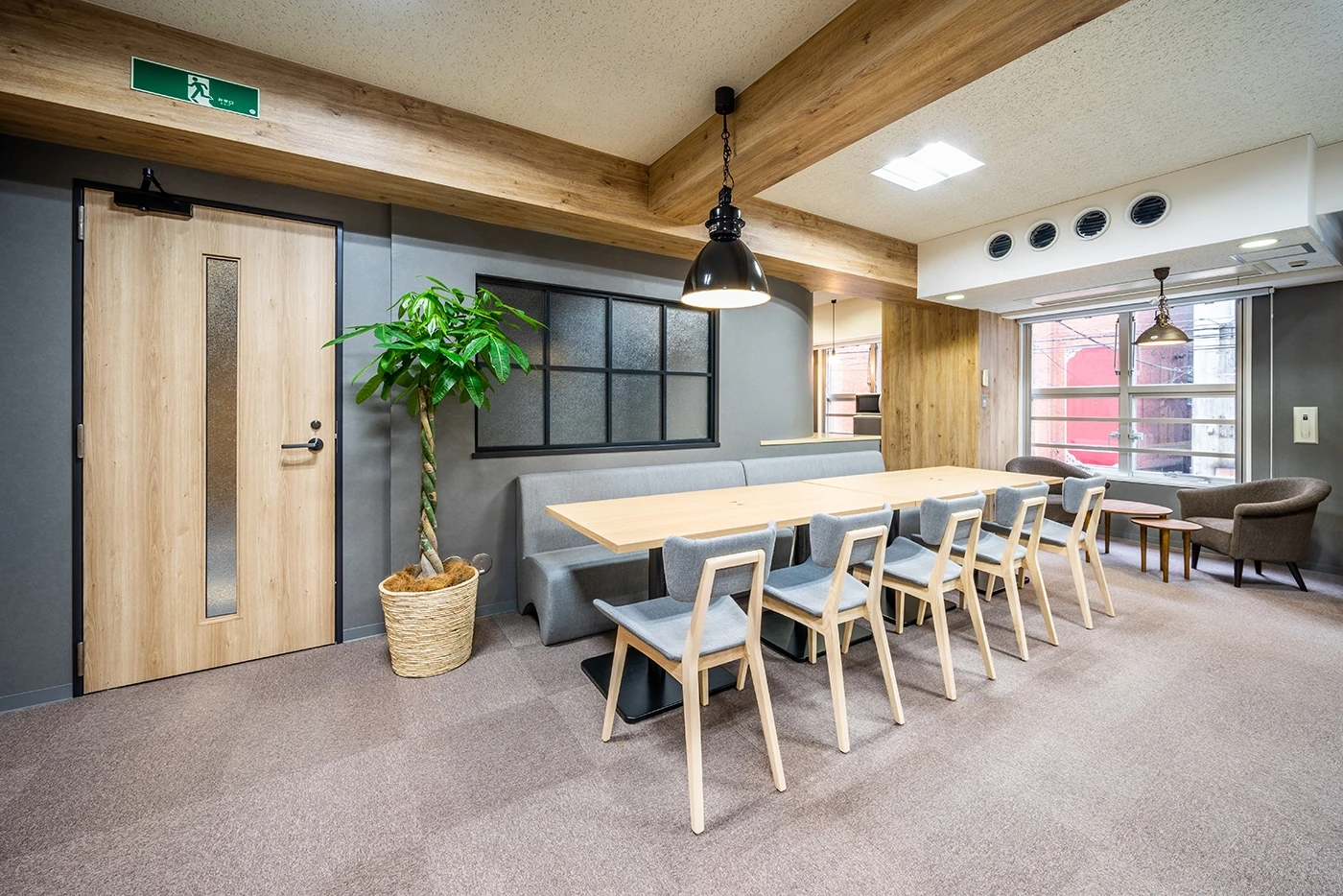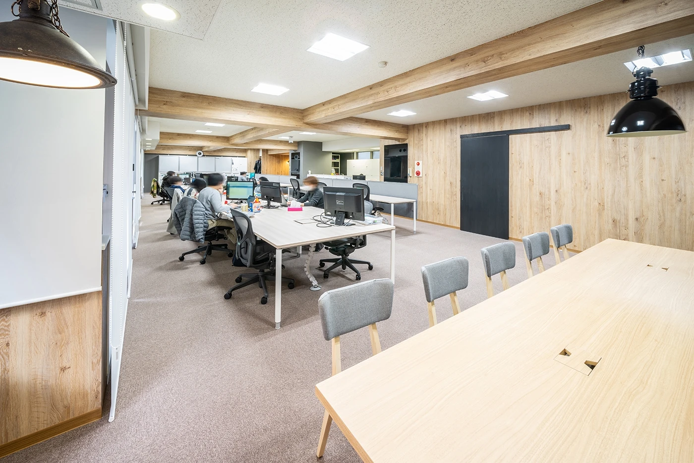 スタッフの皆さまのモチベーションをより高い次元に高めていくべく、クリエイティブを刺激するデザインや仕掛け(場)を空間に盛り込みました。事務所内の壁はオフィス感をなくすべく白色から木目やグレーに変更し、天井から出っ張っていた梁もあえて目立たせるように木目クロスを貼って空間のアクセントにしました。限られたスペースを無駄なく有効に活用し、プロジェクトの大小にも組替えて対応できるワークスペース、色をテーマに様々に表現したミーティングルームと、変化に富んだCO-LABOオフィスです。