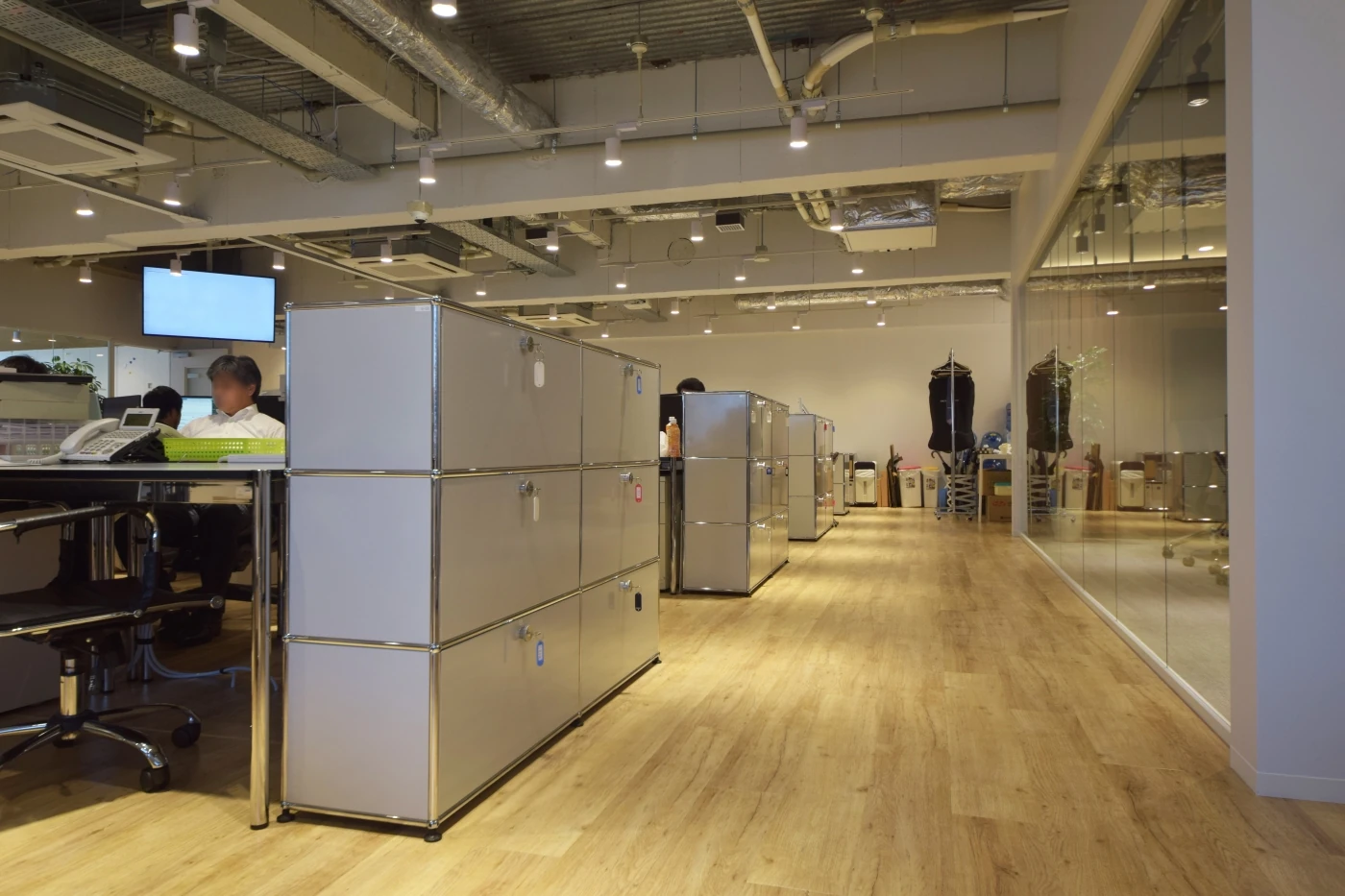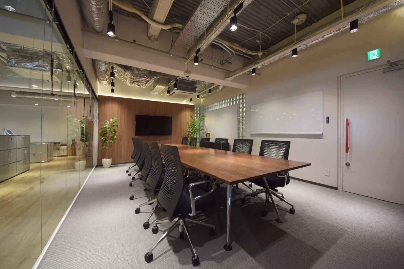 グループ会社様と統合されるタイミングでお手伝いをさせて頂きました。オフィスは「SENQ六本木」というリノベーション済みの物件で、床はすべて木目塩ビタイル、天井はスケルトン仕上でした。エントランスはコーポレートカラーである赤が際立つように白壁とガラスブロックを採用しました。大会議室を中央に配置し、ガラス壁で開放感を演出しております。家具も全体のデザインに合うように選定頂き、シンプルかつスタイリッシュな統一感のあるオフィスが完成しました。