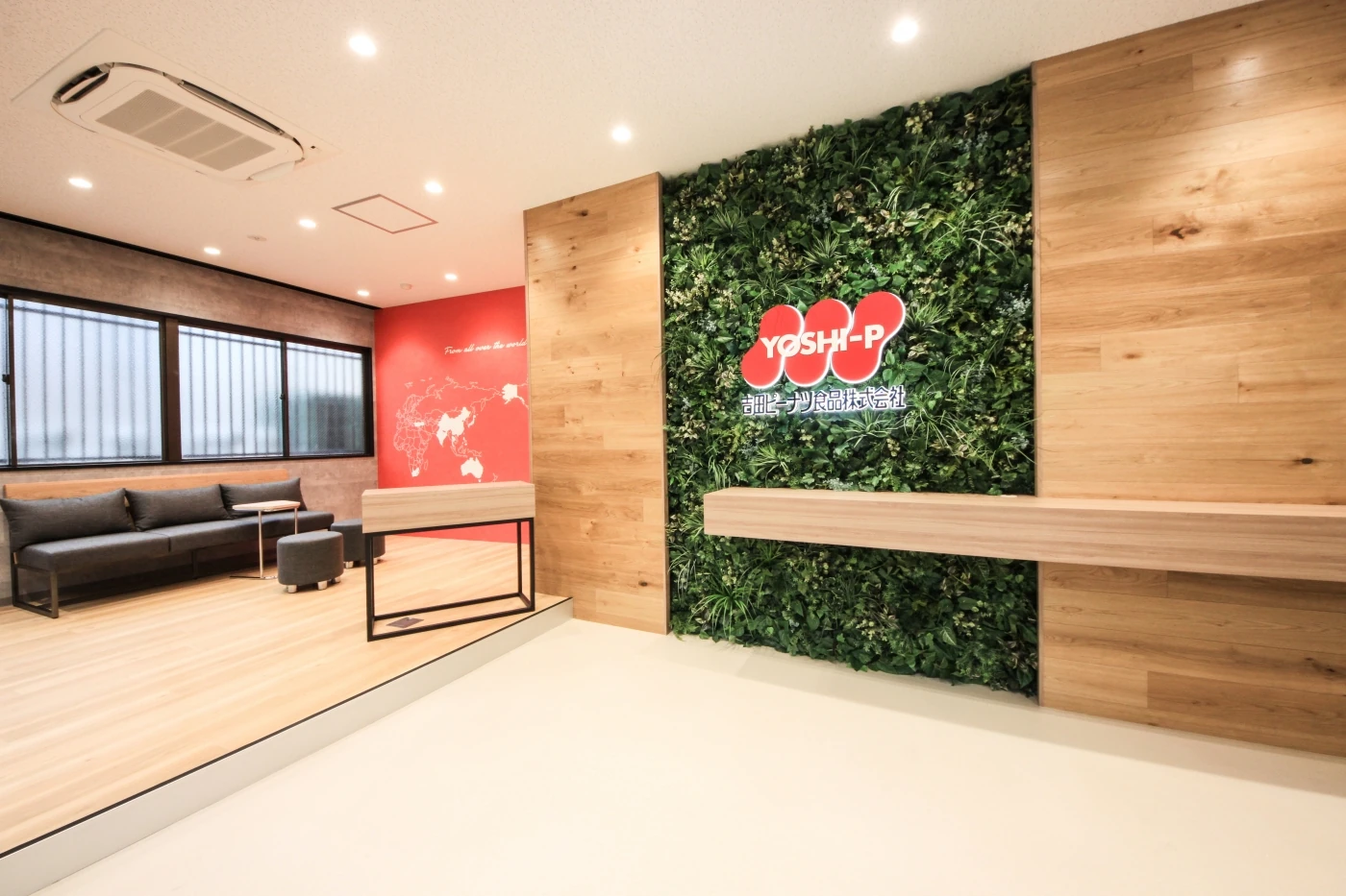 神戸にある本社自社ビルの全体改装(1F/2F)のお手伝いをさせていただきました。1Fのエントランスは、吉田ピーナツ食品様を象徴する赤色と、自然を感じられるグリーンや木目をうまく調和させ、コーポレートカラーと取り扱い商品のイメージが融合したブランディングを感じられる空間になりました。2Fの執務エリアには、機能性を重視した動線作りを取りながらも、社内打合せ用としてピーナツをかたどった造作テーブルを設けました。スタッフ様にも自社のブランドを感じてもらうことができ、愛着心の生まれるオフィスとなっております。