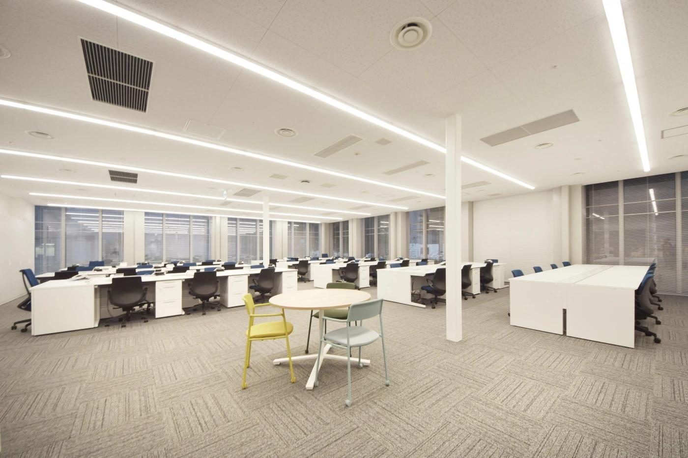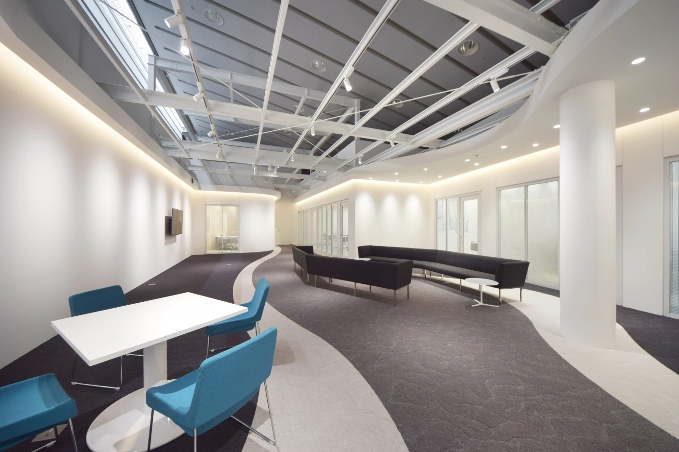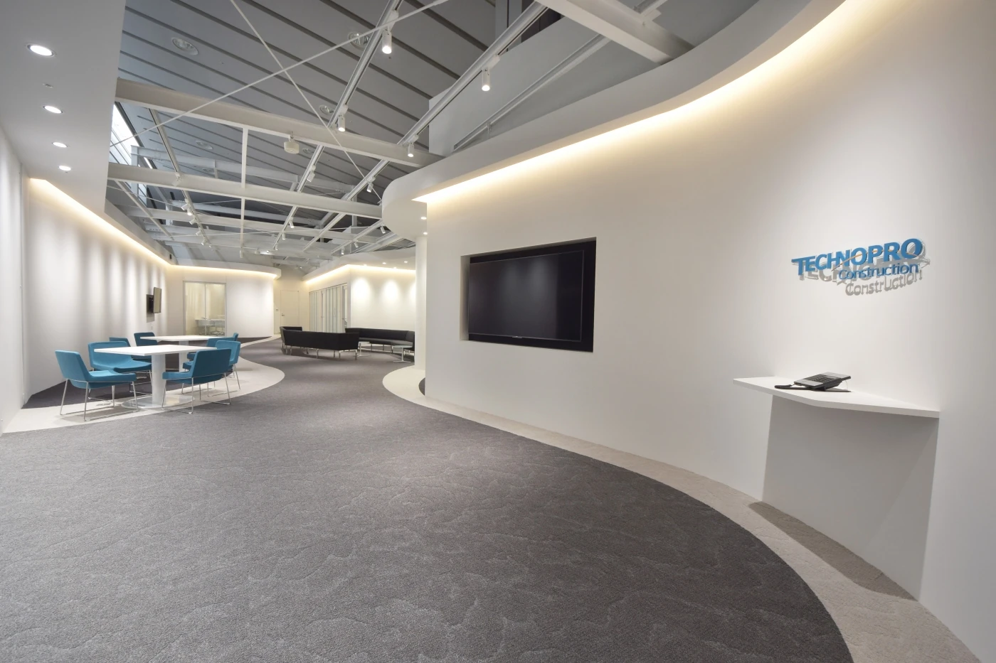 建設現場に幅広く人材を派遣し、日本の建設業界を支えるテクノプロ・コンストラクション様。鉄骨や白塗装壁、ガラス等の無機質な素材で流線形を形成したデザインにより、建築物という無機物が、そこに行き交う人々の流れや、街の歴史という時の流れという有機的なものを形作っていく事を表現しています。ファサードに設置した大型の発光サインや会議室の壁面アート等が彩りを添え、テクノプロ様の新たな舞台に相応しいオフィスが完成しました。