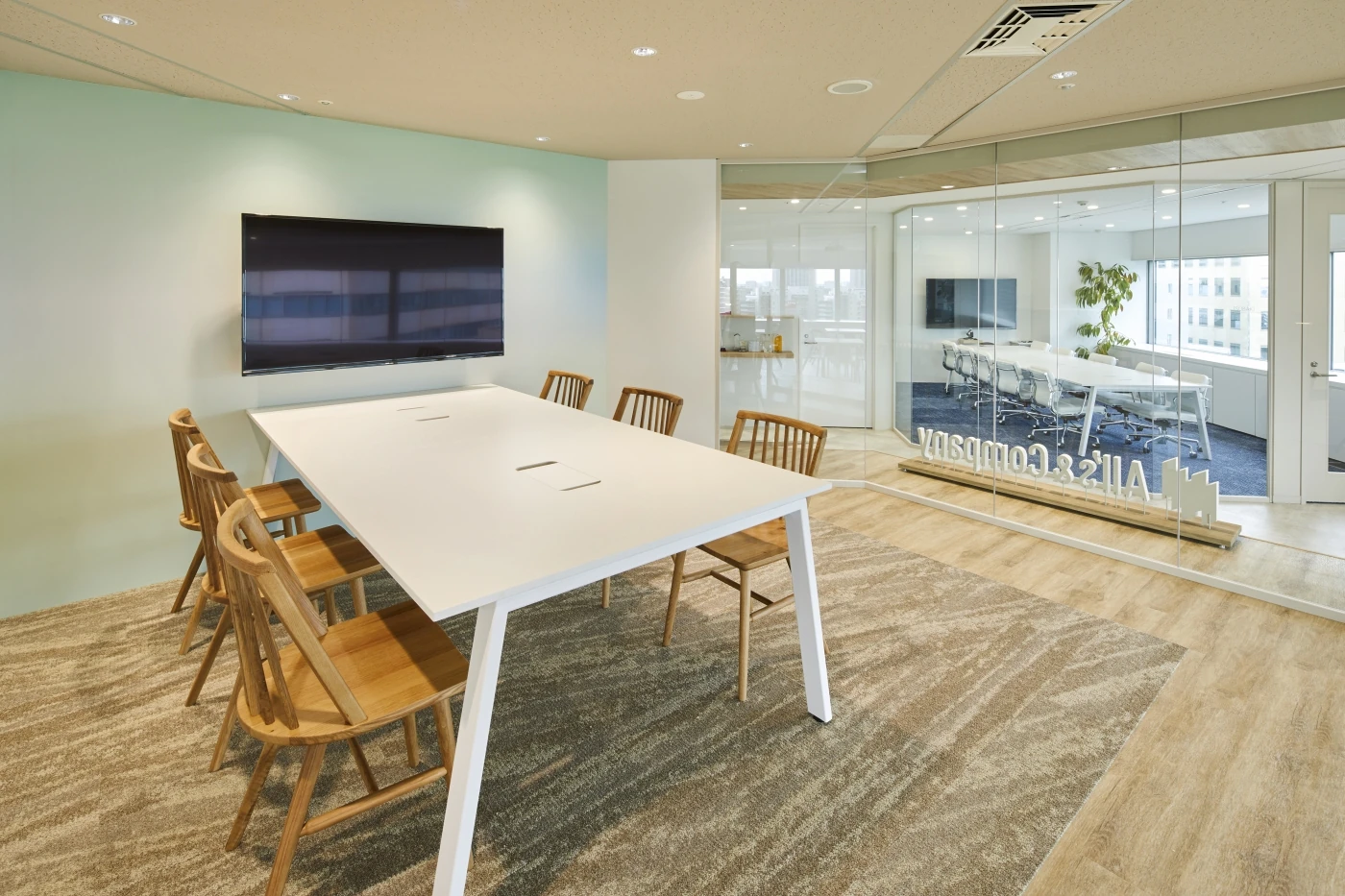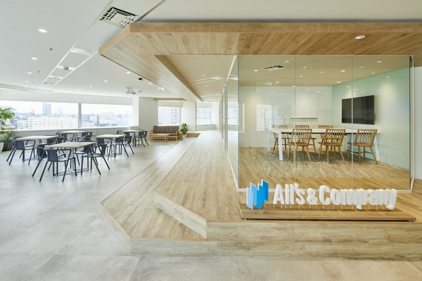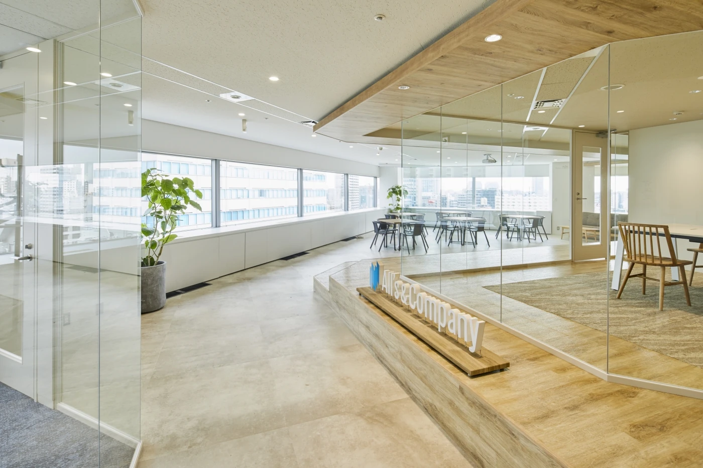 ビルの最上階という眺望を生かしたデザイン・レイアウト設計をしました。エントランスに入った時に目に入る象徴的な置き型サインは、可動式にすることで写真撮影等でも使用できるよう工夫しました。会議室は床を上げ、天井を一部下げることにより空間に変化を持たせテラス感を演出しています。来客スペースは大きく斜めにガラスの壁を設けて開放感を演出し、セミナースペースとしても活用できる空間です。全体的に木目やガラスを用いることで明るい開放的な空間に仕上がりました。また、会社で飼っている看板猫『まる美』ちゃんが遊べる猫用の造作階段は、一部ガラスを使用し下から肉球が見えるような仕掛けを作るなど、お客様と一緒にアイディアを出し合ったことで細部までこだわりあふれる素敵なオフィスに仕上がりました。
