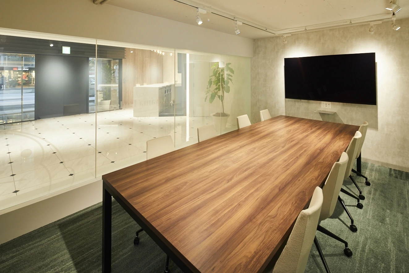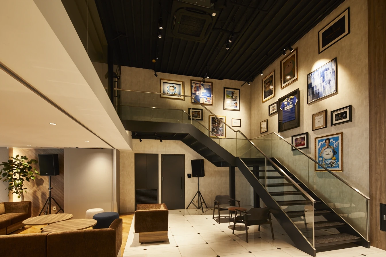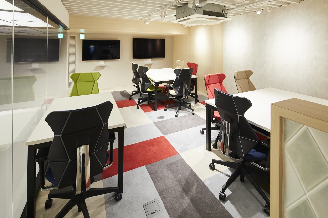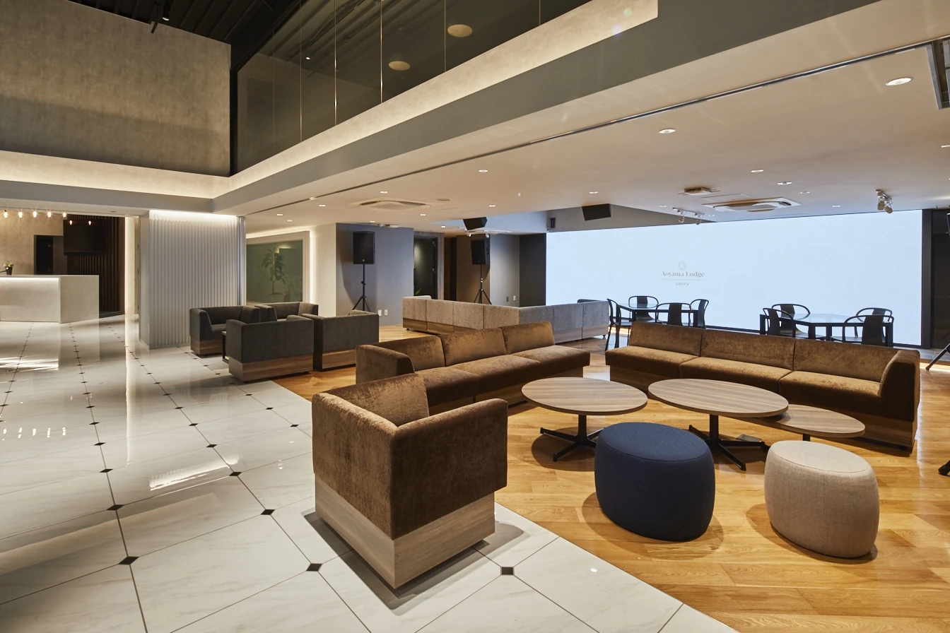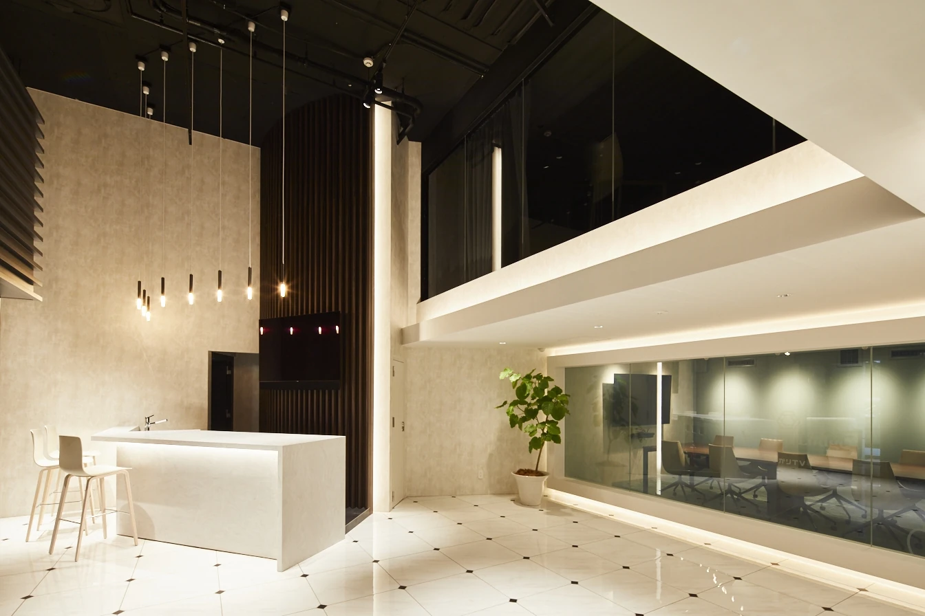 オフィス兼ラウンジの開設にあたり「情報発信基地」であり「ひかりTV」としてのブランドが体感できる空間というご要望をいただき、空間のデザインだけでなくブランディングに関わるところまで提案させていただきました。エントランスでは天井の高さを生かしたスターダストのようなペンダントライトと、白で統一した上品なカウンターがお客様をお出迎えします。中に足を踏み入れると、まず飛び込んでくるのが特大の約7mのLEDパネル。象徴的な存在になるよう、アイキャスト様からのご要望を実現しました。パネルを囲む上質な家具たちは、一つ一つ打合せを重ねて選定したこだわりの家具となっており、情報交換の場にふさわしいしつらえとなっています。2階のワークスペースは1階の雰囲気とは異なり、赤、白、灰色、水色のタイルカーペットを乱張りしポップな空間に。働きやすさを考え照度を明るくしています。「ひかりTV(Aoyama Lodge)」のブランド力を全面的に体感できる空間が完成しました。
