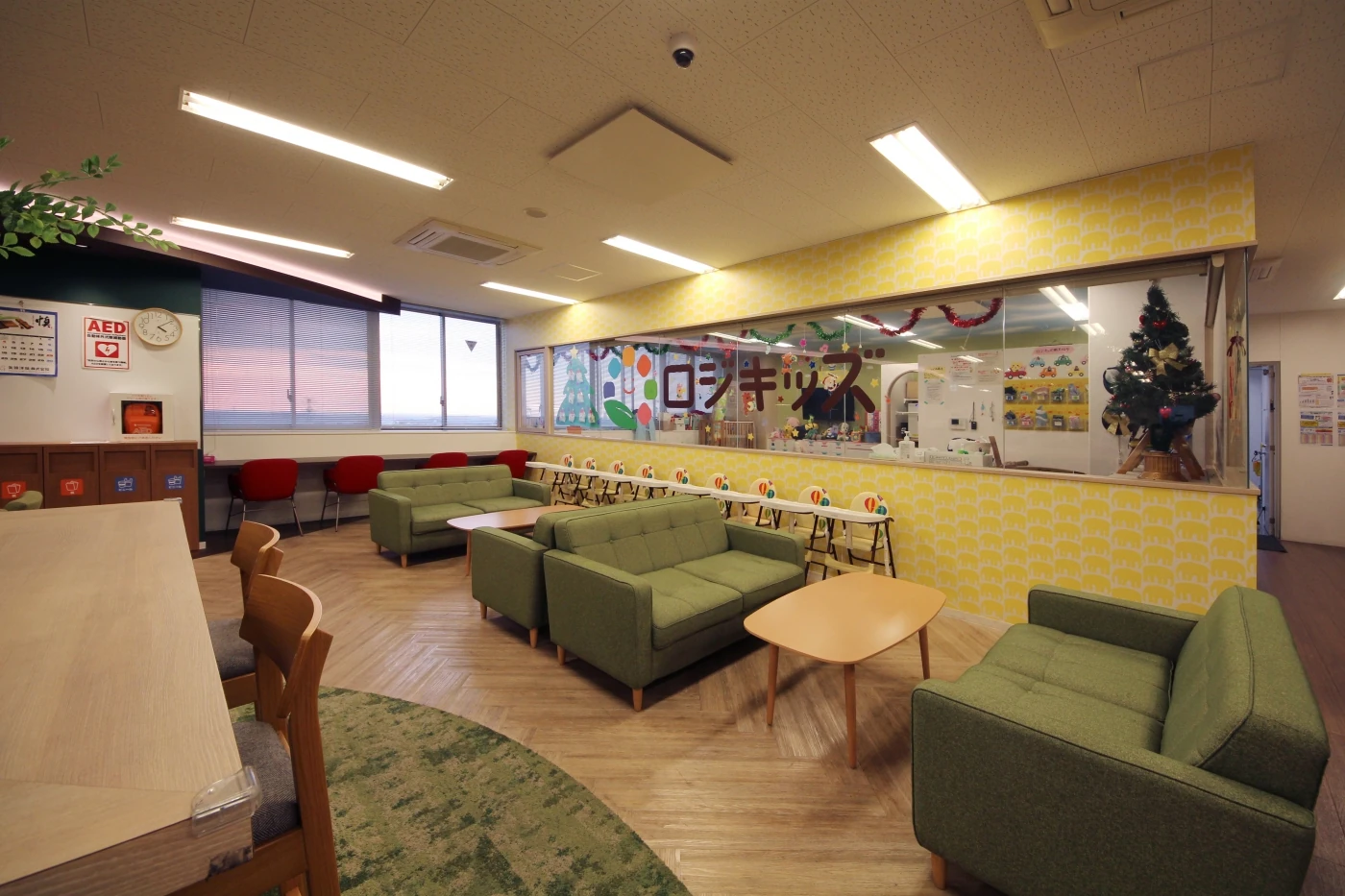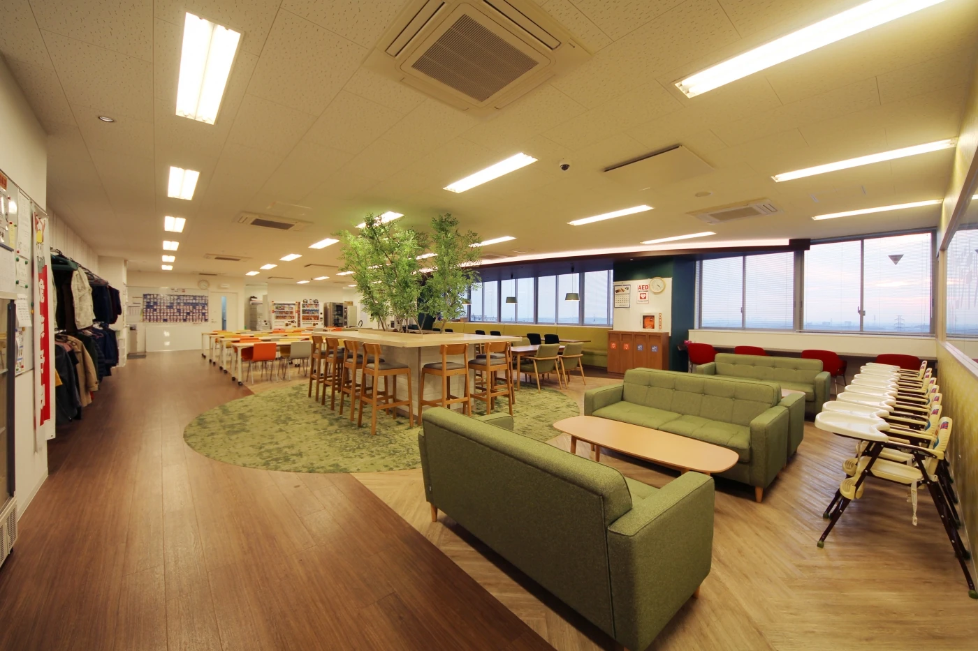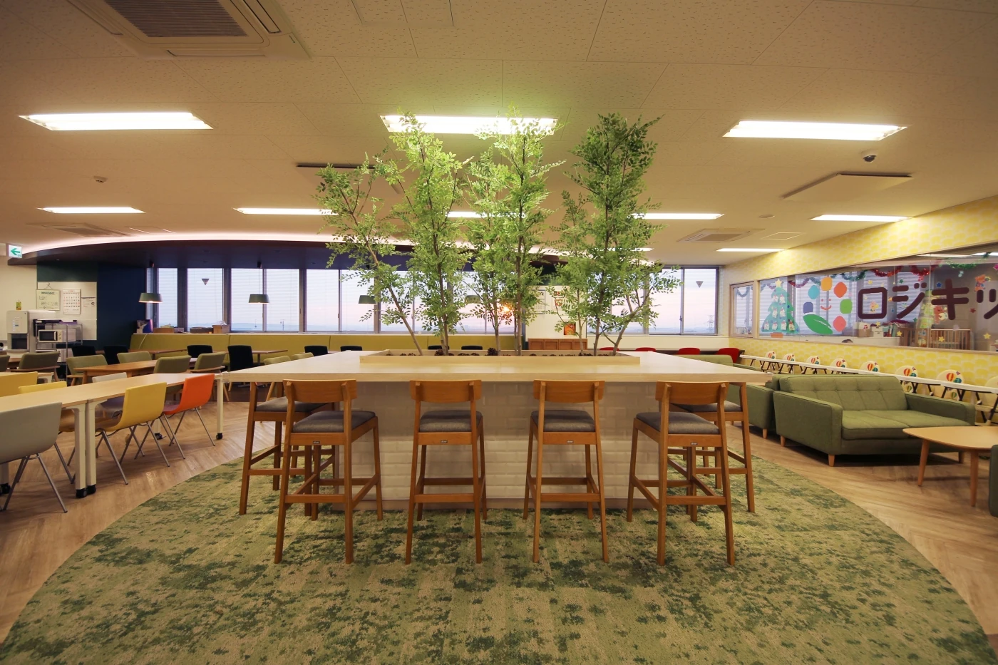 物流センターで働くスタッフの皆さまが、いつも明るく楽しく安心して働いてもらえるよう「とことんゆったりとした時間を過ごす場所」をコンセプトに空間をデザインしました。物流倉庫という無機質な環境で一日を過ごす中で、休憩の時間は心と体を休める大切な時間です。ひとりでもグループでも、その日の気分によって過ごし方を変えられるファニチャーバリエーション、子育てママに優しいキッズスペースの確保など、働くスタッフのことを一番に考えたリフレッシュエリアになりました。