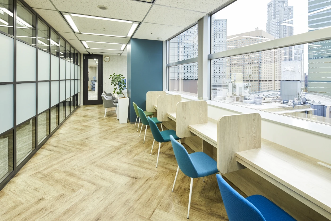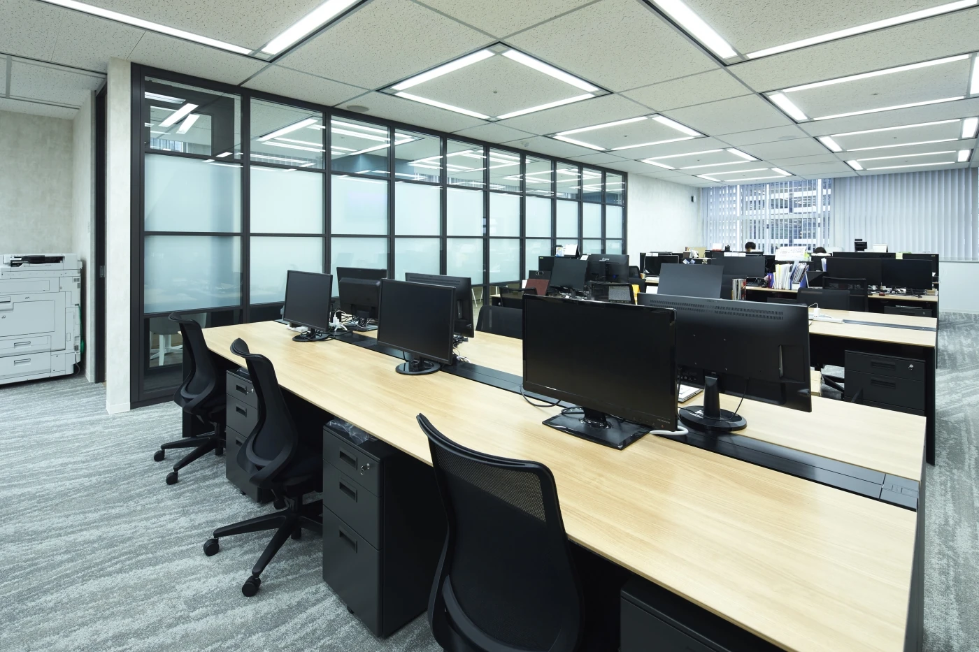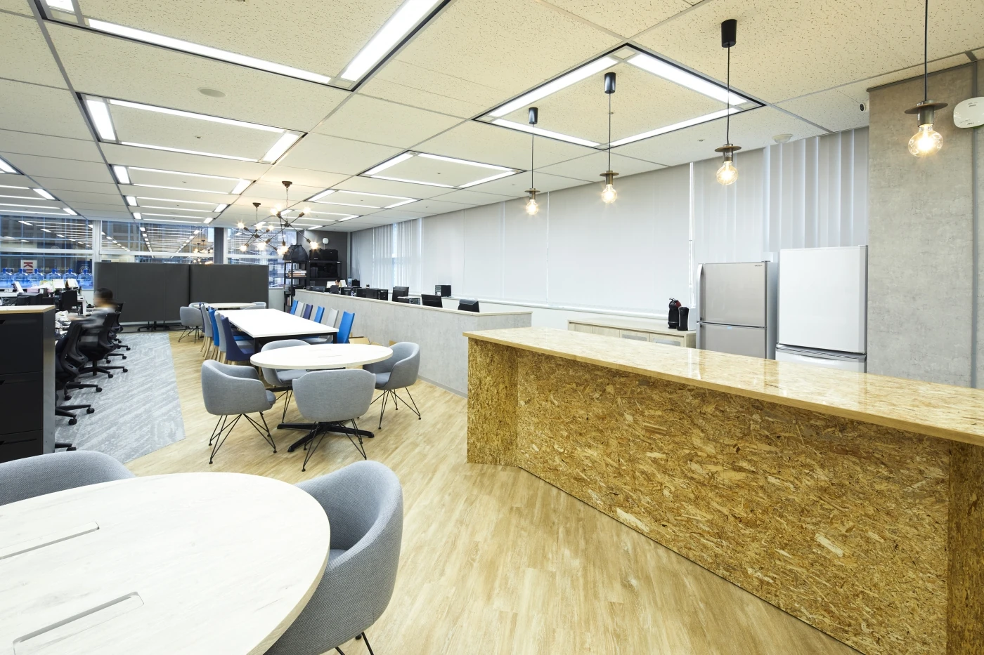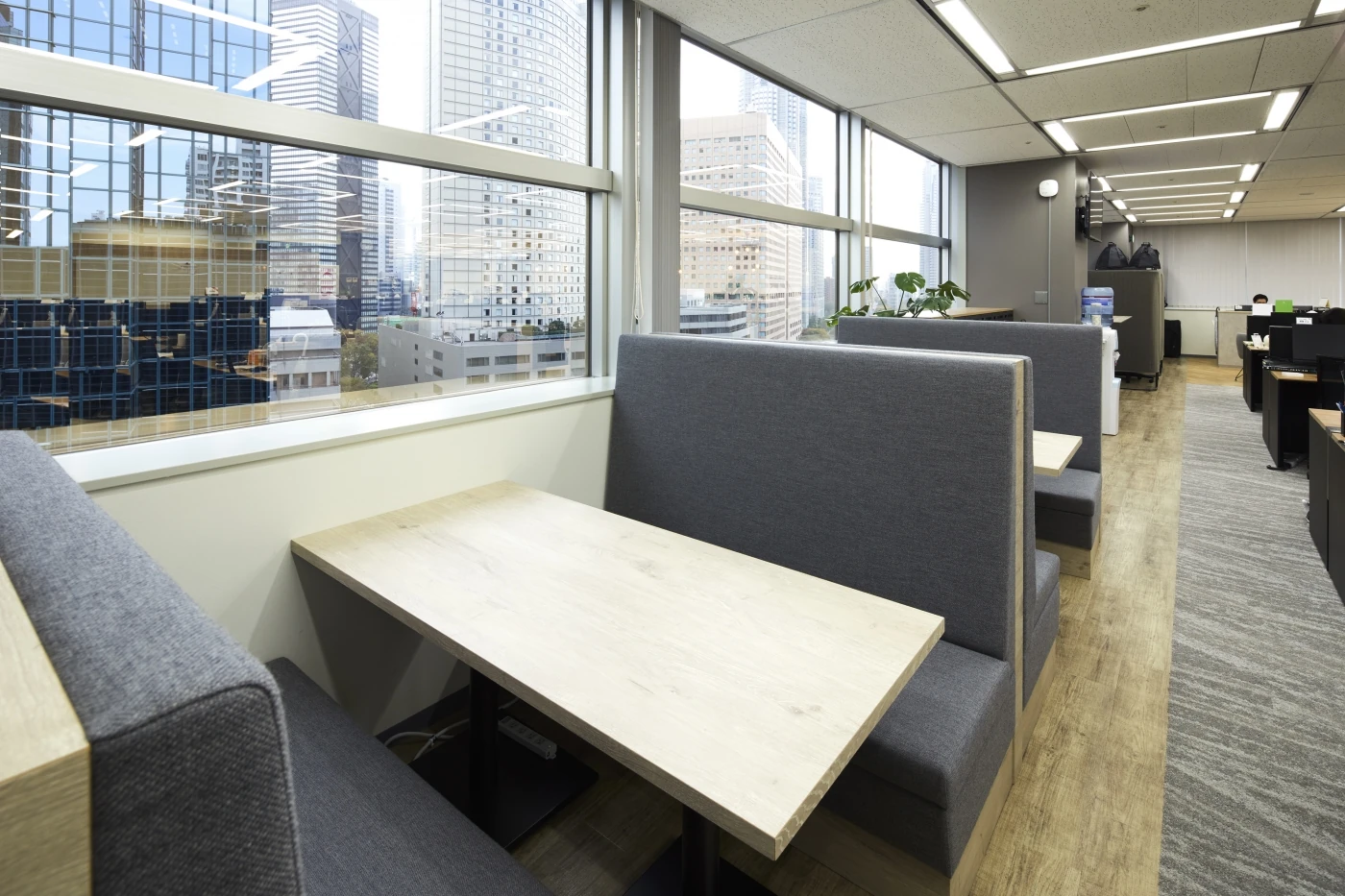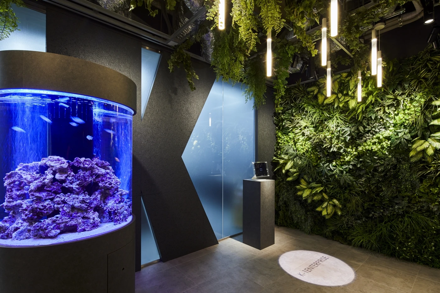 ワークスペースの増床と改装のお手伝いをさせていただきました。エントランスに何か面白い仕掛けが欲しい!というご要望をいただき、お客様とアイディアを出しながらつくりあげました。「K-1」のロゴはブラックの木毛セメントであしらい、グリーンは壁面から天井までふんだんに施しました。ひときわ目立つ2つの大きな水槽では可愛らしい魚が目を引く、非常に印象的なエントランスとなりました。ワークスペースは、社員間のコミュニケーションを活性化させるようフリースペースを多く設けました。新宿の景色を一望できる大きな窓のある場所はランチもできるフリースペースにするなど、今までのオフィスになかった新鮮で快適な空間となりました。