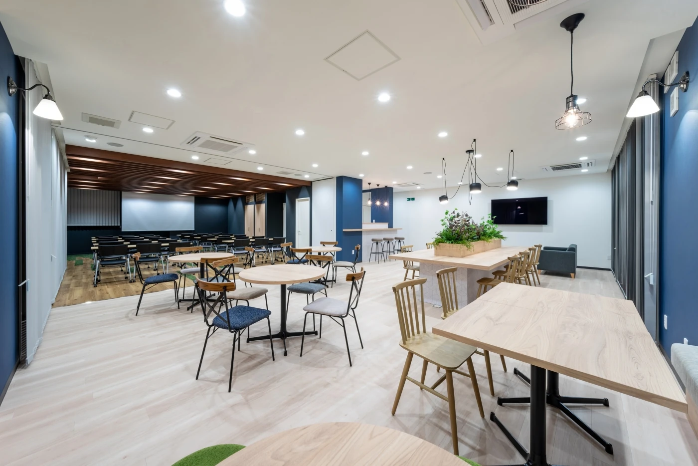 宇都宮市で一番のデザイナーズオフィスを作りたいというご要望から、エントランスの一部を特産物である大谷石で仕上げ、来社されたお客様にも喜んでいただける開放的で品のあるオフィスを作りました。1Fは会議室・セミナールーム・リフレッシュスペース、2Fはワークスペースとゾーニングし、各エリアごとにネーミングとグラフィックデザインをいたしました。どのエリアも開放感と温かみが出るよう什器の選定もさせていただき、内装仕様だけではなく全体に見どころ満載の素晴らしいオフィスとなりました。