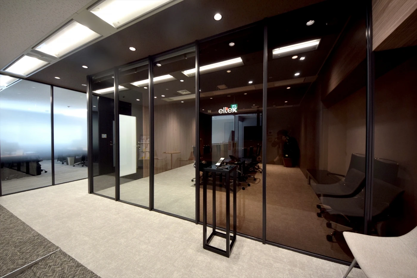 横浜に本社をもつエルテックス様。社員の皆様の働きやすさを実現するために、東京にサテライトオフィスを開設しました。重厚さと奥行きを感じられるエントランス、ゆとりをもった執務室、外出中の社員の方が気軽に立ち寄り働けるフリースペースを設けました。ガラスの色付きフィルムやタイルなどを随所に取り入れ、格式高さとカジュアルさが共存する空間となりました。フリースペースの家具は造作家具を基本とし、機能性だけでなくオリジナリティにあふれています。来る人に驚きと居心地の良さを提供できるデザイナーズオフィスとなりました。