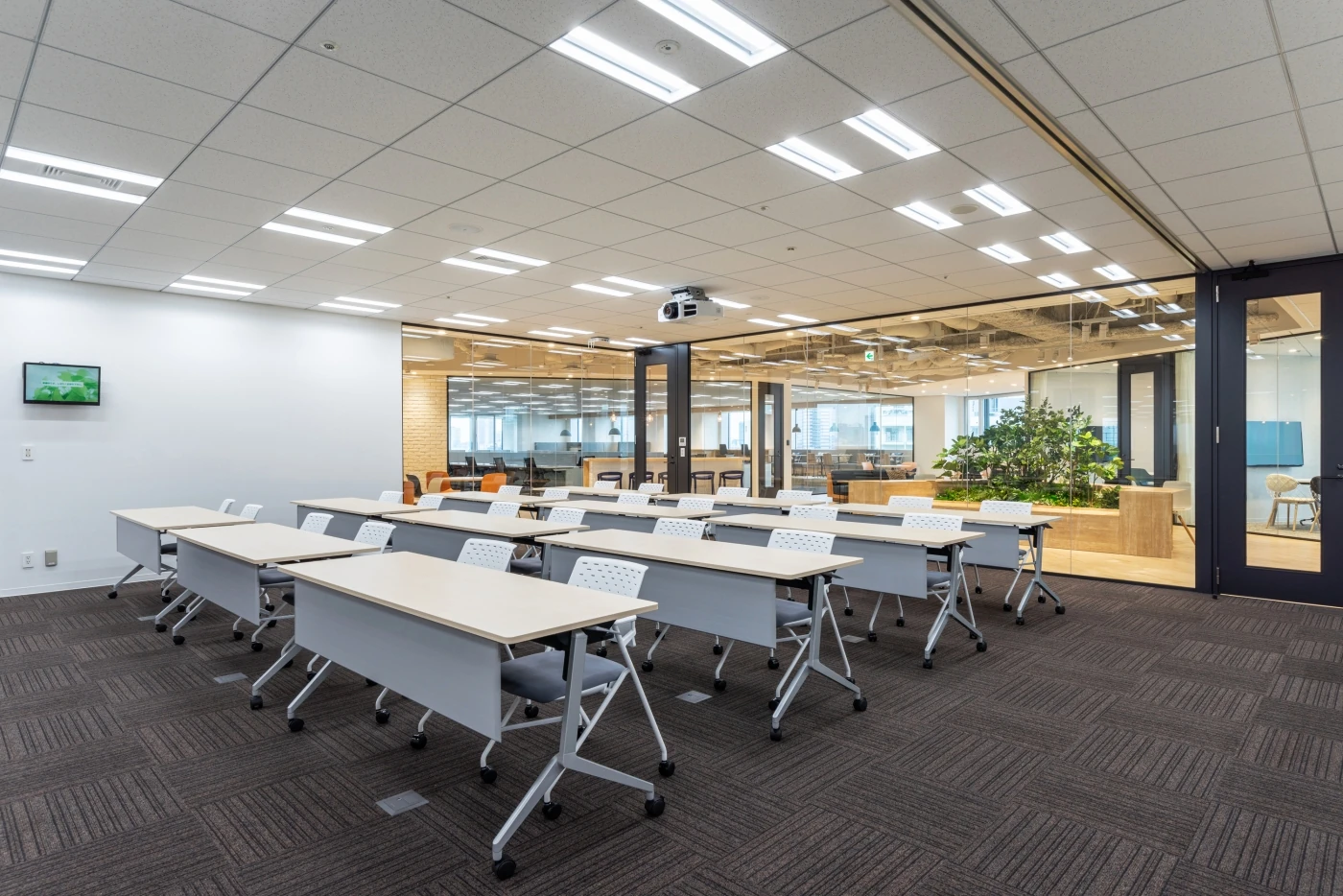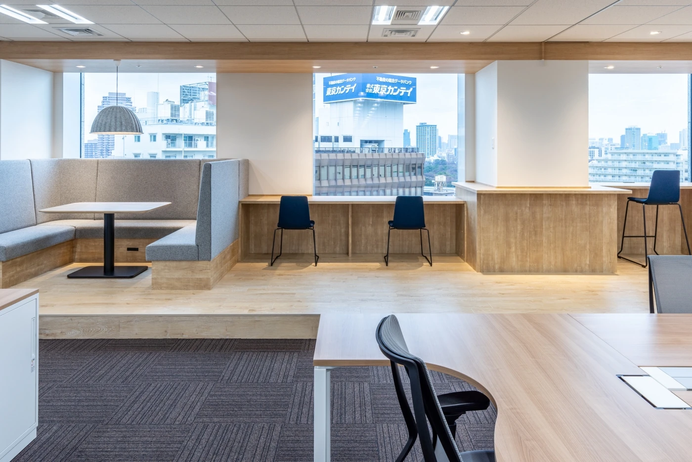 高層階の眺望を最大限に生かした空間となりました。エレベーターホールに到着すると大きいロゴサインが目に留まり、オフィスに一歩足を踏み入れると開放感と温かみが感じられる仕上がりです。セミナーなど外部の方を多く招くため、来社する皆様にも配慮した休憩スペースや親しみやすさが持てる空間を心掛けました。また執務室は外からも社員様が働く姿が見えるようガラス張りにし、風通しの良い場所となっています。社員様の座るチェアから来社したお客様を招き入れる会議室のテーブルやチェアまで細かく一つ一つ実際に体感いただきながら、こだわり貫いた家具でコーディネートされている点も見所の一つです。