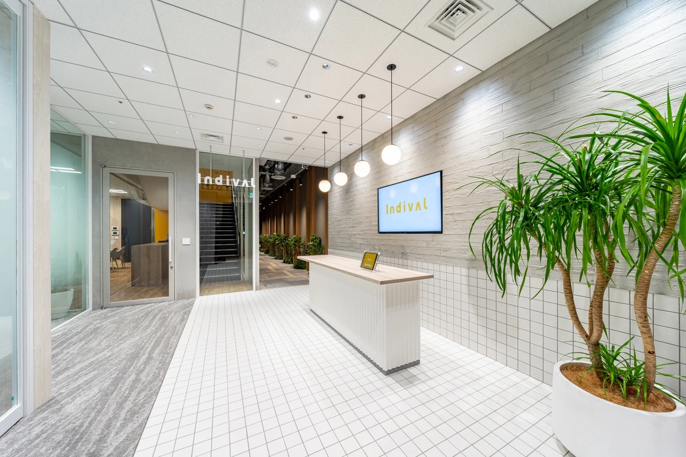 「はたらく」ということの価値を高める事業を展開しているインディバル社。新オフィスプロジェクトスタート時のゴールは、さらなる「主体的」なチームを実現することでした。社内からプロジェクトメンバーが招集され、インタビューやワークショップからのプログラミング業務をプロセスとした1年間のプロジェクトとなりました。新築ビルの1,2Fという物件の特徴を生かし、テナント内階段を軸としたレイアウトを提案しました。風通しの良い社風を表現するのに、エントランスは奥行きと広がりを感じるよう工夫しました。全体を見渡せるリフレッシュエリア兼多目的スペースは、チームビルドにつながる社内イベントで活用されています。