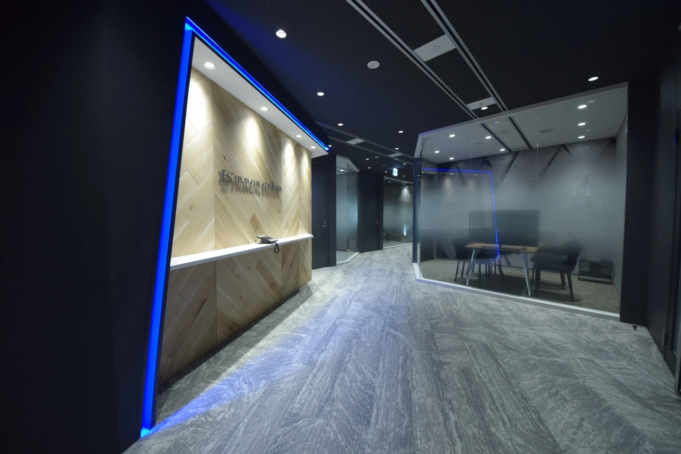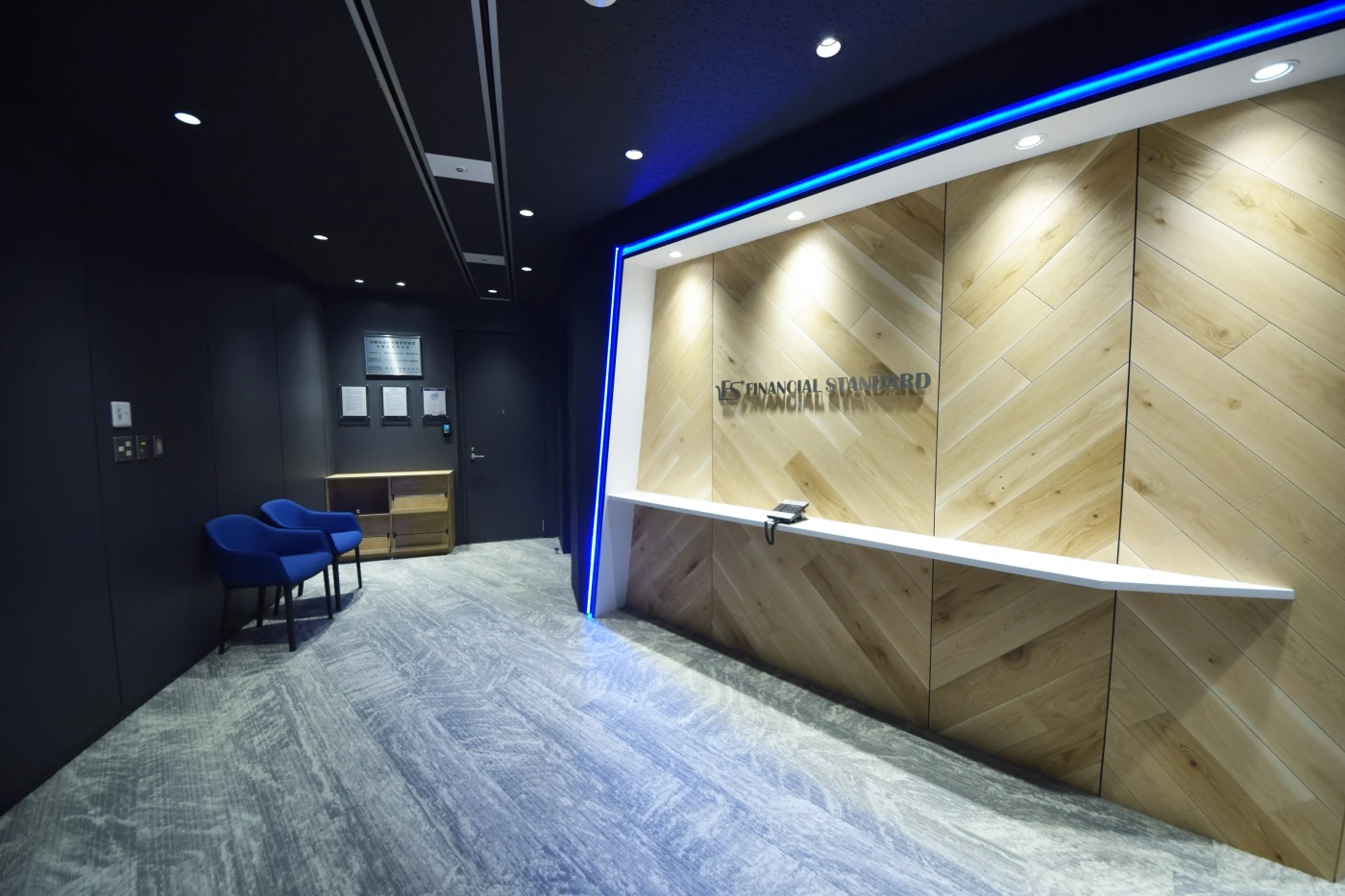 東京本社に続き、大阪支店の開設をお手伝いさせていただきました。東京本社同様に「温かみ」「信頼感」「スタイリッシュ」をキーワードに設計。新しいエッセンスとしてエントランス正面に木パネルを施し、来店された方々に落ち着きを与えられるよう工夫しました。また、随所にコーポレートカラーのブルーを採用し、VIを強調しております。