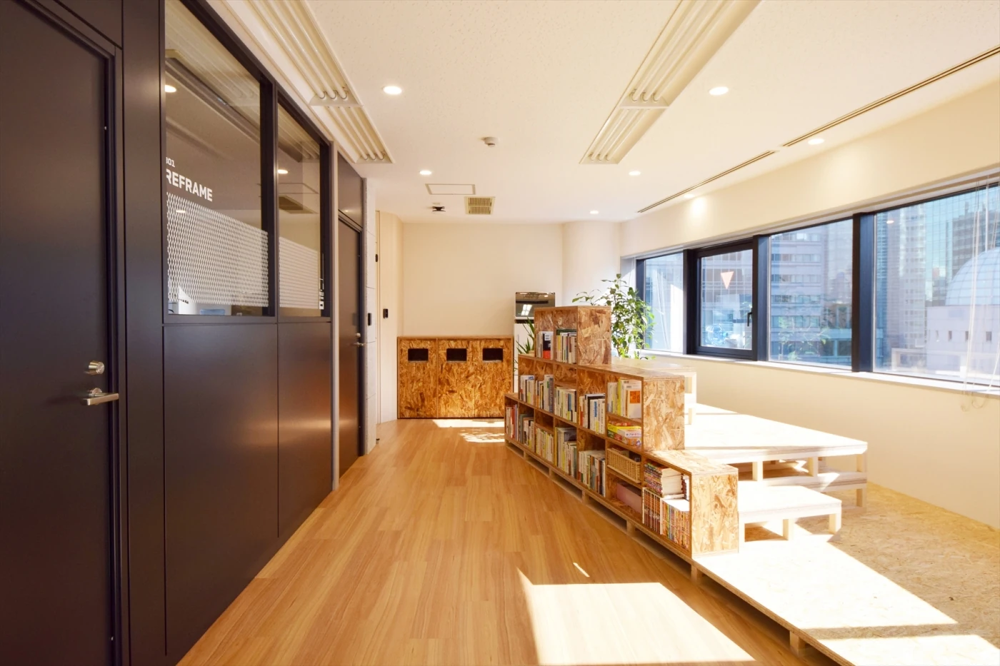オフィスのスペース効率を高め、働き方を変えるタイミングでお声がけいただきました。お客様からいただいた「enjoy」をテーマに、「jungle gym」というコンセプトでオフィスデザインを考えました。遊び心をちりばめ、会話が誘発的に生まれるような空間、レイアウトになるよう設計しております。デザインは特徴的なエントランスの木毛セメントに始まり、暖かみを感じられるようにOSB材を使用するなど、素材感にこだわりました。フレキシブルに働けるよう、レイアウトは様々な働き方を実践できるスペースを持たせ、コンセプトの体現を図りました。チームボックス様の文化を表す気持ちの良いオフィスとなっております。