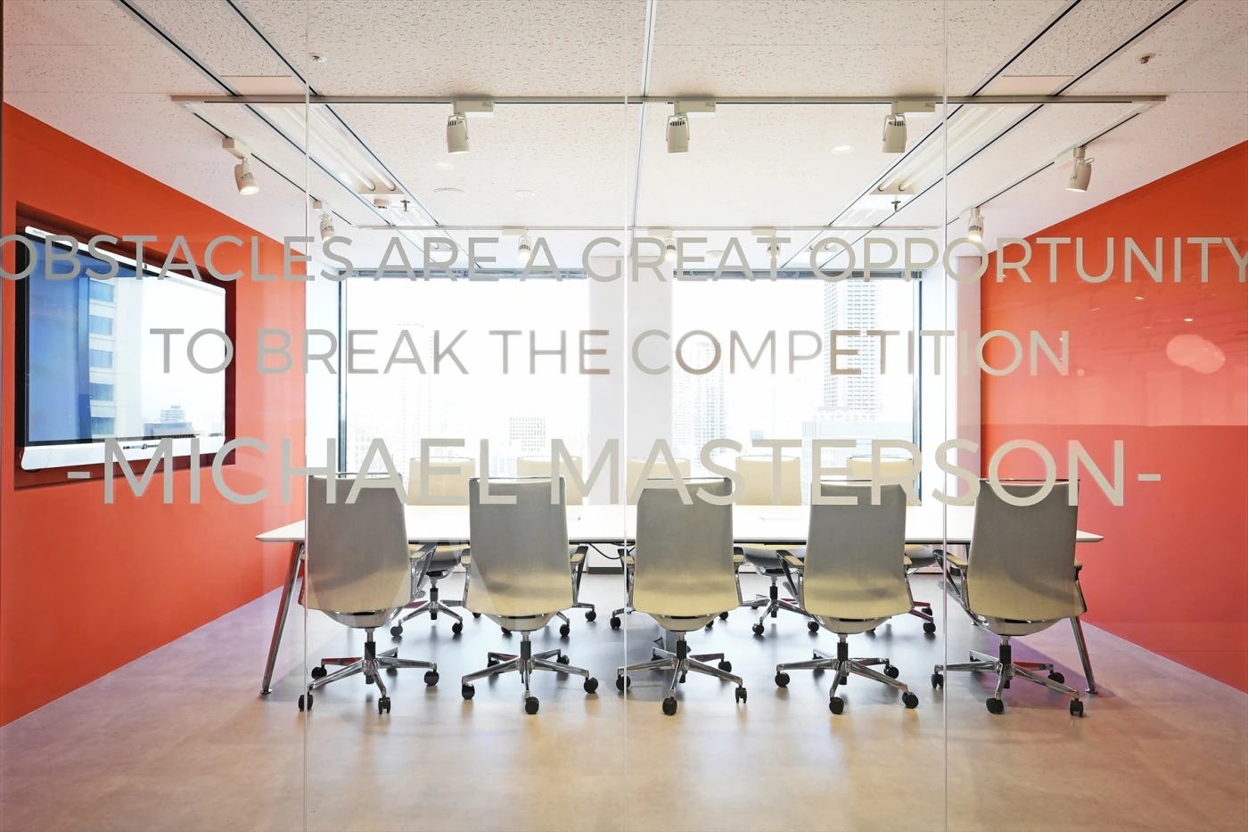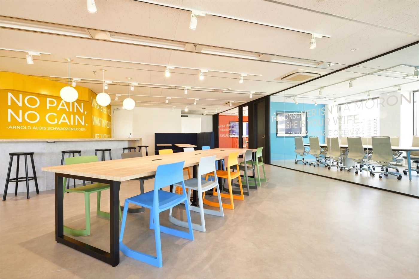 アクセントカラーが目を引く、開放的で明るいオフィス