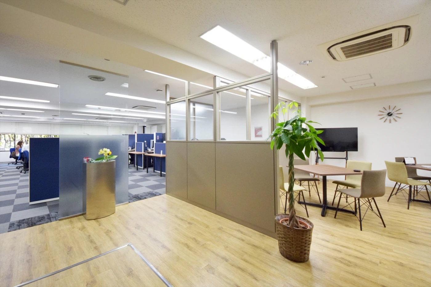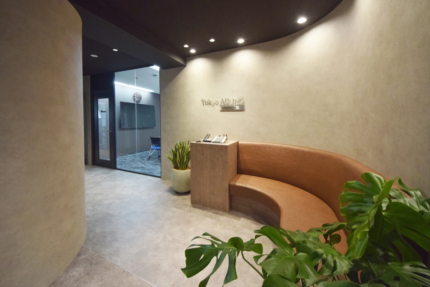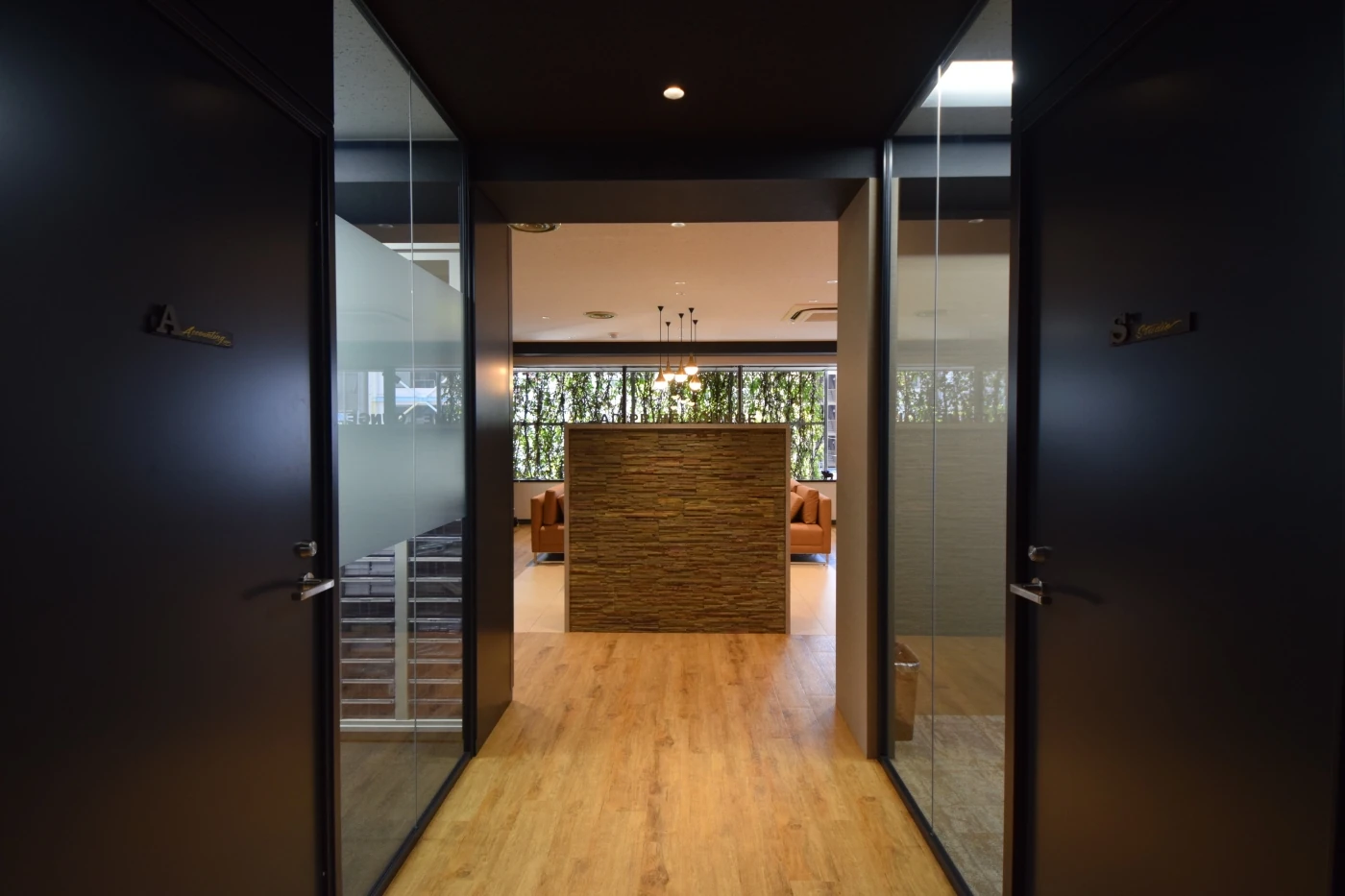 事業拡大を進める中で「社員間のコミュニケーションを取りやすくし、ゆったりとしたリフレッシュスペースを設けたい」というご要望を伺い、オフィスをデザインさせていただきました。クライアントの皆様をお出迎えするエントランスには左官調クロスを使用し、天井を黒く塗装することで重厚感のあるデザインに。リフレッシュスペースはビルに設置されているグリーンを生かして、目線が通りやすい配置と色合いにしました。オープンな空間でありながらも中央に設置した色とりどりのブリックで視線が気にならない工夫をしています。エントランスから会議室、リフレッシュスペースと伝統文化である狂言の舞台をイメージに空間を構成することで、メリハリのあるお洒落なオフィスに仕上がりました。