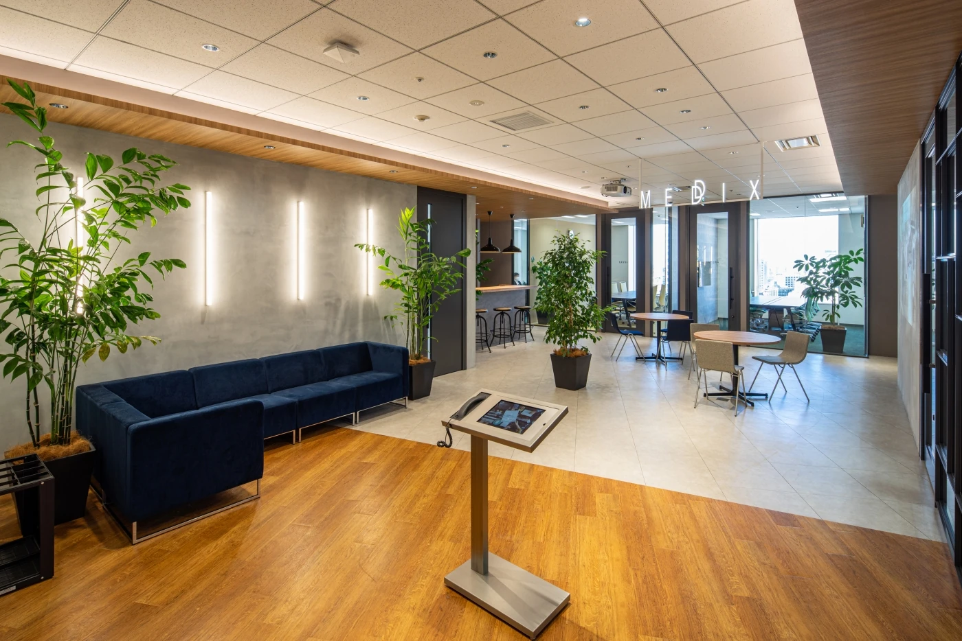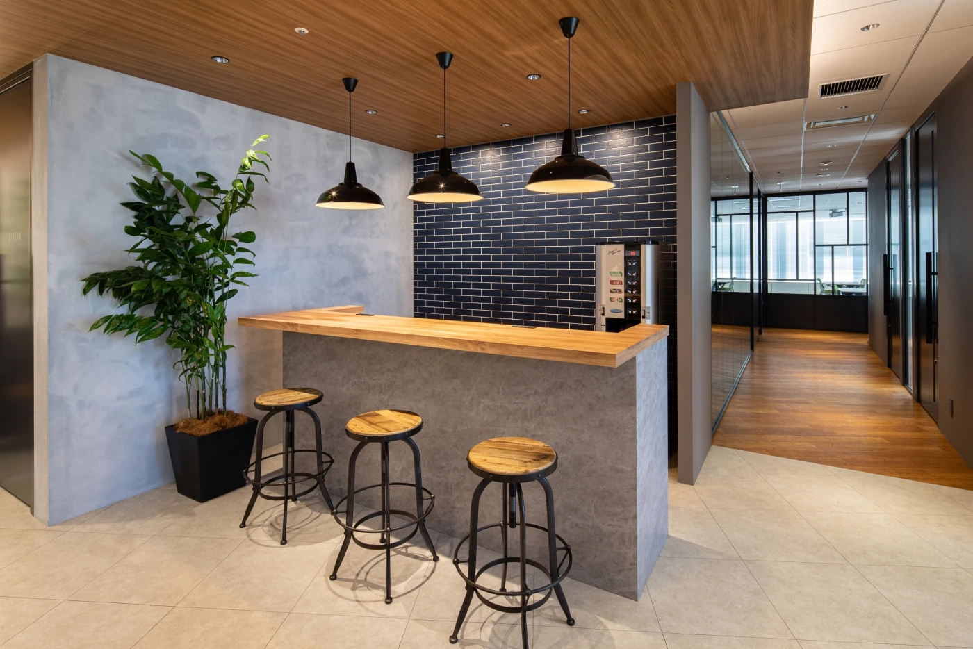 700坪を超える広い区画の中で、対外的に見せていきたい先進的なイメージと社員の皆様が居心地が良いと思える空間の調和を、レイアウトやデザインから表現しました。エントランスでは高層階の眺望を生かした開放感を表現しつつ、照明や床の貼り分けで先進的な印象を与えています。働き方に合わせ、飲食も可能なリフレッシュエリアをオフィスの中央に用意しルーバーで区切ることで、いつでも人の目を気にすることなくリフレッシュできるように設計しております。