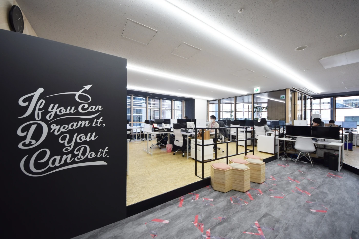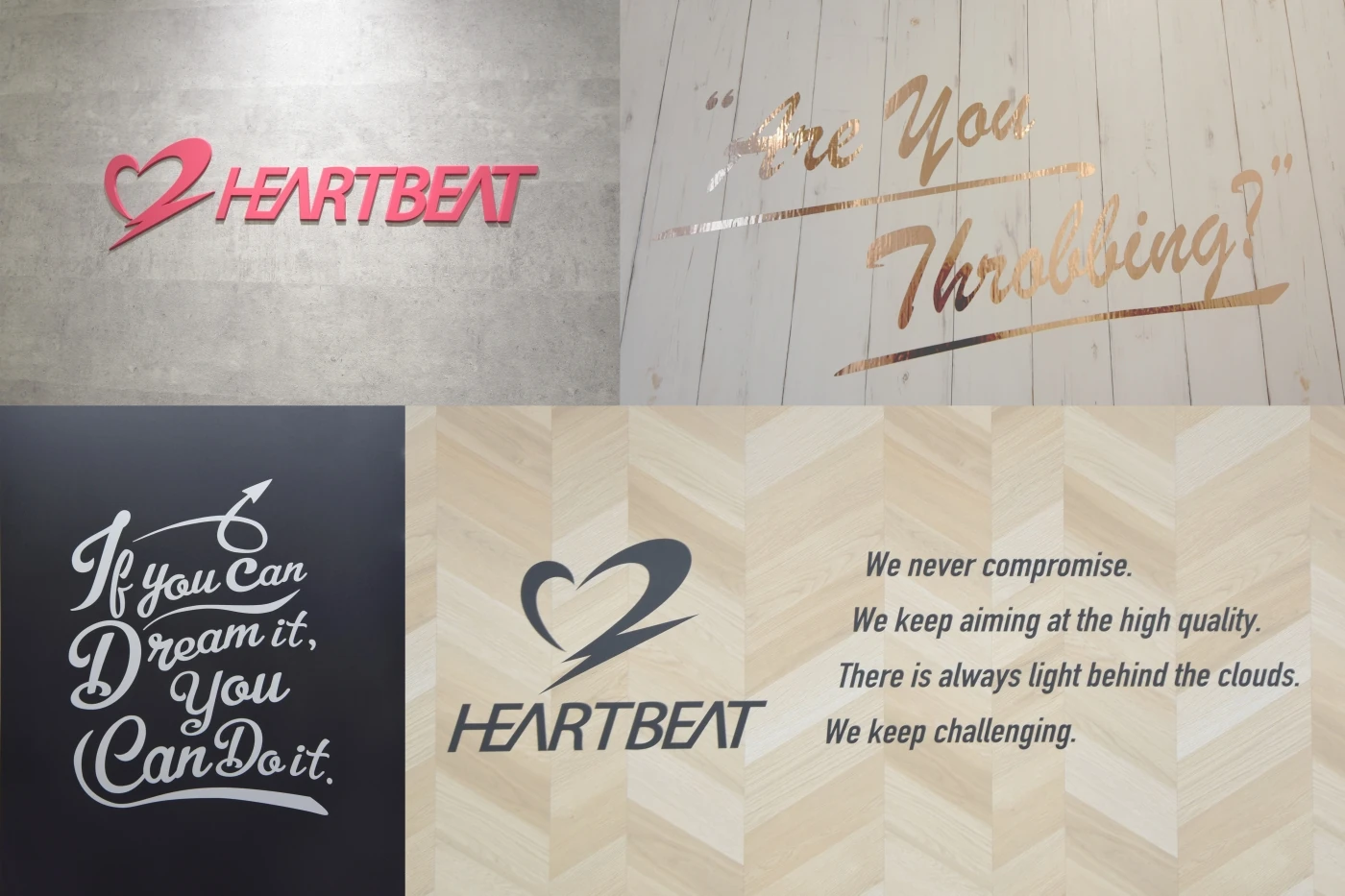 遊技機開発等を通して、全ての人の人生が豊かになるよう「遊び心」と「拘り」を大切に、ドキドキを創造されているHEARTBEAT様のオフィスをデザインしました。エントランスやワークスペースの各部署間を床上げや金物柵で空間を区切り、お客様の「拘り」のご要望を取り入れました。会議室やワークスペース内の壁には、来客者や社員の皆様に向けた英文字のメッセージをグラフィックシートであしらうなどの「遊び心」を加えました。オフィス全体で企業理念を表現した空間となりました。