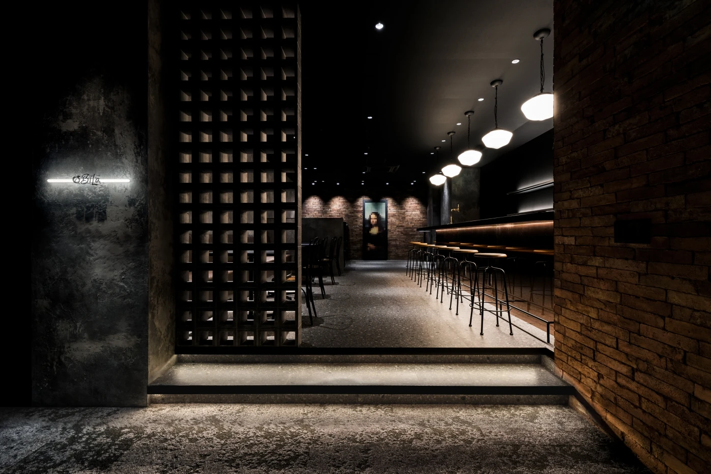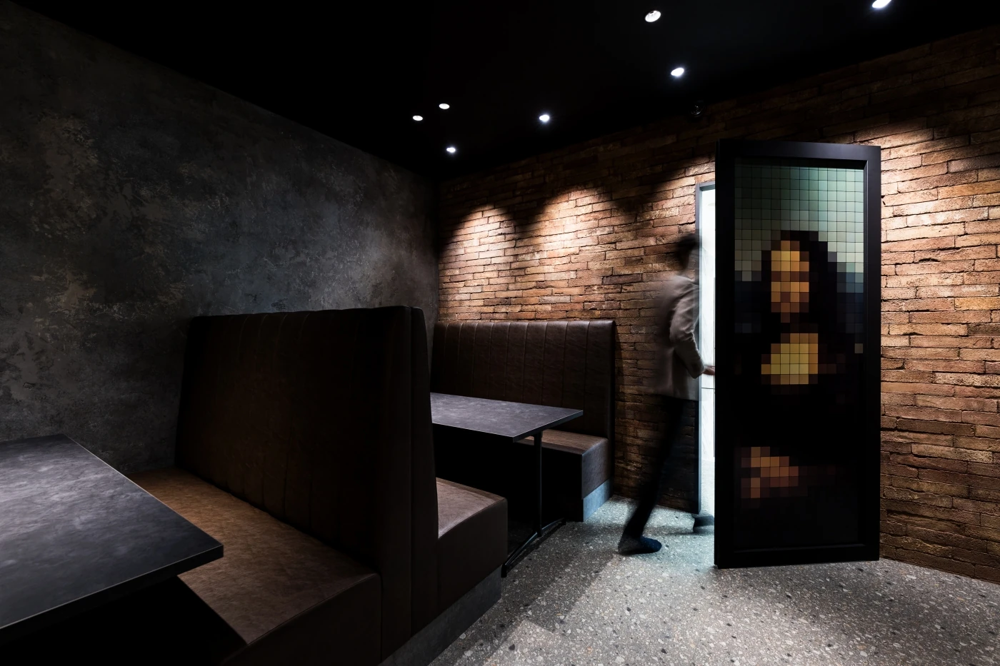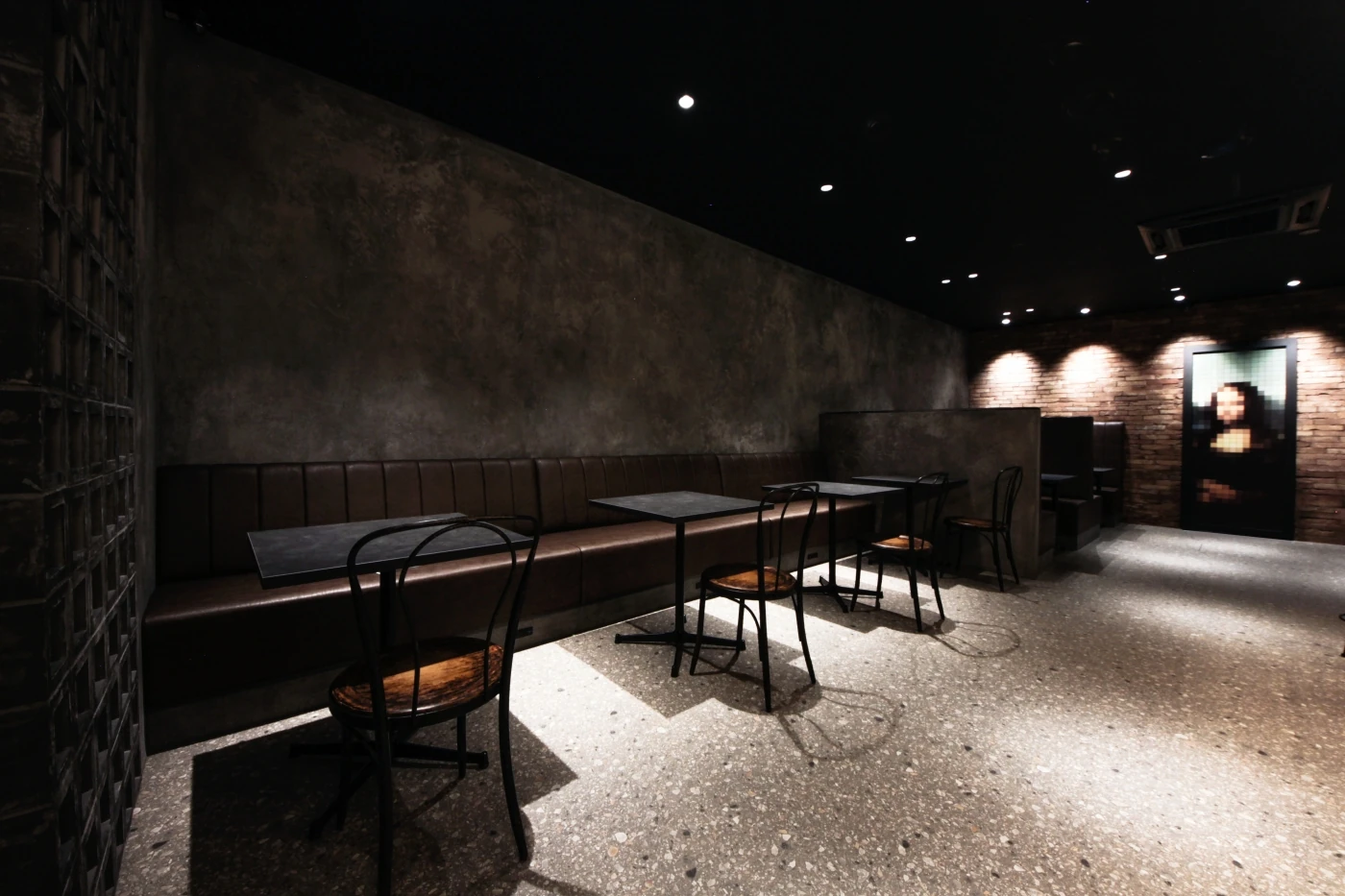 エレベーターを降り、一歩中に入ると落ち着いた大人な印象を受けるバーエリアが広がります。天井の黒塗装や壁面のエイジング塗装、バーカウンターの人造大理石などを施し、調光式の照明で光と影のコントラストをうまく使った空間になっています。絵画に見立てた隠し扉を開けば、全く異なる明るい空間が広がります。奥のリフレッシュエリアはバーエリアとは違い、明るい色使いと大人数でも使えるフレキシブルな家具を採用しました。卓球台兼ミーティングテーブルや床を加工したゴルフのカップ、仮眠室、パウダースペースなど男女問わず使い勝手の良い空間です。