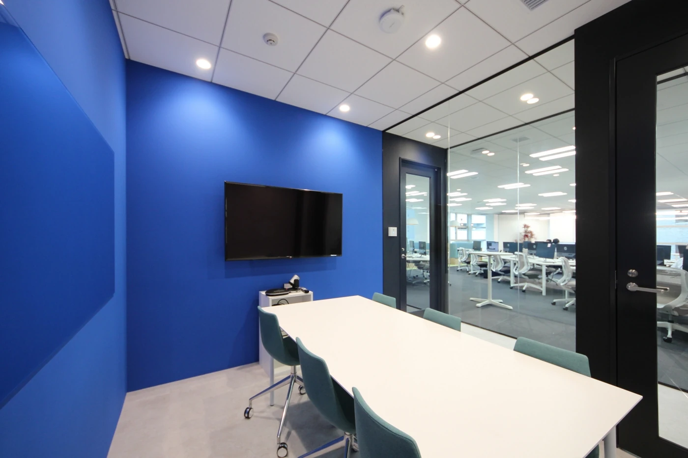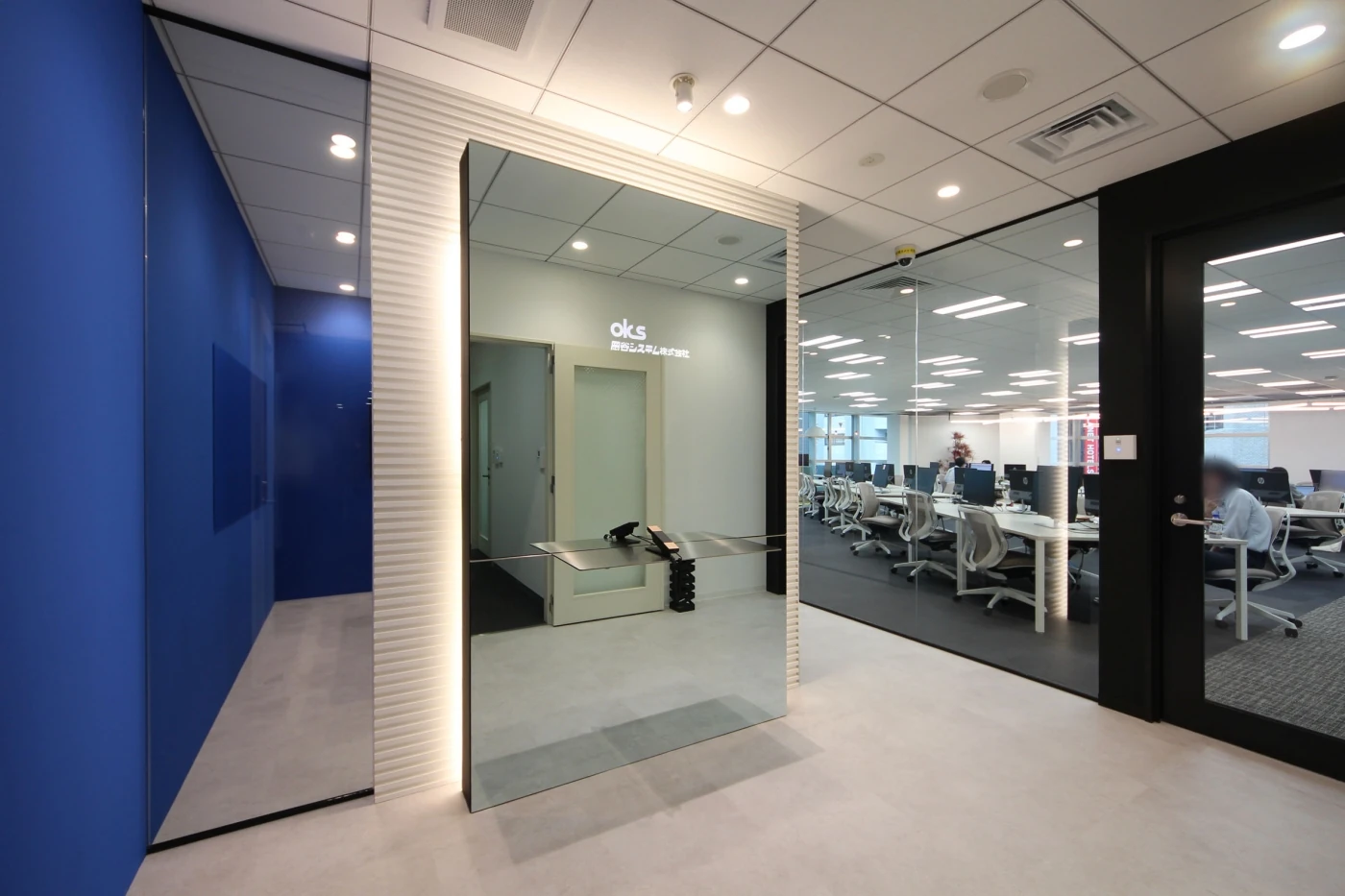 エントランスデザインはお客様と一緒にこだわったポイントで、ガラスを一面に使用しサインがモニターで浮き出るような演出をしました。コーポレートカラーを意識した壁面を奥の会議室まで繋げ、奥行が感じられる空間になりました。ワークスペースは窓の大きさを活かして窓側に集中スペース・ラウンジと多様なスペースを設け、自分の気分で働く場所を選べる空間にしています。休憩、仕事にもつかえるラウンジは非日常を感じてもらいたい思いで照明や天井にデザインを多く取り入れており、リラックスした雰囲気で過ごしていただけるよう工夫しました。全体を通して、開放感あふれる気持ちの良いオフィスとなりました。