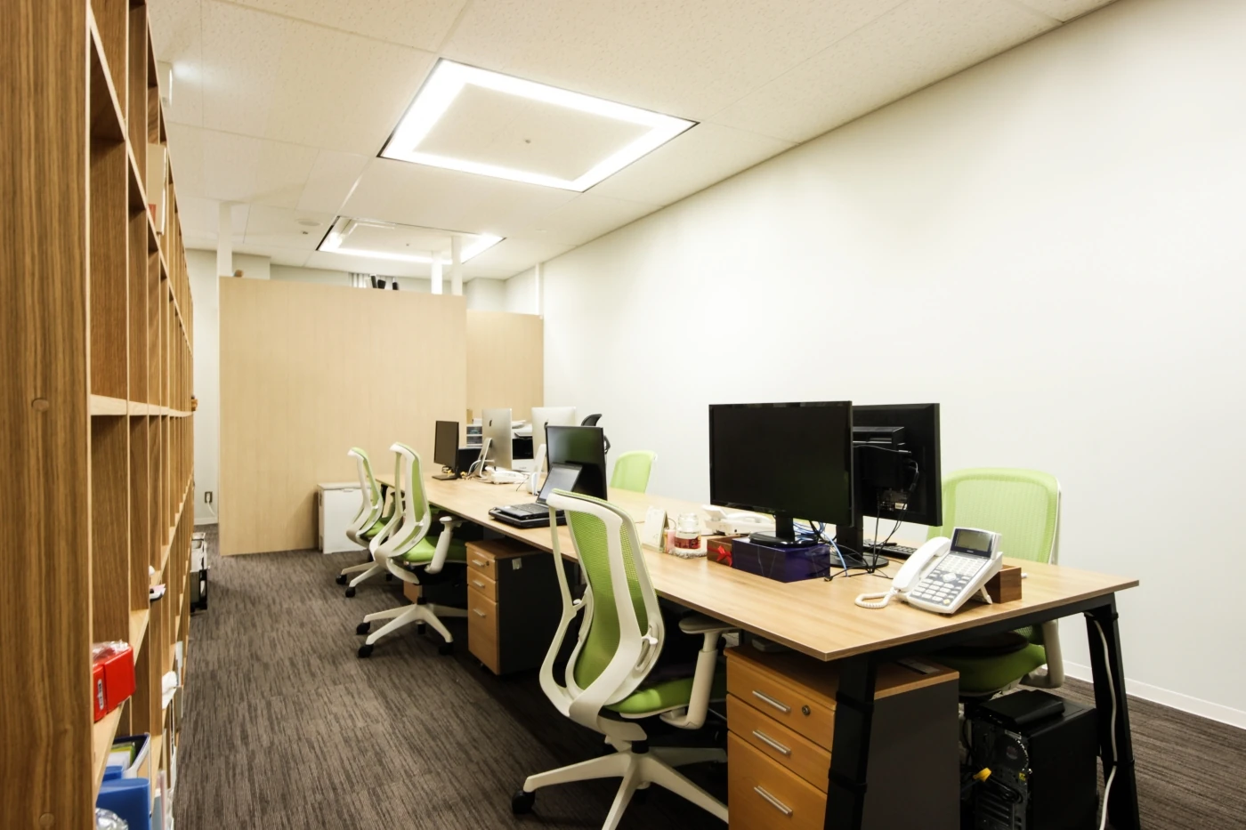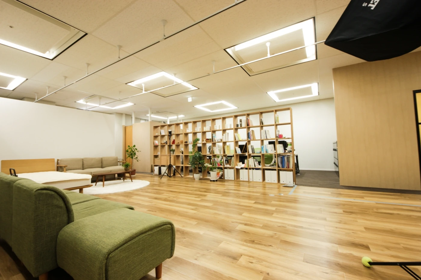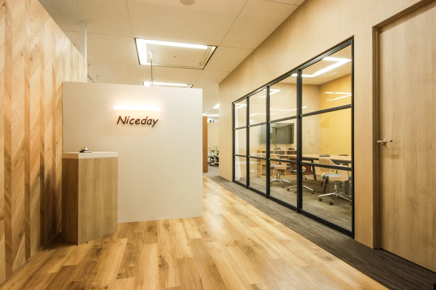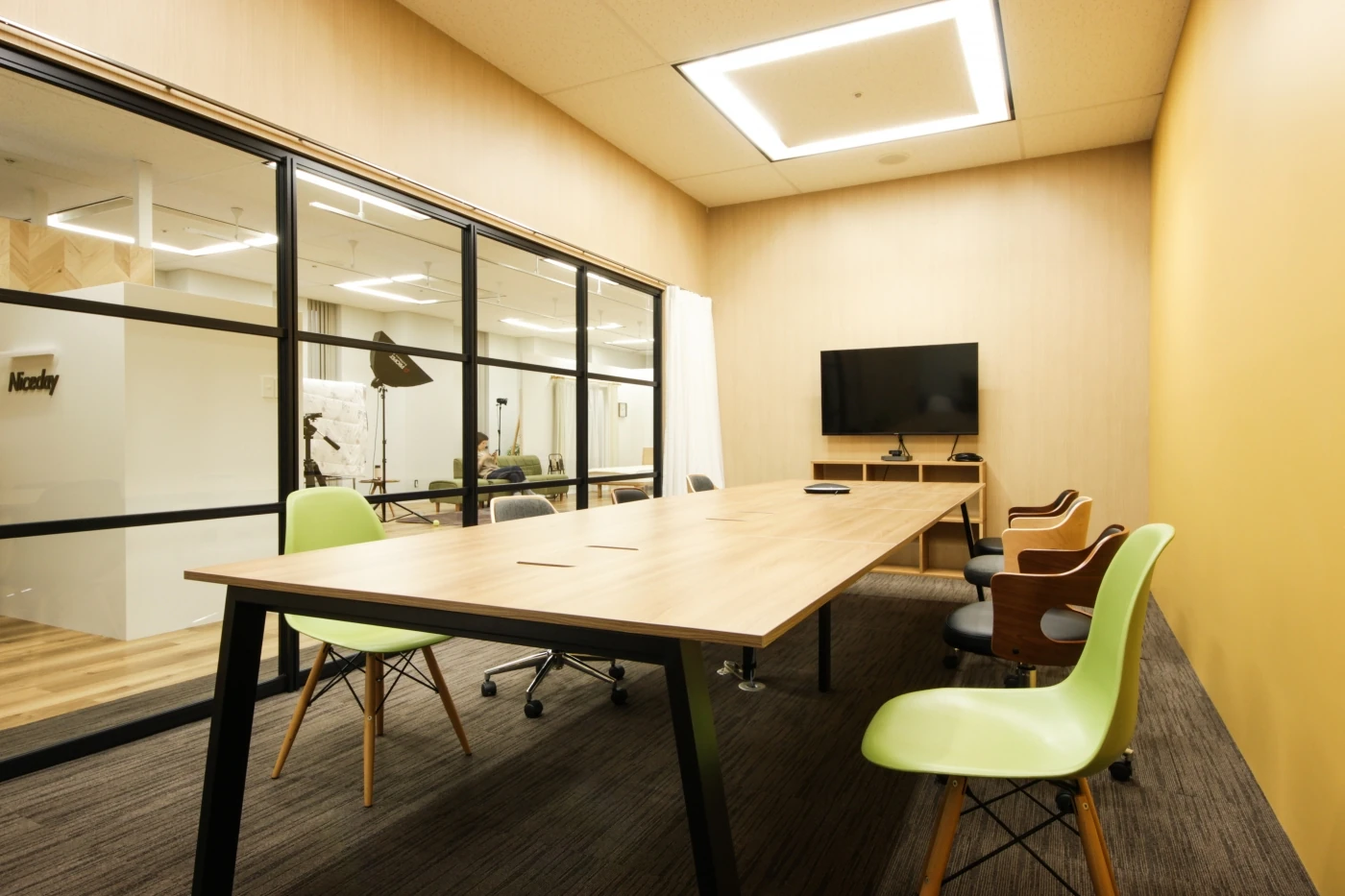 商品の魅力を最大限に引き出すためのデザインファームとして、より魅力的な拡大をしたいというご要望を伺い、「らしさ」をぐっと感じられる空間をデザインさせていただきました。特徴である天井の高さを活かし、エントランスは開放的で中へ導くようなデザインに。コーポレートカラーをポイントで採用しつつ、木目を多用して優しさを演出しました。撮影スペースは機能性を重視し、照明器具を自由にセッティングできる配線ダクトの計画を採用したり、撮影器具や備品を出し入れしやすくしたりと工夫しました。ナイスデイ様らしい、明るく開放的でデザイン性と機能性がマッチした空間となりました。