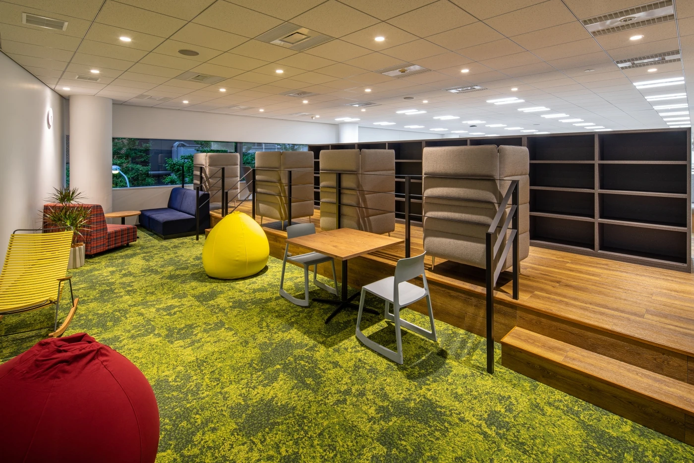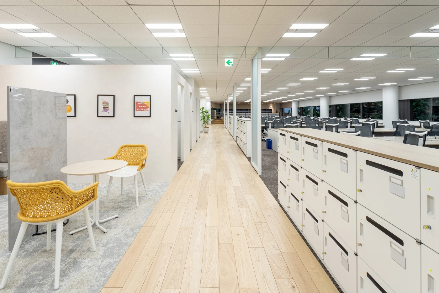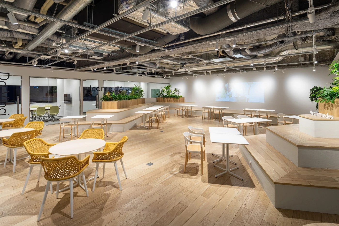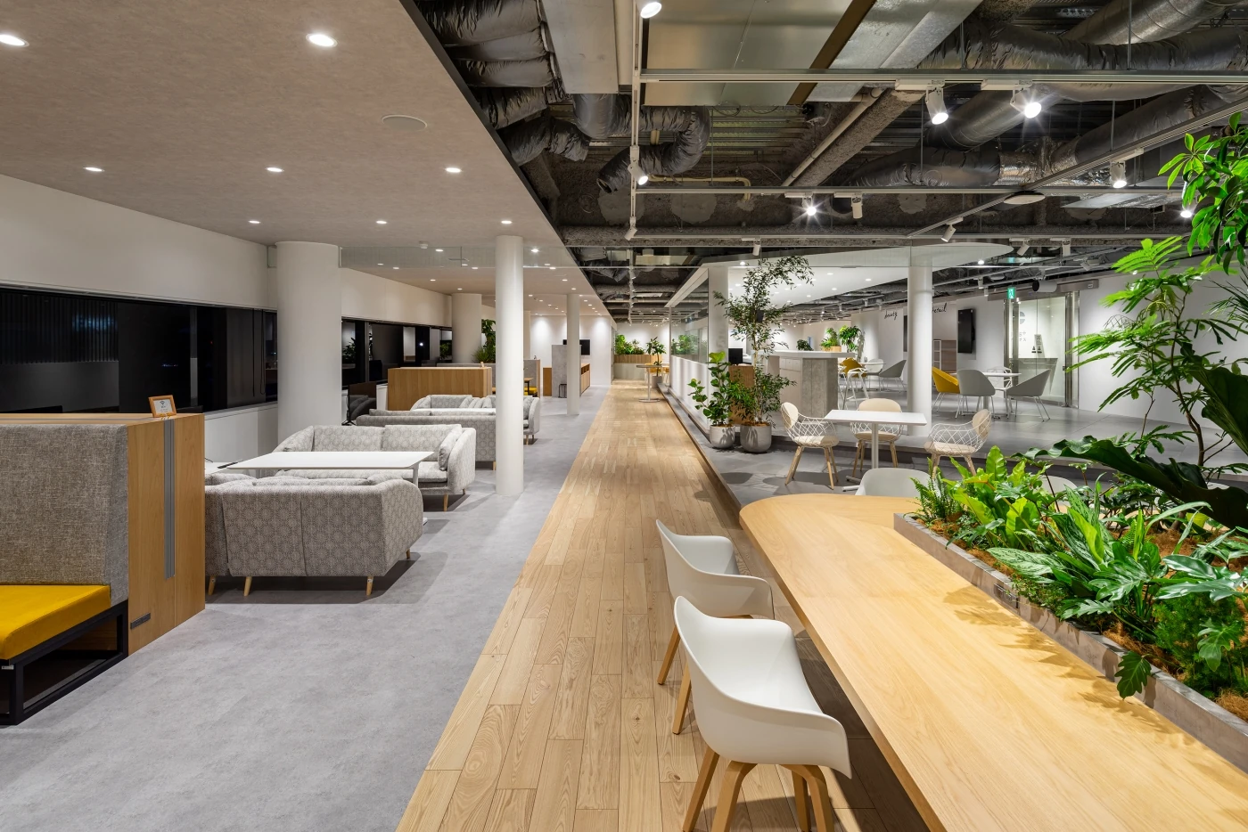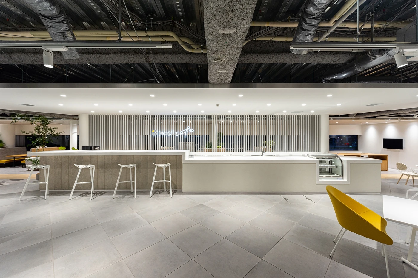 クラウド型POSレジ「POS+」をつくるポスタス様のオフィス設計を担当させていただきました。POS+ブランドが体感でき、ハード面でも機器を体感できるデモンストレーションスペースを兼ねたオフィスというご要望をいただきました。型にはまらないクリエイティビティが感じられ、将来的に様々な使い方が想定できるフレキシビリティを持たせることにこだわったオフィスです。全体的にグレートーン・木目でまとめながらも、中央にかまえたPOS+cafeやセミナースペースのひな壇で高低差を出すことによりメリハリのある空間となっています。