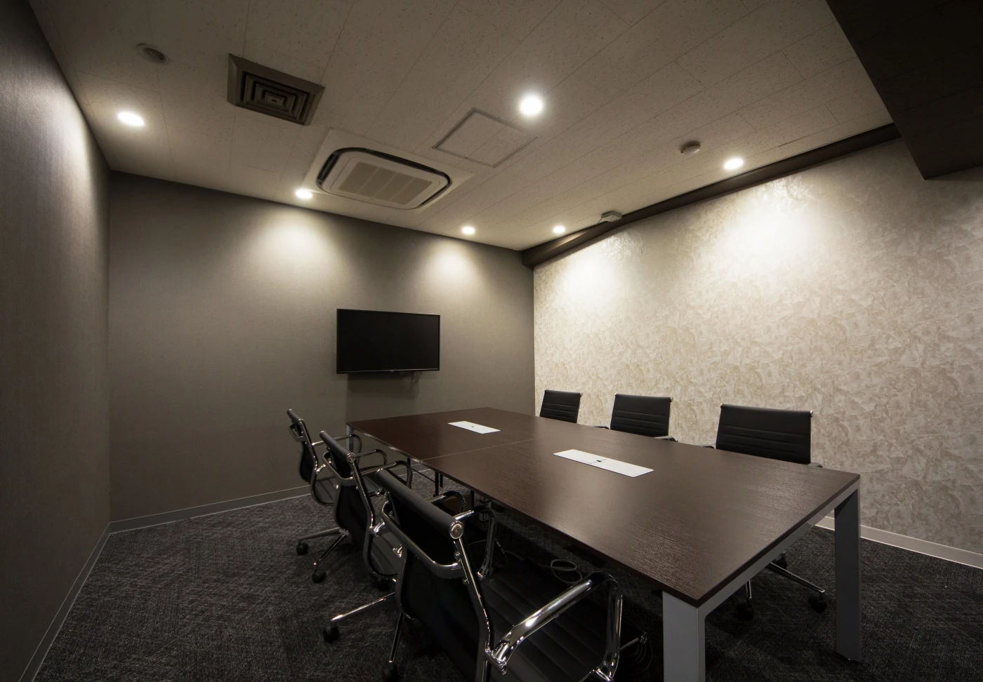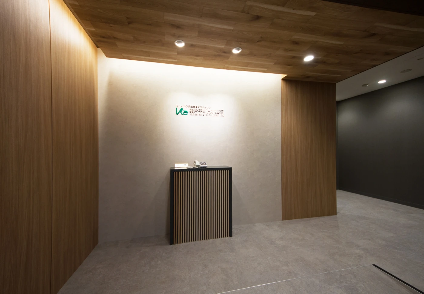 エントランスは白と木目を基調とした明るいデザインに。天井はあえて下げ、間接照明を入れることによって重厚感を演出しています。会議室はエントランスとのつながりを意識して統一した落ち着いたデザインにしました。