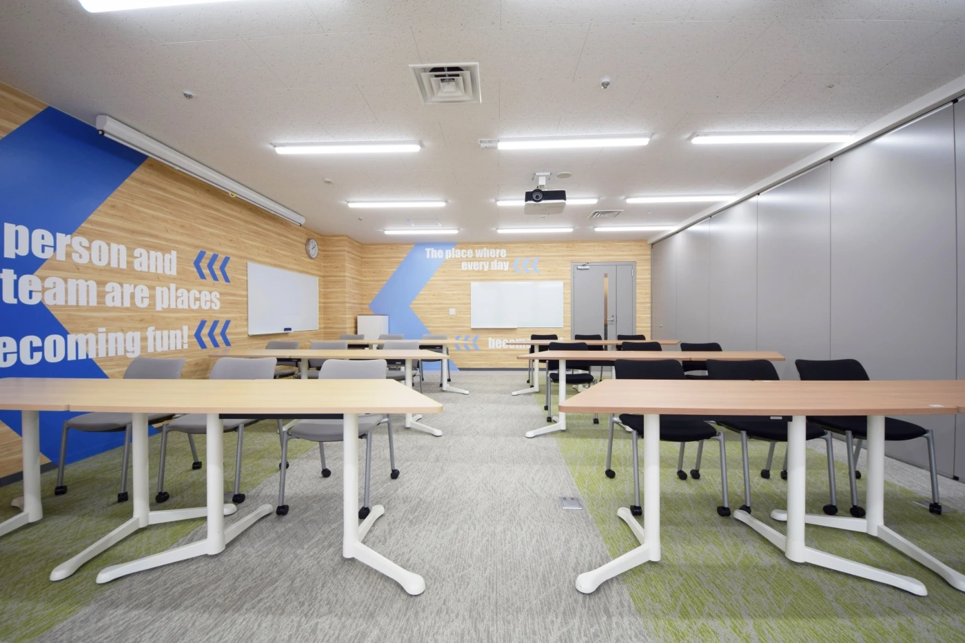 前回に続き2回目のご移転をお手伝いさせていただきました。今回頂いたキーワードは”キックオフ”と”懐かしさ”。この2つの要素をオフィスデザインで表現しました。オフィスに入ると”学校の廊下”をイメージしたエントランス。レトロな電話機や窓、ルームサインなどが”懐かしさ”を感じさせます。研修ルームは学生時代の学ぶ姿勢を想起できるよう設えました。競技場のラインを意識した床材の貼り分けで、”キックオフ”感を体感しながら研修に取り組めるような空間に仕上がりました。さらにワークスペースが同フロアの別区画にあるため、研修ルームの床材のデザインに繋がりを持たせ、一体感を表現しています。その他のスペースにも黒板やステンドグラス調のペンダントライトなど”懐かしさ”を感じられるポイントを数多く散りばめました。