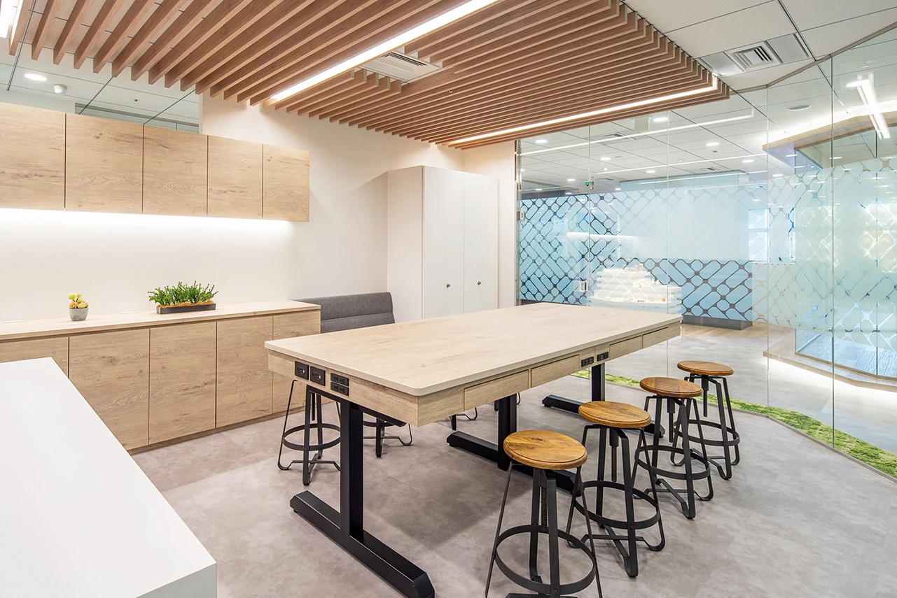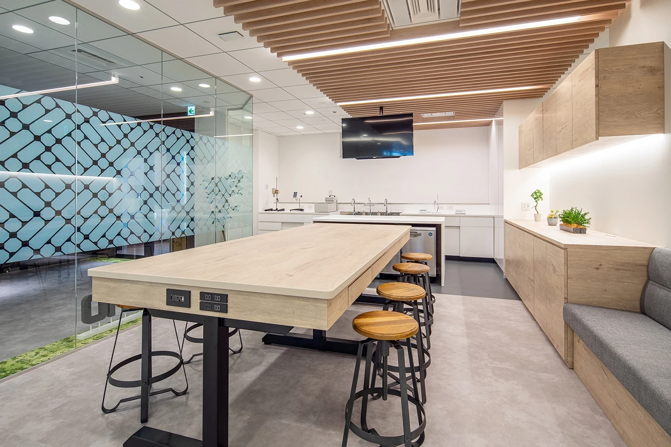 従来の営業拠点のみならず、新たな機能としてLaboを併設することを軸にオフィス全体を構成しました。Laboスペースでは、お取引先様との共同試作による新商品の開発、デモをご覧いただきながらのセミナーなどを実施できるように動線や設備計画はもちろん、収納面の利便性にも考慮しました。天井のルーバーがアクセントになり、洗練された空間に加えリビングの様な柔らかく温かなイメージをオフィス全体を通し演出しています。来客を促進し、Laboを上手く活用することで新しいビジネスモデルや働き方がスタートし、「技術専門商社」として更にお取引先様に効率的かつ有益な技術サポートができる機能を持ち合わせた、これからの展開に期待できるオフィスとなりました。