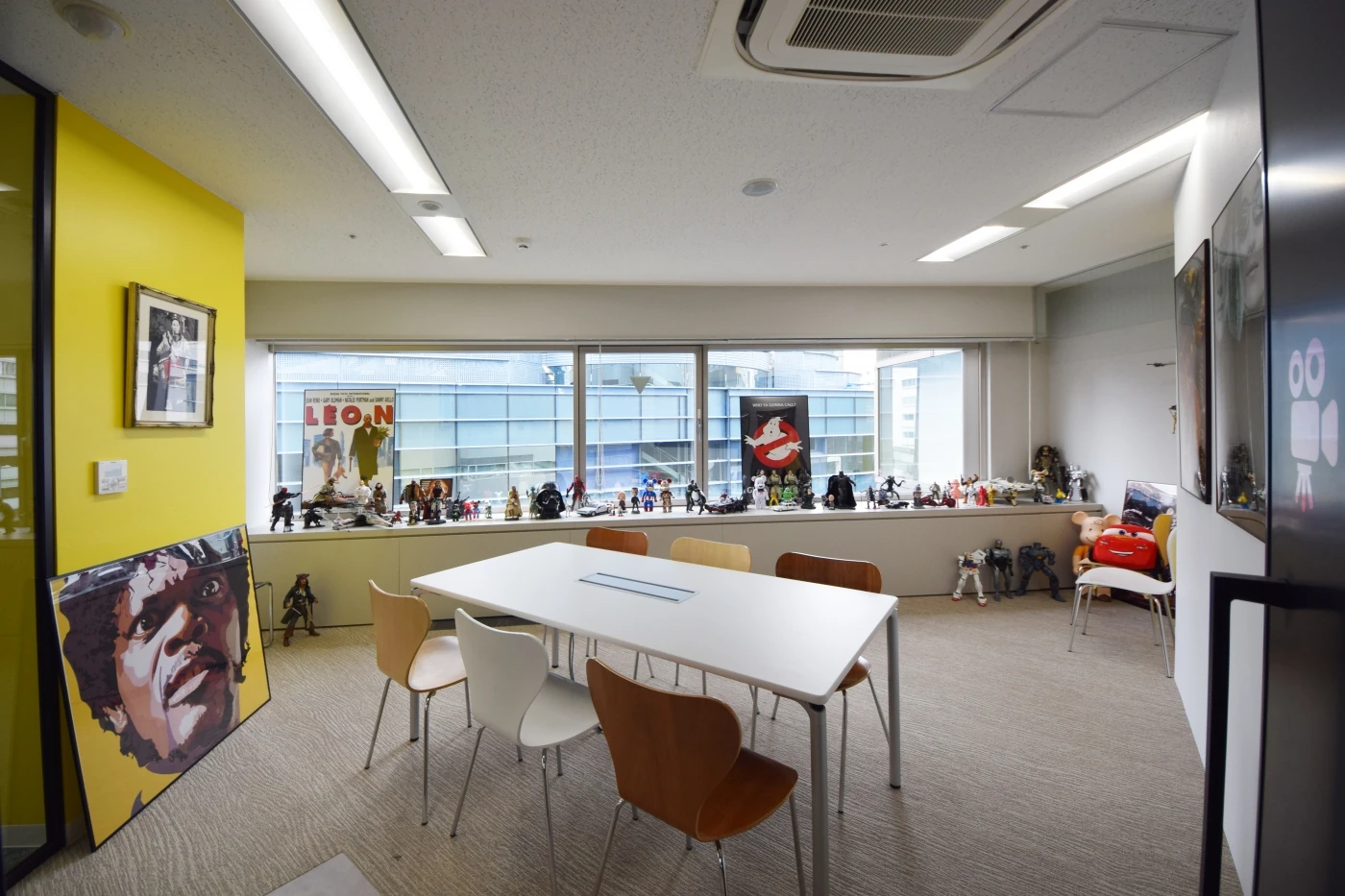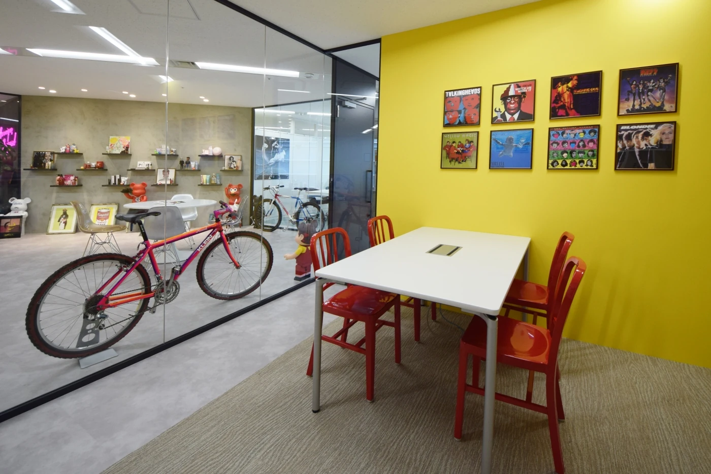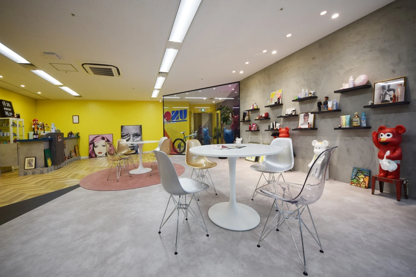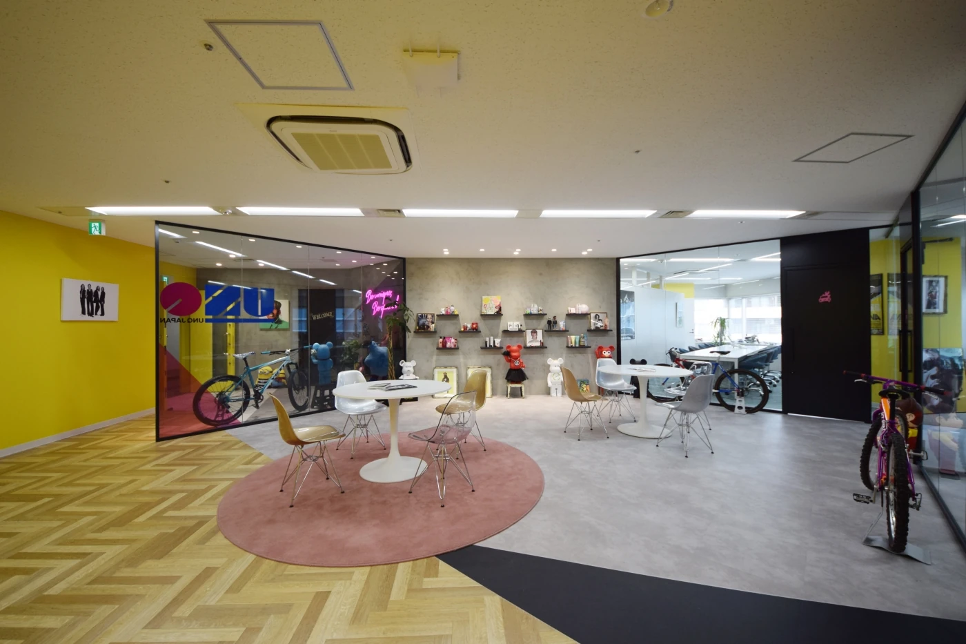 企業イメージ刷新に伴い、採用強化を図るためにこのご移転プロジェクトが発足しました。新しい事業開始によるクリエイティブ部門の強化を図るため、いかに”面白いことをやりそうだ”というイメージを持っていただけるかということを考え、デザインしました。魅せる商談スペースにする上で、窓の採光を最大限生かしたレイアウトにし、エントランスのガラス壁には、日本と中国を繋ぐHUBにすることをモチーフにした世界地図のシートを貼りました。そして、ポップさを前面に出すべく、インパクトあるイエローをふんだんに取り入れ、モルタル壁と相まって、大人なSHOWCASE空間へと仕上がりました。