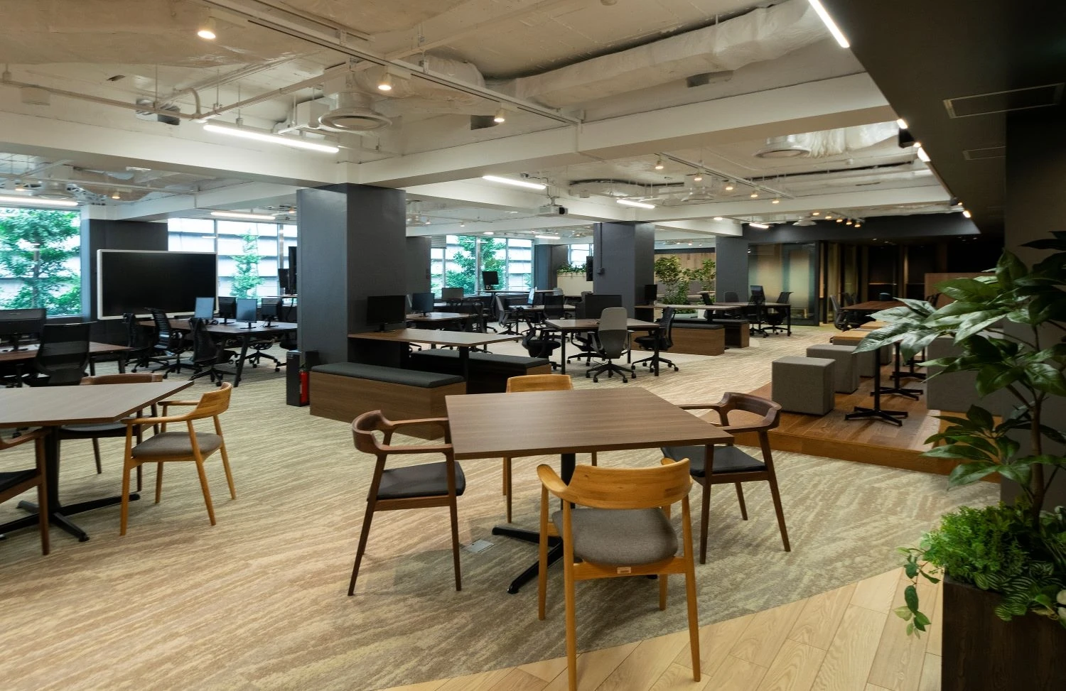 「ビジネス」「デザイン」「データ」「テクノロジ」の専門性を活かしたコンサルティングを担当するC&M事業部の新オフィス開設をお手伝いしました。「C&M事業部は創造し続ける人であり、オフィスは創造し続ける人を支える場所」という考えのもと、「axis」というコンセプトを立ててプロジェクトを進めました。今回、働く場所を自由に選べるABWを取り入れ、創造性を活性化できるオープンなコミュニティエリアから、様々なシチュエーションに応じて働くことができるワークエリア、深く集中してタスクを遂行できるコンセントレーションエリアなどを設け、多様な働き方が実現可能な空間になりました。マテリアルや家具の選定もお客様とともに一つ一つにこだわり、開放的で各エリアの繋がりを意識した素材のグラデーションが特徴的なオフィスが完成しました。