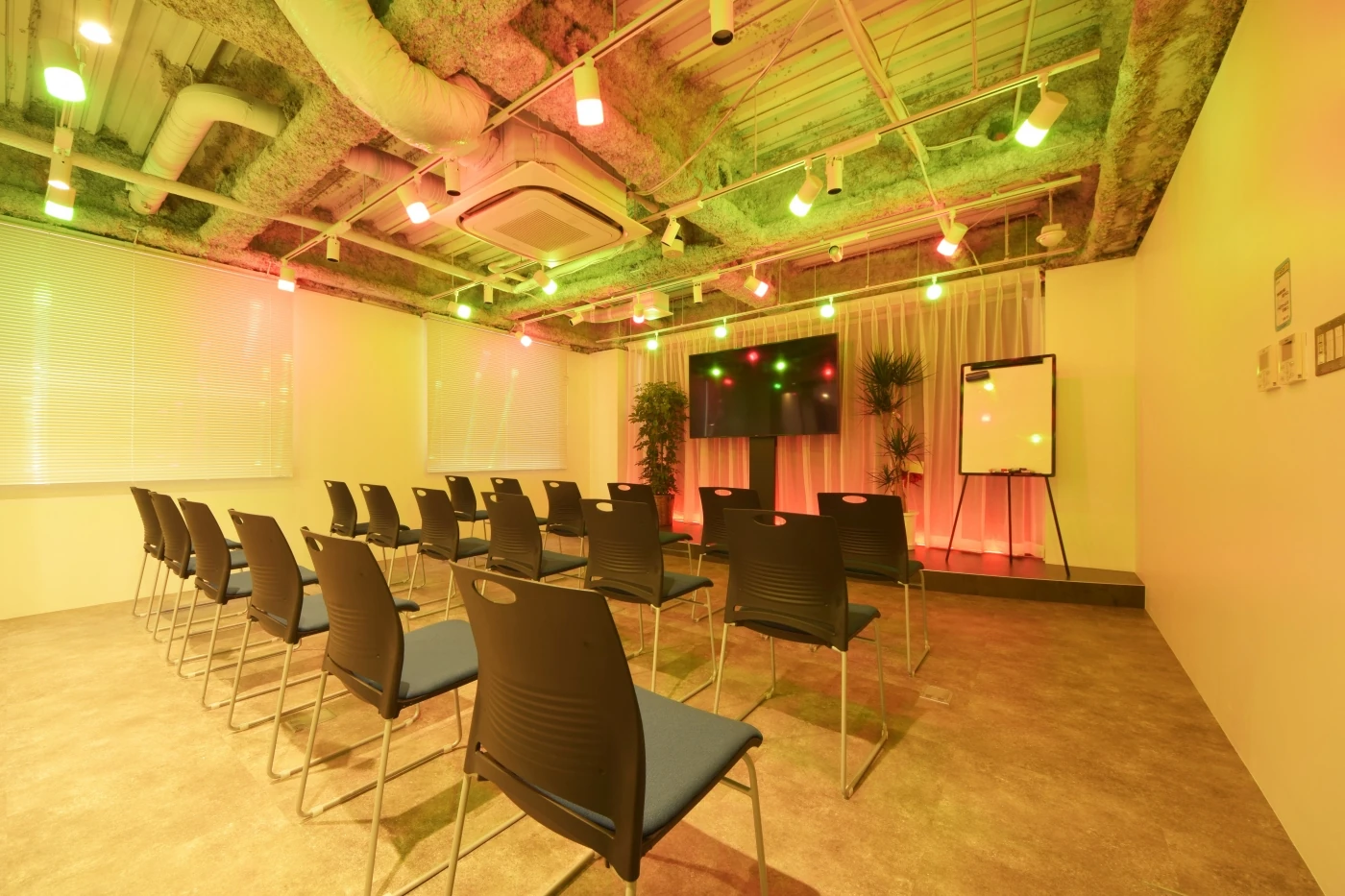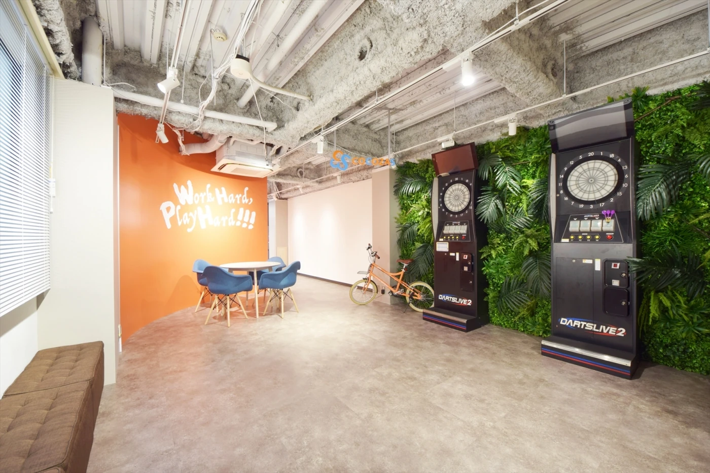 事業拡大に伴い、会社の「色」を全面に掲げたオフィスをデザインしました。企業理念である「ワクワク、生きる」をモットーに、ダーツ台、壁一面のアイデアペイント、252色の照明を使い分けられるセミナールームなど、遊びごころを各処へ散りばめました。また、エントランスから入ってすぐのオープンエリアからあえて路地をイメージした細い道を作り、ワクワクさせる動線を設けました。