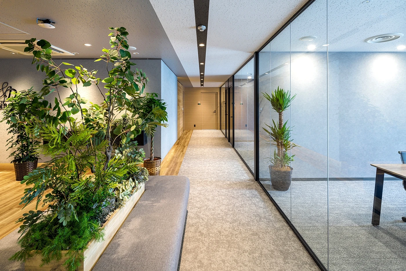 事業拡大を進めるD&D様の増床移転をお手伝いさせていただきました。広がりと落ち着きのあるエントランス、窓面から差し込む採光を生かし、部屋ごとに表装を選定した会議室は来訪した方々も楽しんでいただけます。ワークスペース内には社内の打ち合わせやランチ・休憩など、より社内コミュニケーションの幅が広がるフリーエリアを設け、皆様が快適に過ごすことができるオフィスになりました。