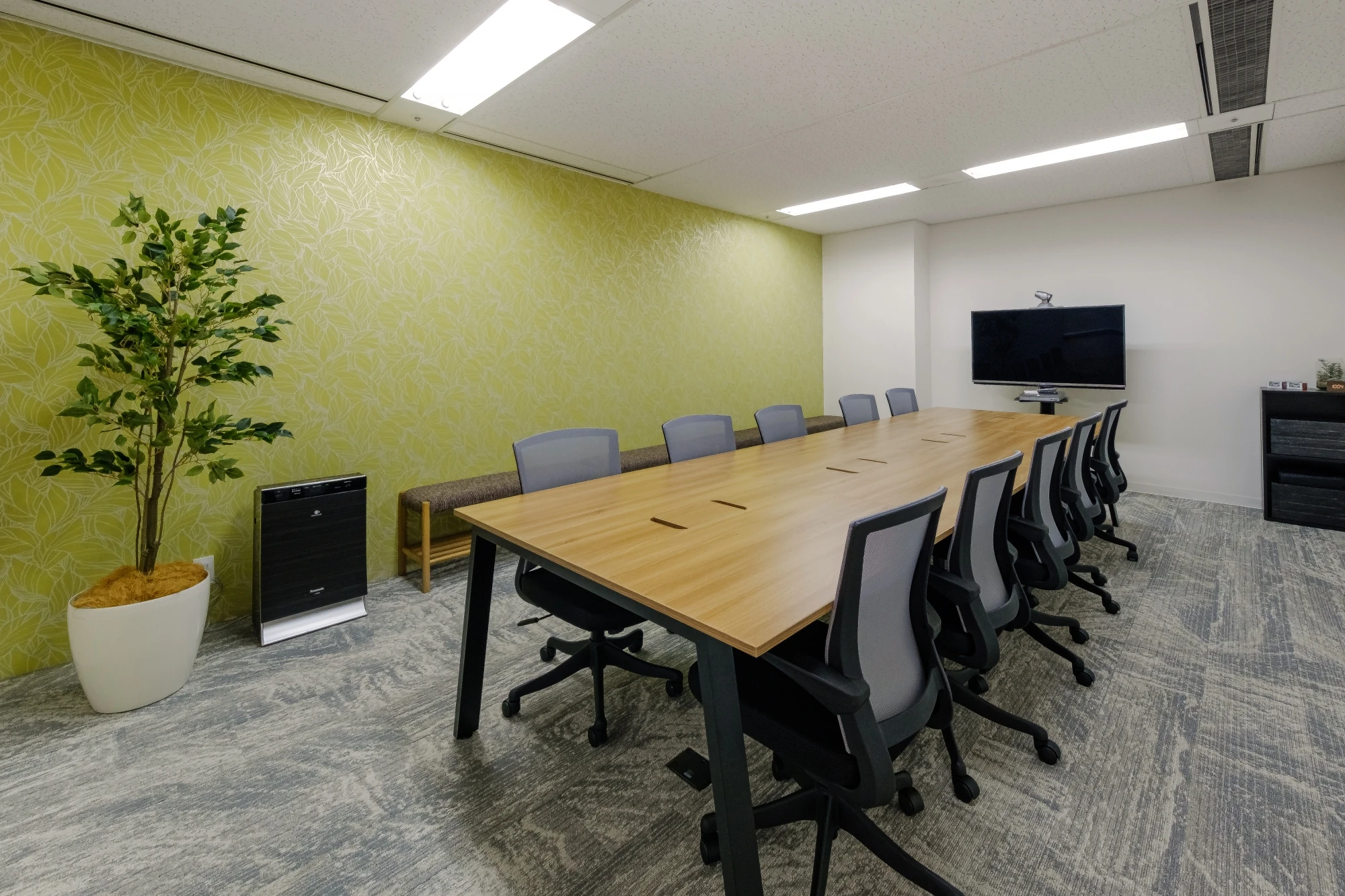 札幌オフィス開設のお手伝いから約1年半後、事業拡大に伴う拡張移転のプロジェクトでした。エントランスの正面は空間をガラスで間仕切ることで抜け感を創り、開放感を重視した構成は踏襲しつつも、天吊りのLEDサインと左右に広がる壁面緑化のアクセントを加えました。ビッグカウンターは元々のサインを取り外して流用し、引き続き存在感を演出。フリースペースにはシンボルツリーを組み込んだ円形テーブルやR形ソファ等を組み合わせ、リフレッシュはもちろん簡単な打合せや打ち上げ等、様々な用途に利用できるようにコンセプトである”GARDEN”を意識し設計。ワークスペースには感染症予防のための飛沫感染対策としてローパーティションを全席に導入。対面をガラスにすることで特有の閉塞感を緩和できるようにしました。