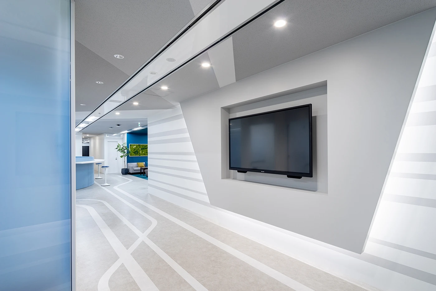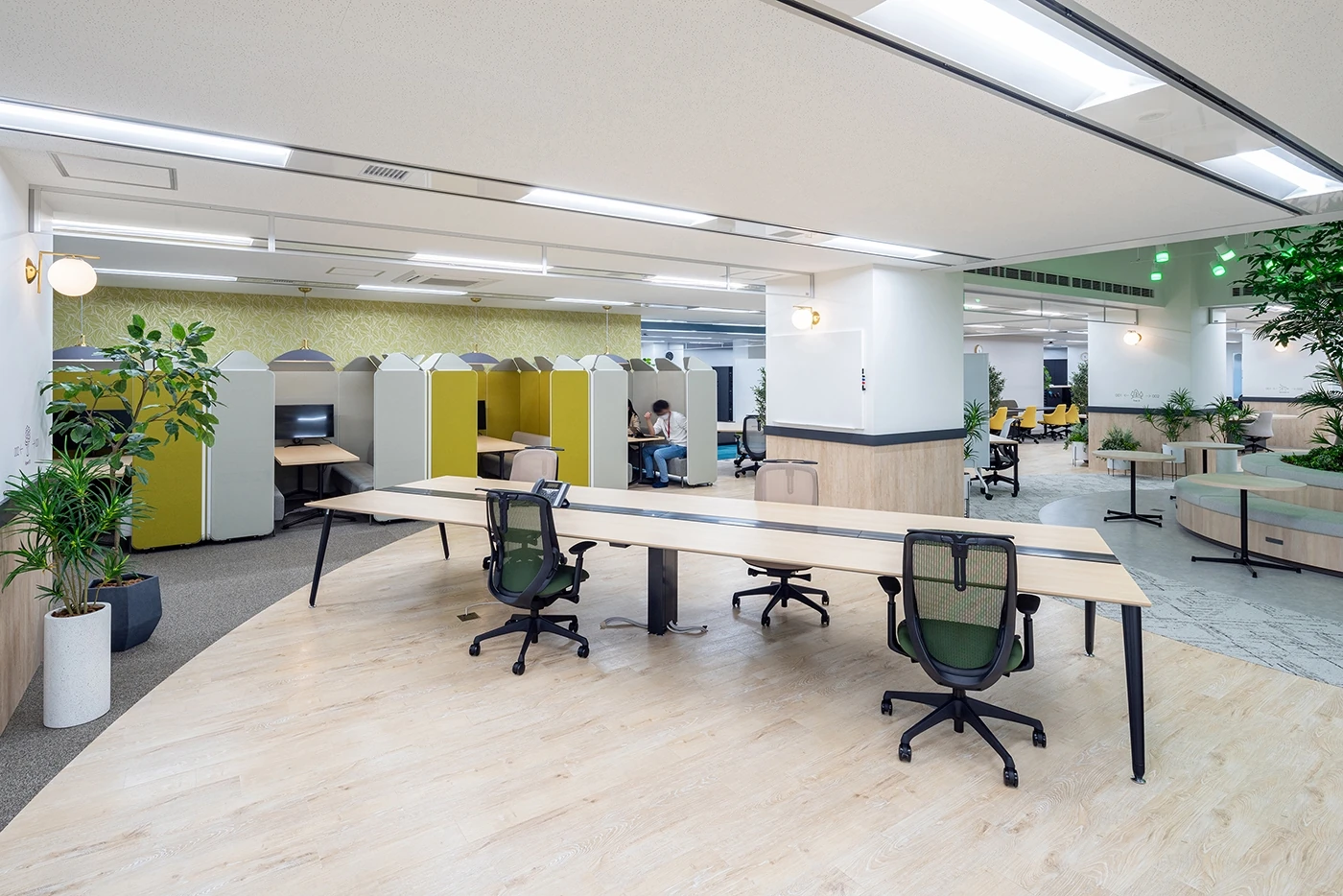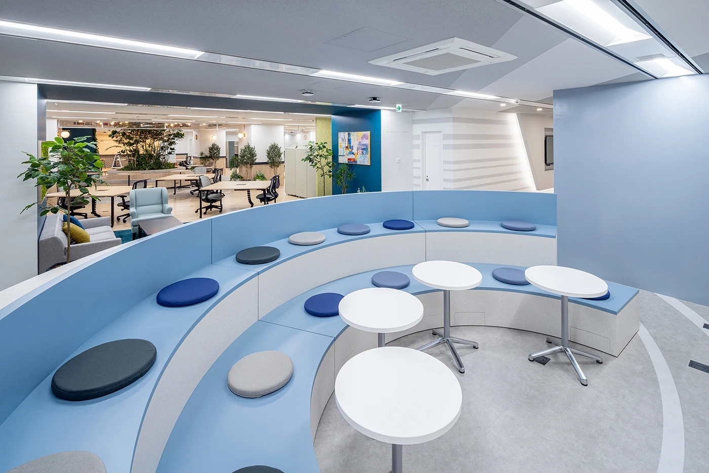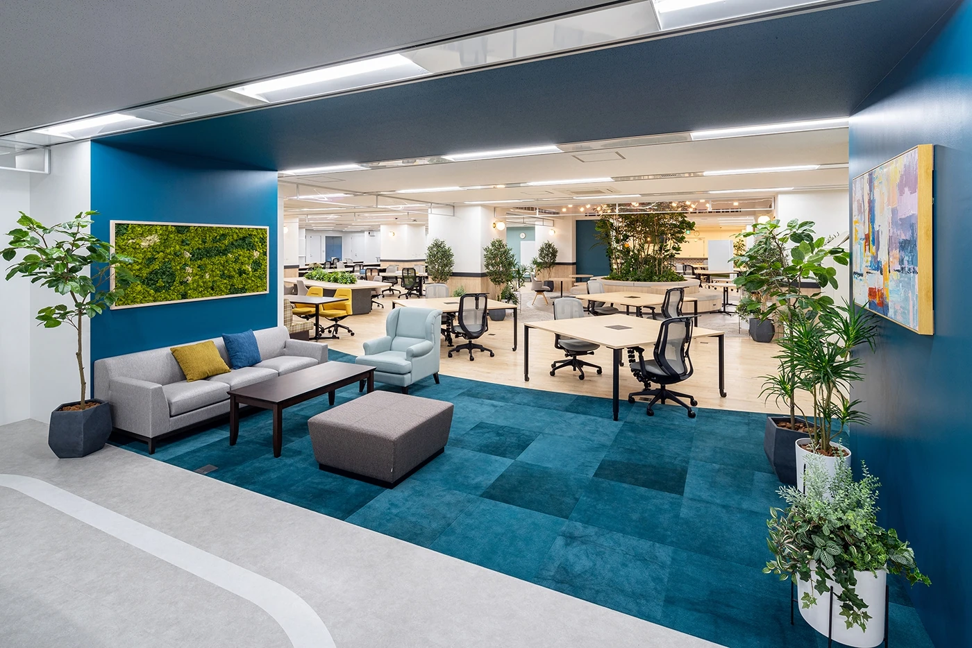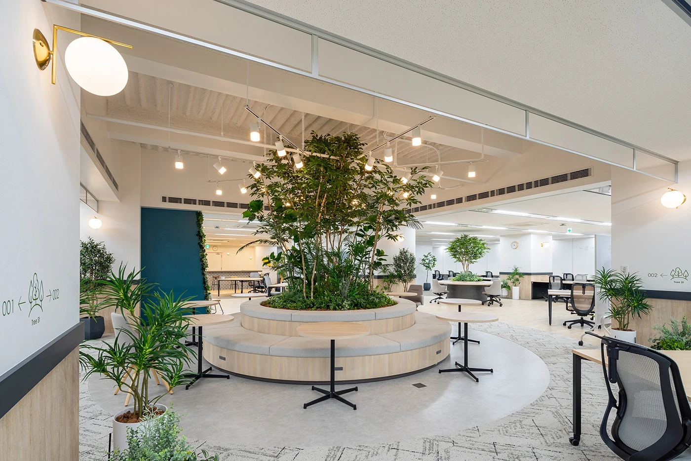 エントランスは先進的な印象で、NTTデータ様の企業イメージそのものを表現しています。エントランスを抜けると鮮やかなグリーンのトンネルへと続きます。その先の執務エリアはナチュラルなデザインで、カジュアルな雰囲気漂う木目を基調としており、ブラケットライトが心地よい空間のアクセントとなっています。オフィス中央には円形ソファが設えられたシンボルツリーがレイアウトされ、エントランスの雰囲気からは想像できない空間が広がります。様々なスタイルの家具を配置し、業務内容によって働き方を変えられるオフィスとなりました。