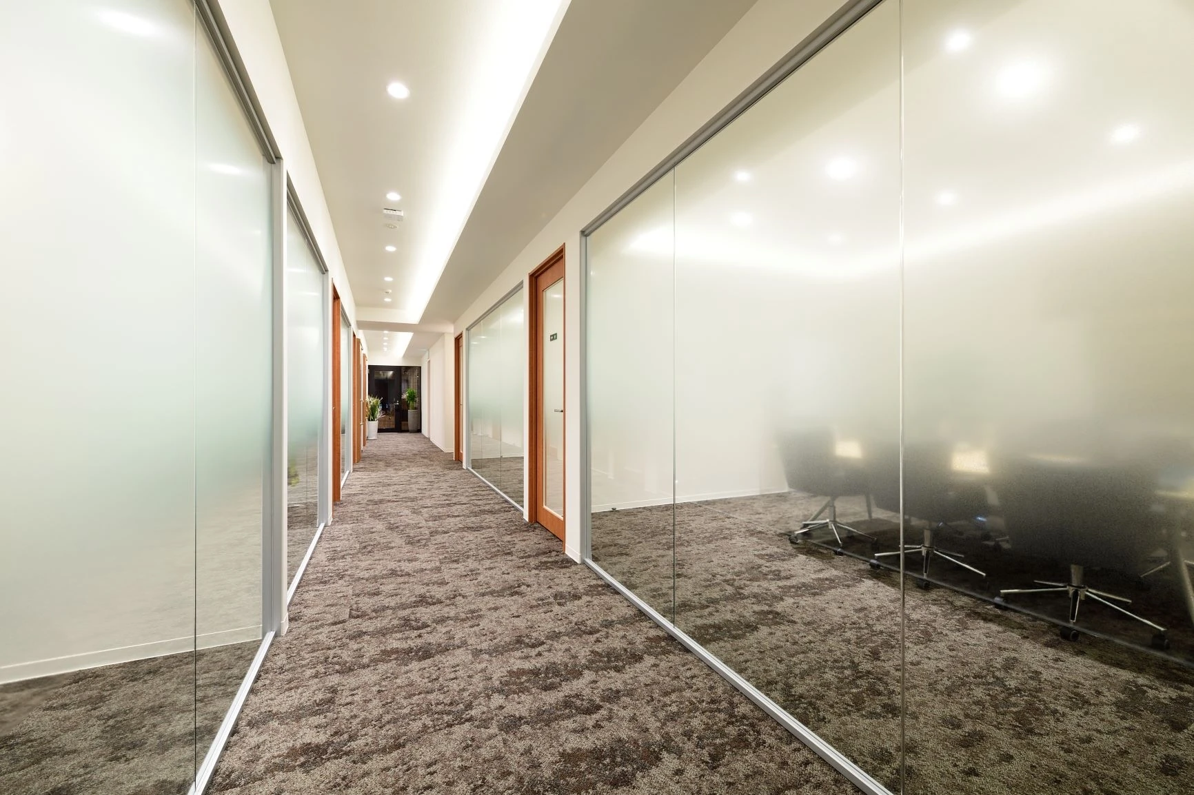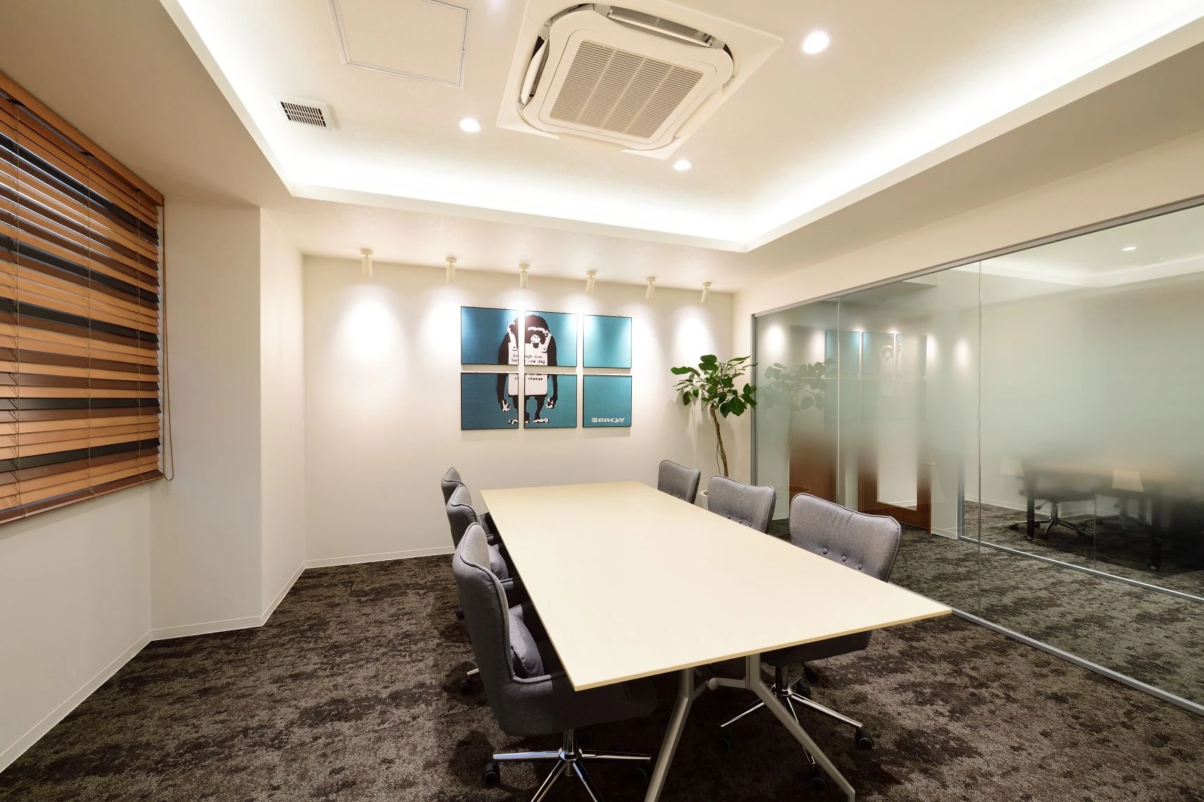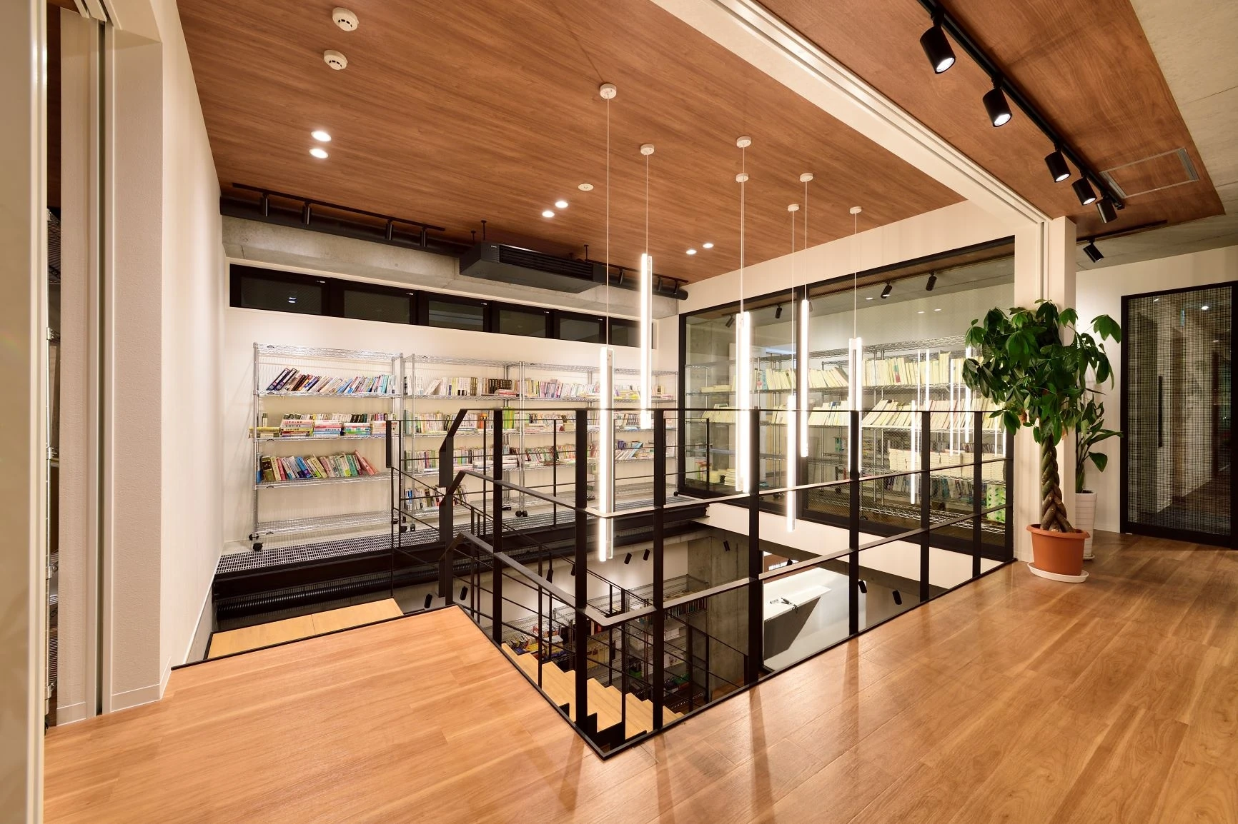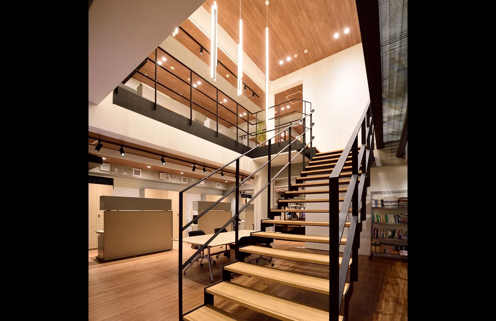 エントランスや会議室は、来訪する方が安心できるよう木目を基調にシンプルな設えとしました。一方、ワークスペースはシリコンバレーのようなイノベイティブな空間にしたいという想いのもと、各メンバーのプライベートスペースの確保をしつつ、コミュニケーションが自然と生まれる空間を目指しました。2F-3Fのフロア間には吹き抜け階段があり、その導線上にはライブラリースペースやコミュニケーションスペースを設置。また屋上スペースにはテーブルやテントが配置され「コミュニケーションオフィス」への仕掛けも満載になっております。そして、夏には屋上の芝生が生い茂り、メンバーの家族が集いバーベキューなどが行える、伏見総合法律事務所様らしい、素敵なビルとなりました。