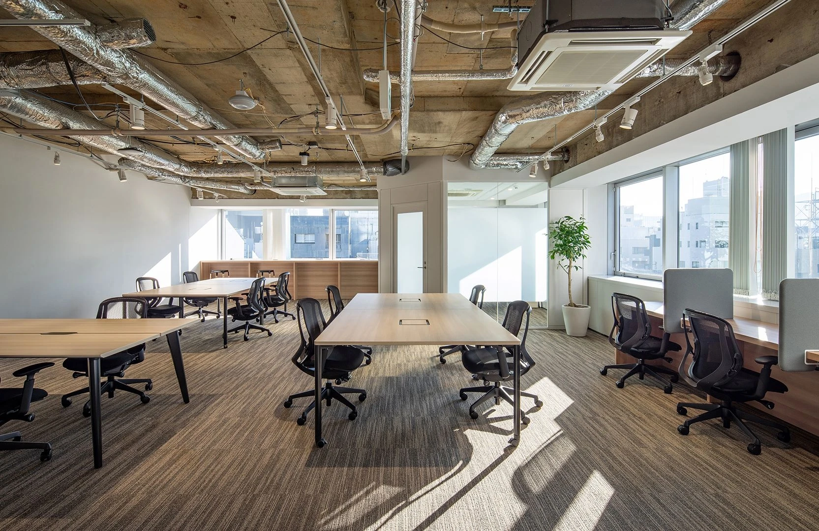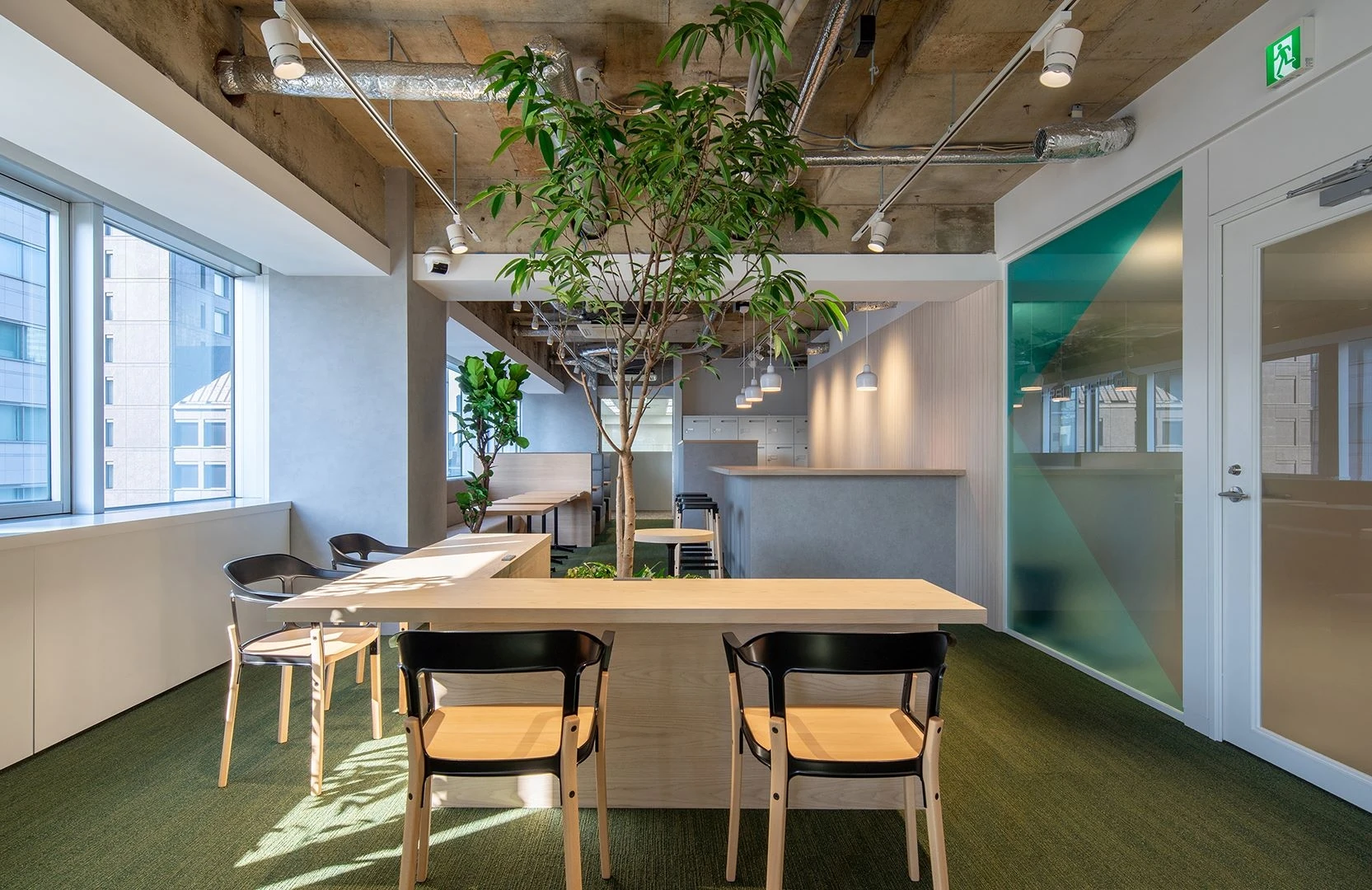 事業拡大を進める中で「テレワークも考慮したオフィスを」というご要望をいただきデザインしたオフィスです。スケルトン化した天井は空間に奥行きを持たせ、採光を活かしたレイアウトは温かみをもたらします。エントランスには、幾何学的なデザインフィルムをあしらうことで先進的な企業イメージも演出しています。ABW(アクティビティベースドワーキング)を実現するため、一般執務エリア・コミュニケーションエリア・集中エリア等、さまざまな用途に適したエリアを点在させつつ、可動式の什器を多く取り入れることで環境変化にも柔軟に対応する “AGILE OFFICE” が完成しました。