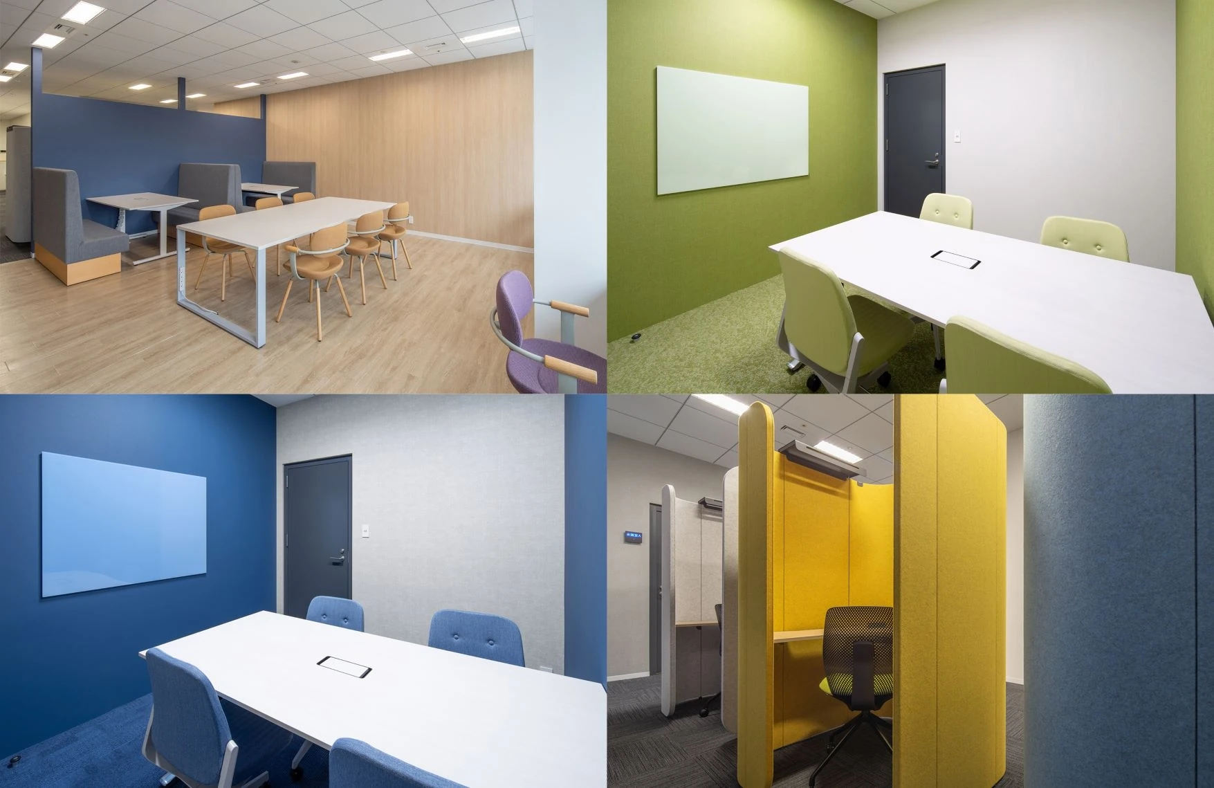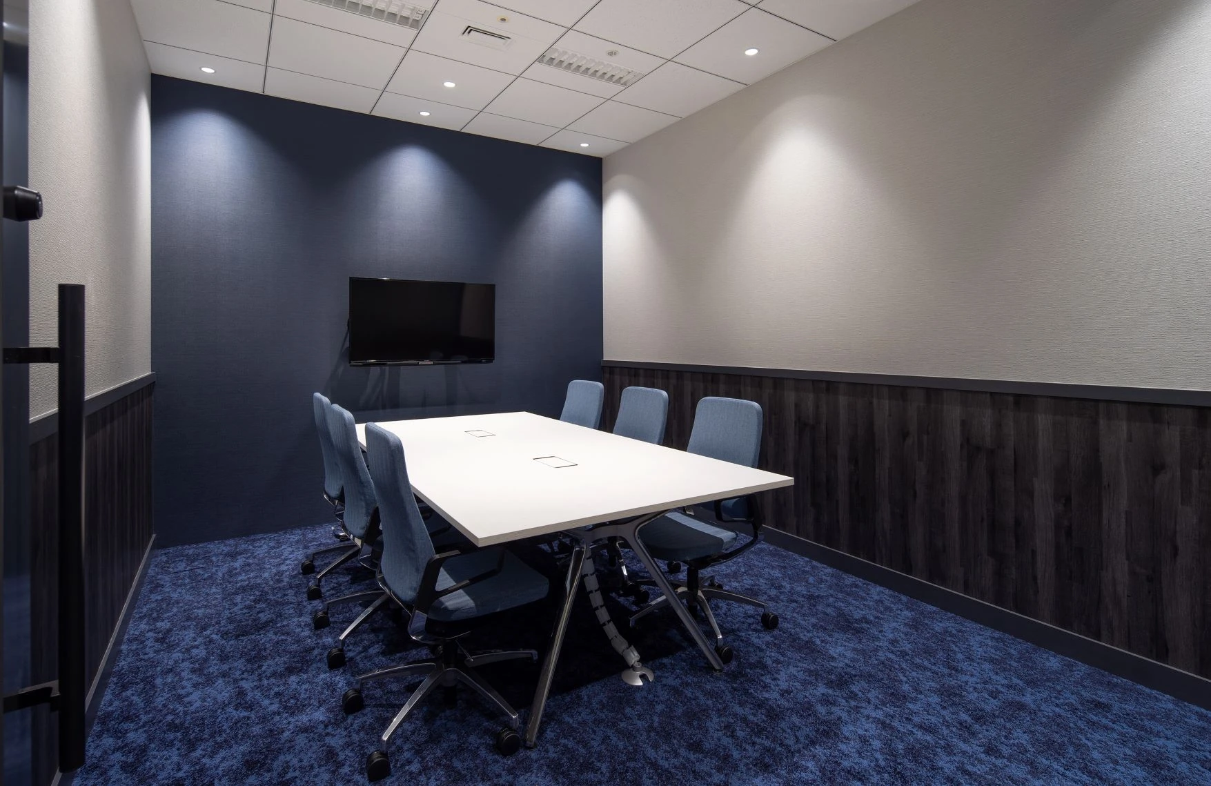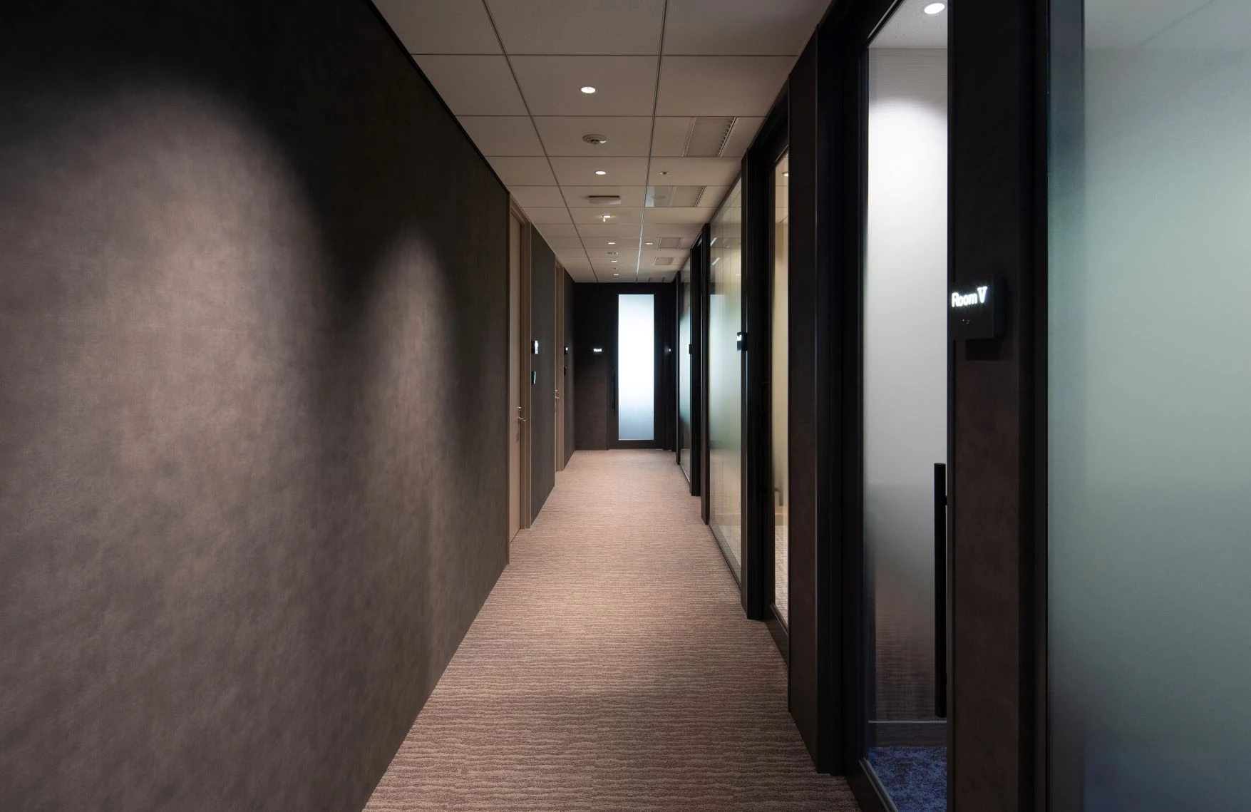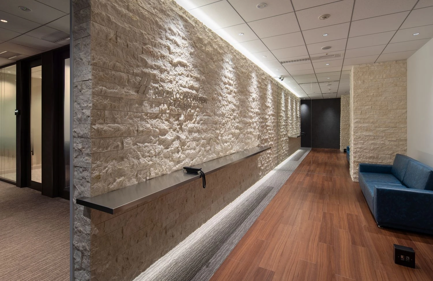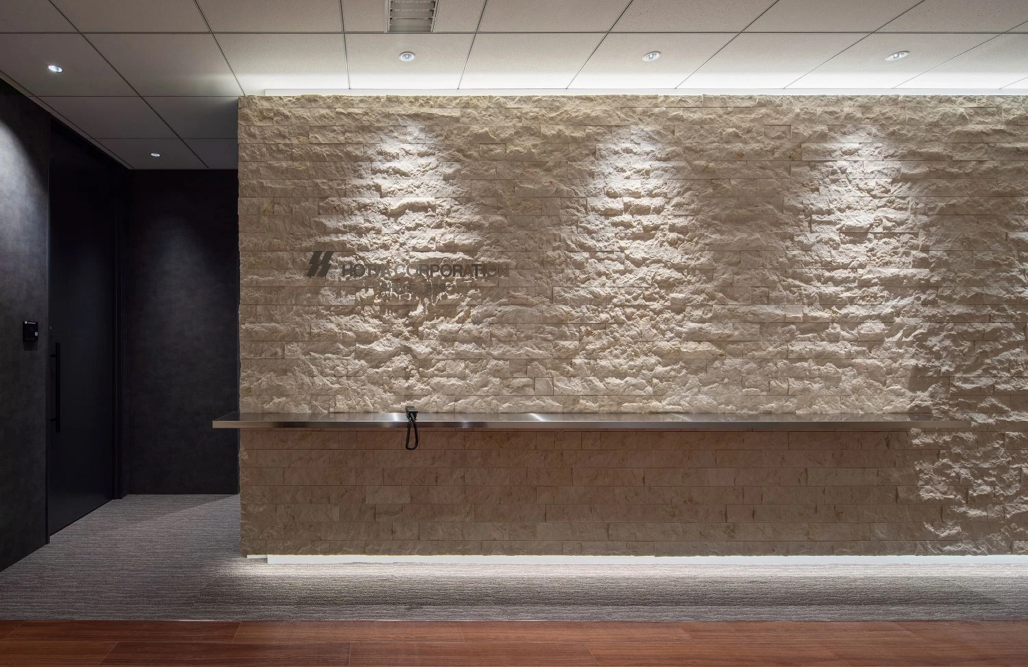 今回のオフィスではフロアまたぎだったオフィスを1フロアに集約させることでの業務効率の改善を図っております。エントランスは、140年以上にわたり積み上げてこられた歴史と信頼を石積みで表現し、重厚感のあるデザインにしました。奥へと続く廊下に面した会議室にはホッタ様が手掛ける商品の多彩な魅力を表し、各部屋をコンセプト分けしました。また執務室は、浜離宮恩賜庭園越しに広がる海を臨める眺望を活かし、ガラスを多用した風通しの良い空間となっております。日々の使い勝手を細かく落とし込んだ設備で業務の効率化を図りつつ、オープンカウンターやリフレッシュエリア、個別ブースなど、これまでのオフィスに無かったエリアを設けることで、新しい働き方や交流が生まれるきっかけを創出するオフィスとなりました。