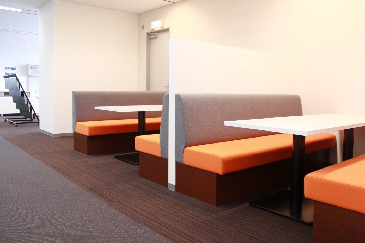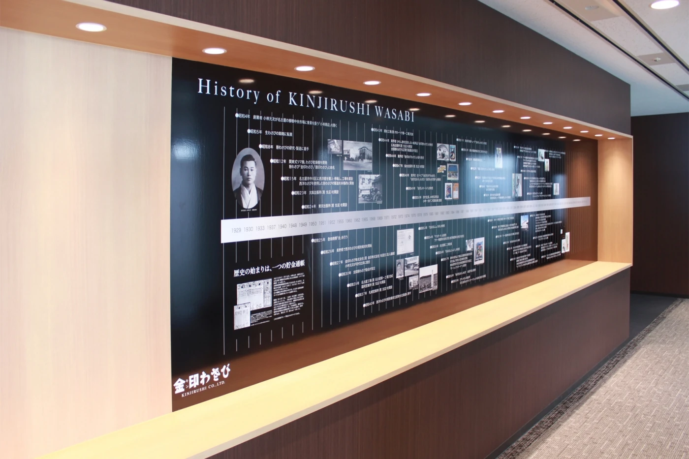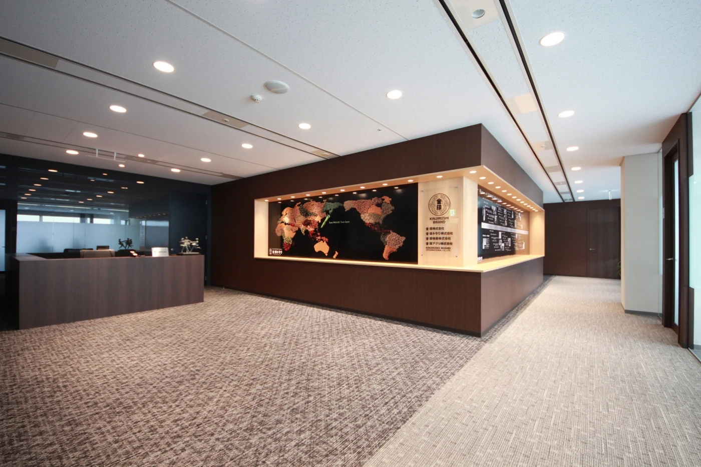 エントランススペースでは、来客者の視線を正面から受ける特大グラフィックパネルを設置し、金印ブランドを余すことなく表現しています。受付カウンター奥の壁にはブラックのカラーガラスを採用し、高級感と空間の広がりを感じさせます。さらに右側面の会議室の壁には全面透明ガラスを採用し、ビル最上階ならではの太陽光を採光できるよう、工夫しています。また動線の廊下には今までの歴史や歴代商品などを紹介するヒストリースペースを設け、創業85年の歴史を魅せると共に、未来の余白部分をあえて展示することで未来を創造していく自信を表現しています。
