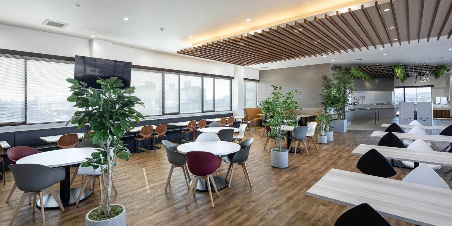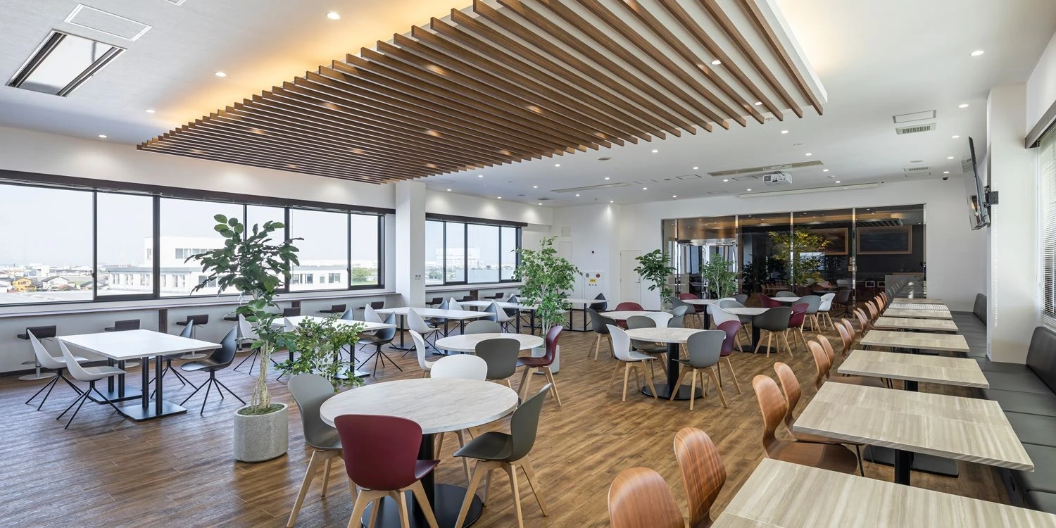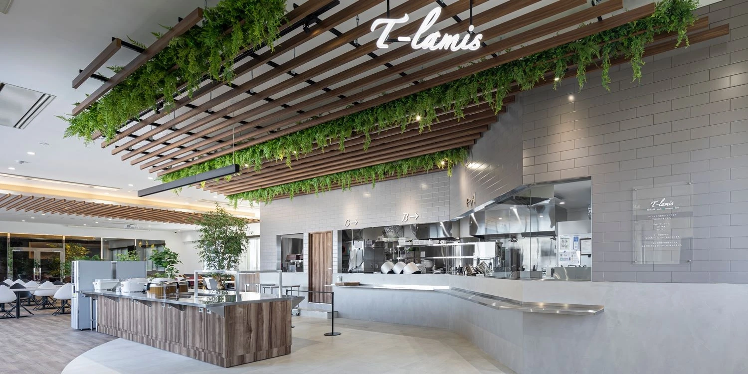 愛知県半田市の自社ビル4階に新しく食堂スペースをつくるプロジェクトです。健康経営+社員様の新しいコミュニケーションの場としてわざわざ足を運んでしまう快適な空間を目指しました。『T-lamis』と名付けられたこの空間は「Tira」=引っぱって、「mi」=私を、「su」=上へ、という単語から来たもので、「私を元気づけて」という意味が込められています。訪れる社員の皆様がおいしいご飯を食べて元気になり、午後からも効率よく働いて欲しいという想いを込めました。おいしいご飯が食べられるエリア、食後にゆっくりとコーヒーを飲めるエリア、ソファでゆっくりと雑談ができるエリア、マッサージチェアで体力を回復するエリア。社員の皆様の満足度をさらに高めたいという想いが伝わる場所になりました。