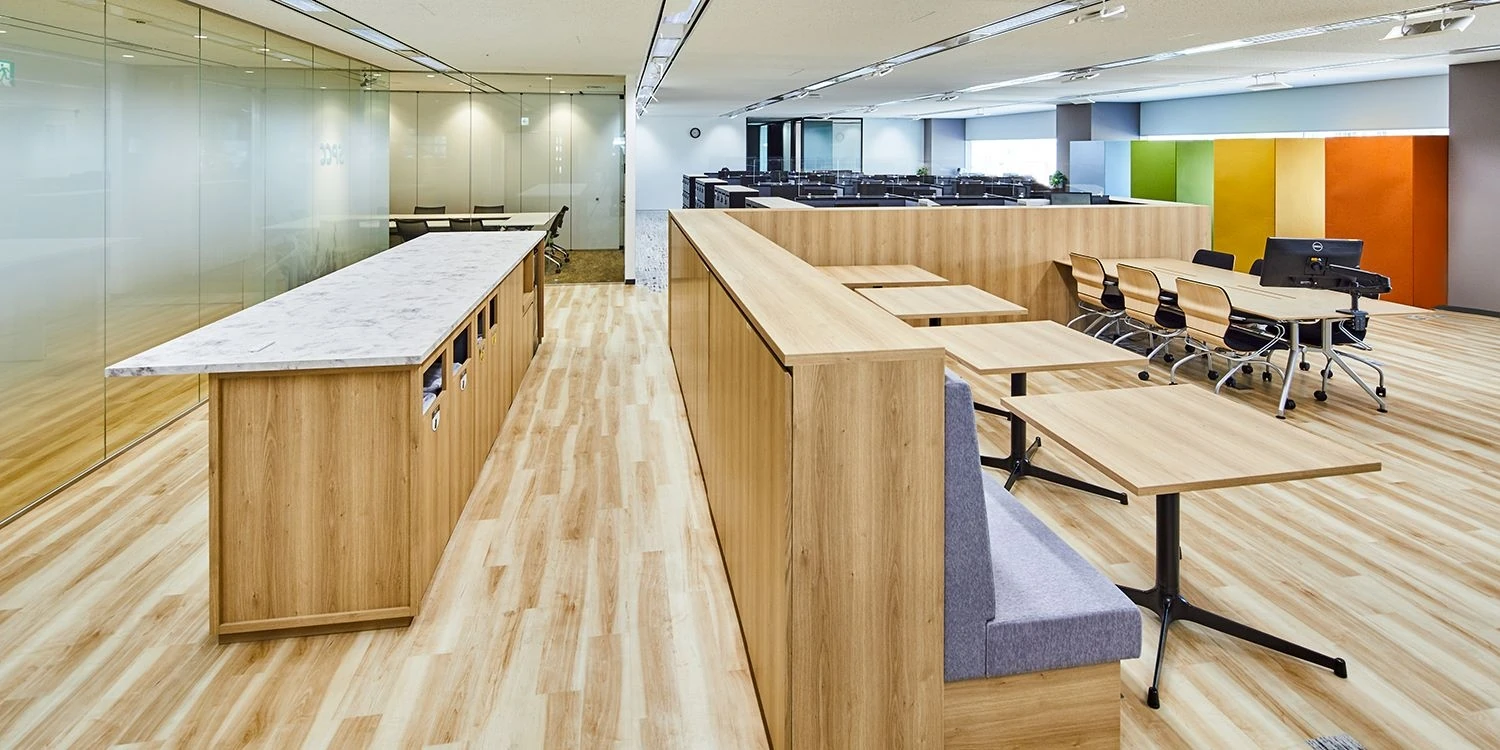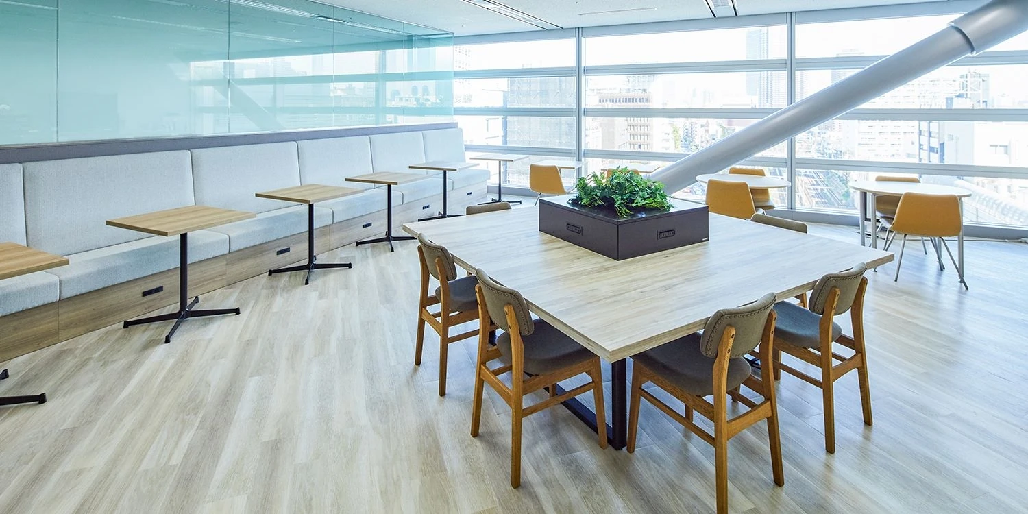 もともとコールセンターと他部署の2フロアで運営していた中、働き方やブランディング向上を見直す中で1フロアに集約。1フロア化したことにより音の問題など業務に支障が出ないように、一方で風通しの良いオフィスになるようレイアウトしました。オフィス中央にはコミュニケーションが自然と生まれるようフリースペースを設け、休憩時間に使用するリフレッシュスペースも、空間を切らないよう腰上からガラスにし一体感を出すデザインにしております。