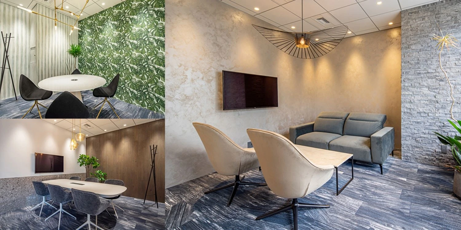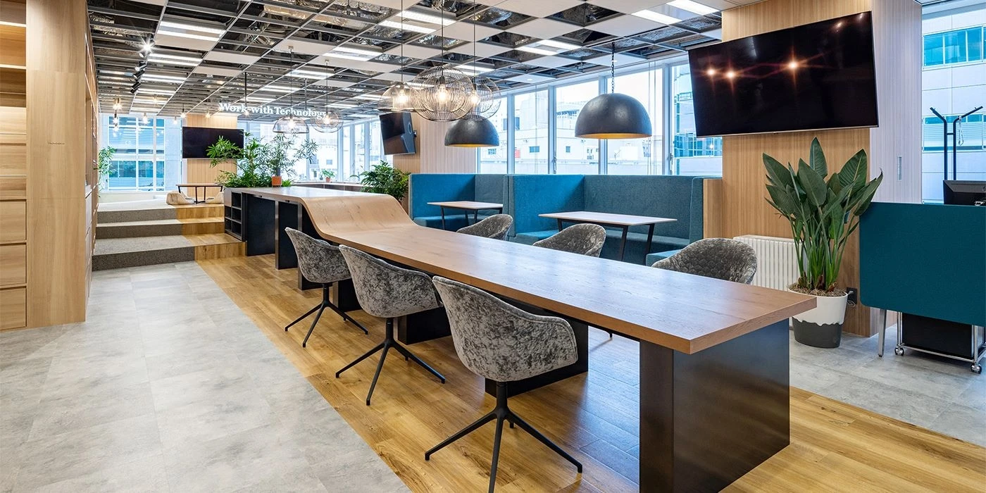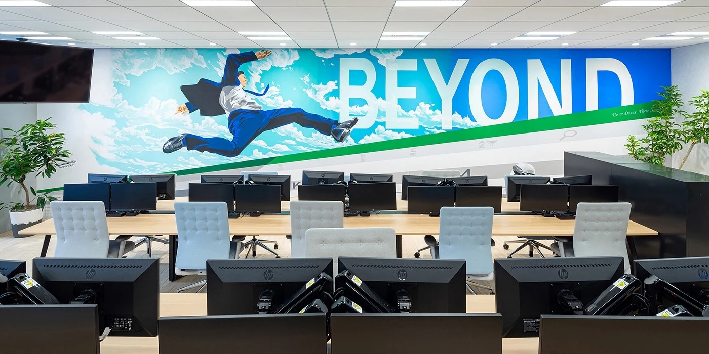 2拠点あったオフィスを1拠点に集約する移転プロジェクト。従来の会計事務所のイメージを覆すオフィスができあがりました。今回の移転に伴い、デザインはもちろん働き方にも大きな変化がありました。まずは固定席からフリーアドレス+ABWへの変化。フリーアドレス席の中にはハイデスクも設置し、Well-beingも意識しています。さらに個別ブースを5部屋設け、WEB会議が多い昨今に応じた働きやすいオフィスとしました。コンセプト『Beyond the Future』を意識できるよう壁一面にアートを施し、会社の目指す方向を社員が常に感じることができ、一体感を生むオフィスとなりました。