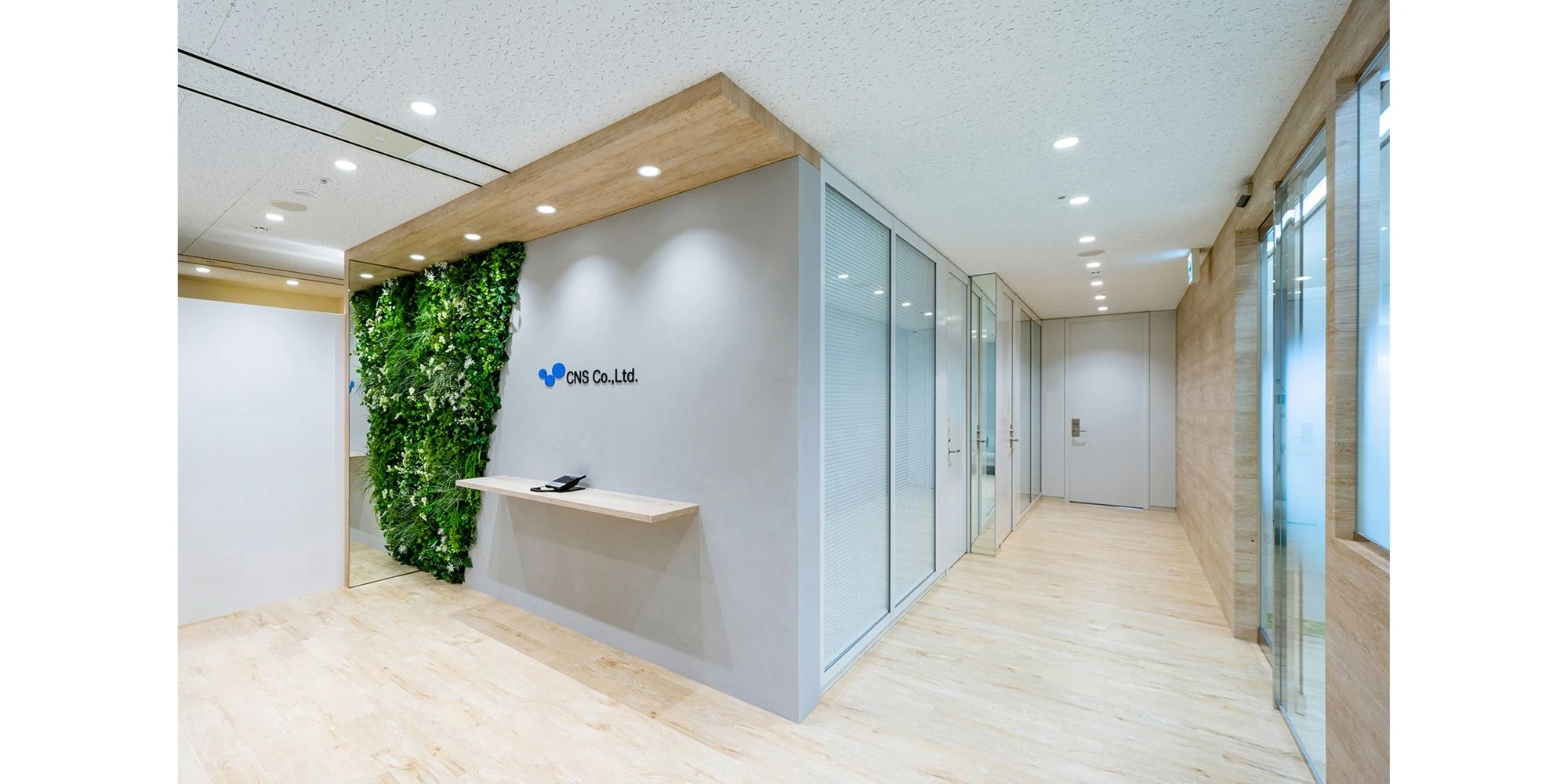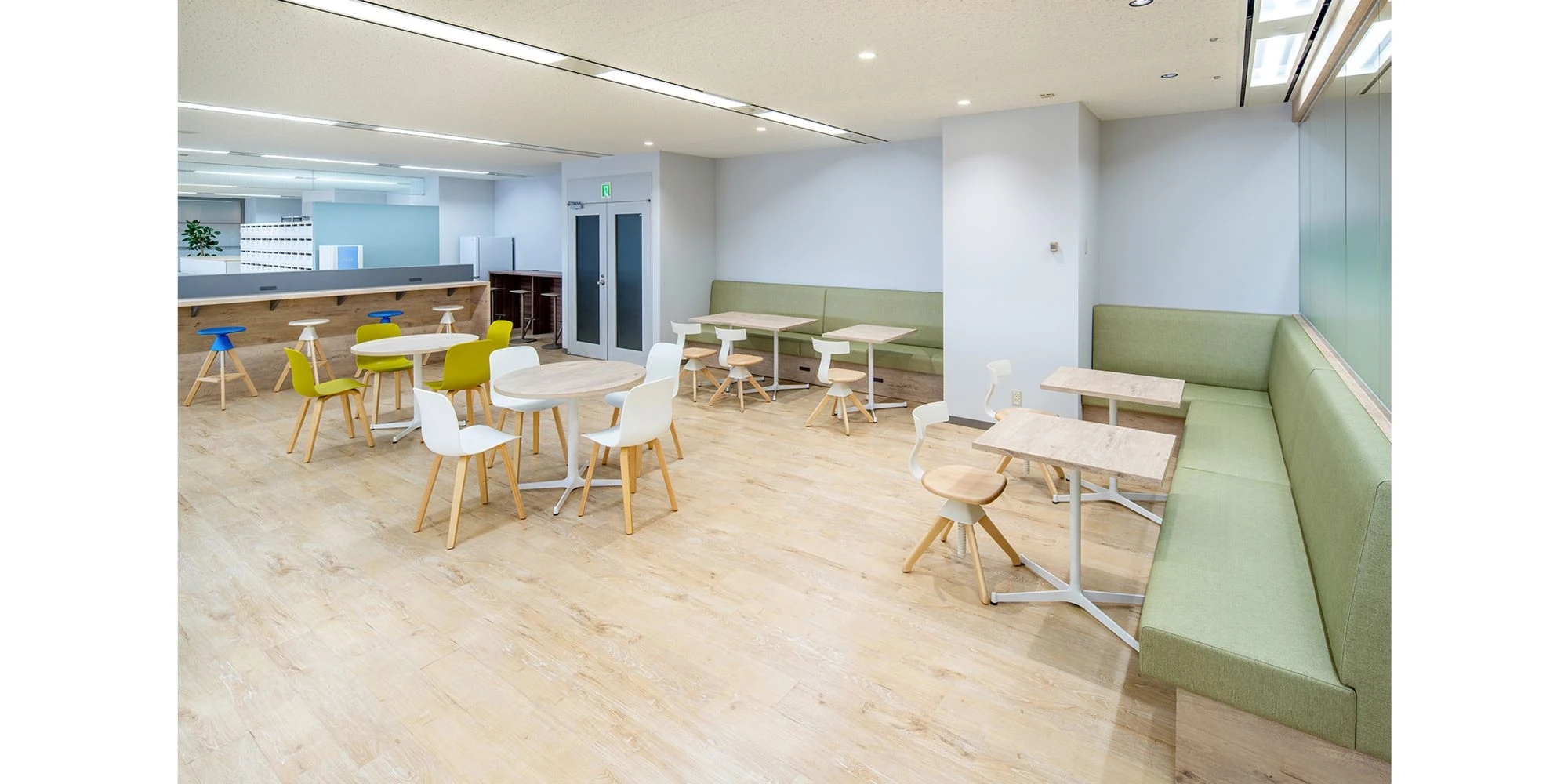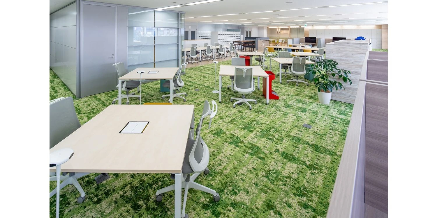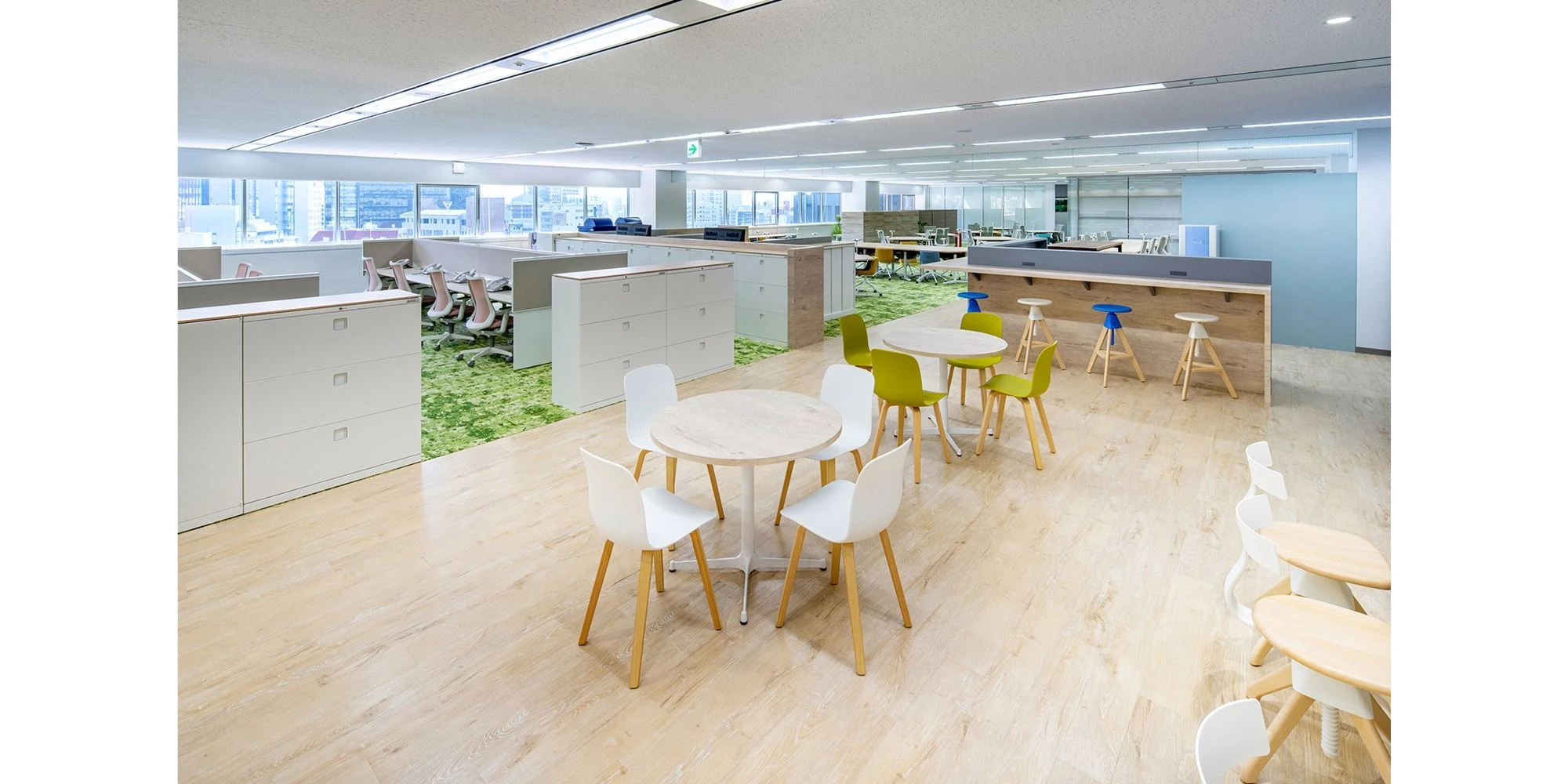 温かみのある木目やグリーンが印象的。開放的なフリーアドレスオフィス