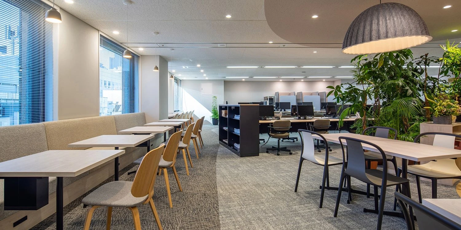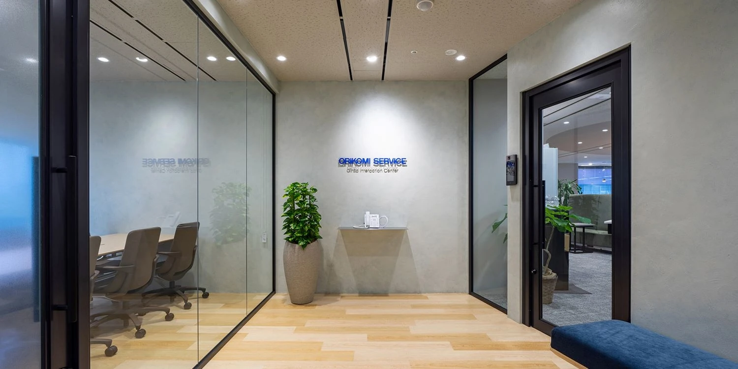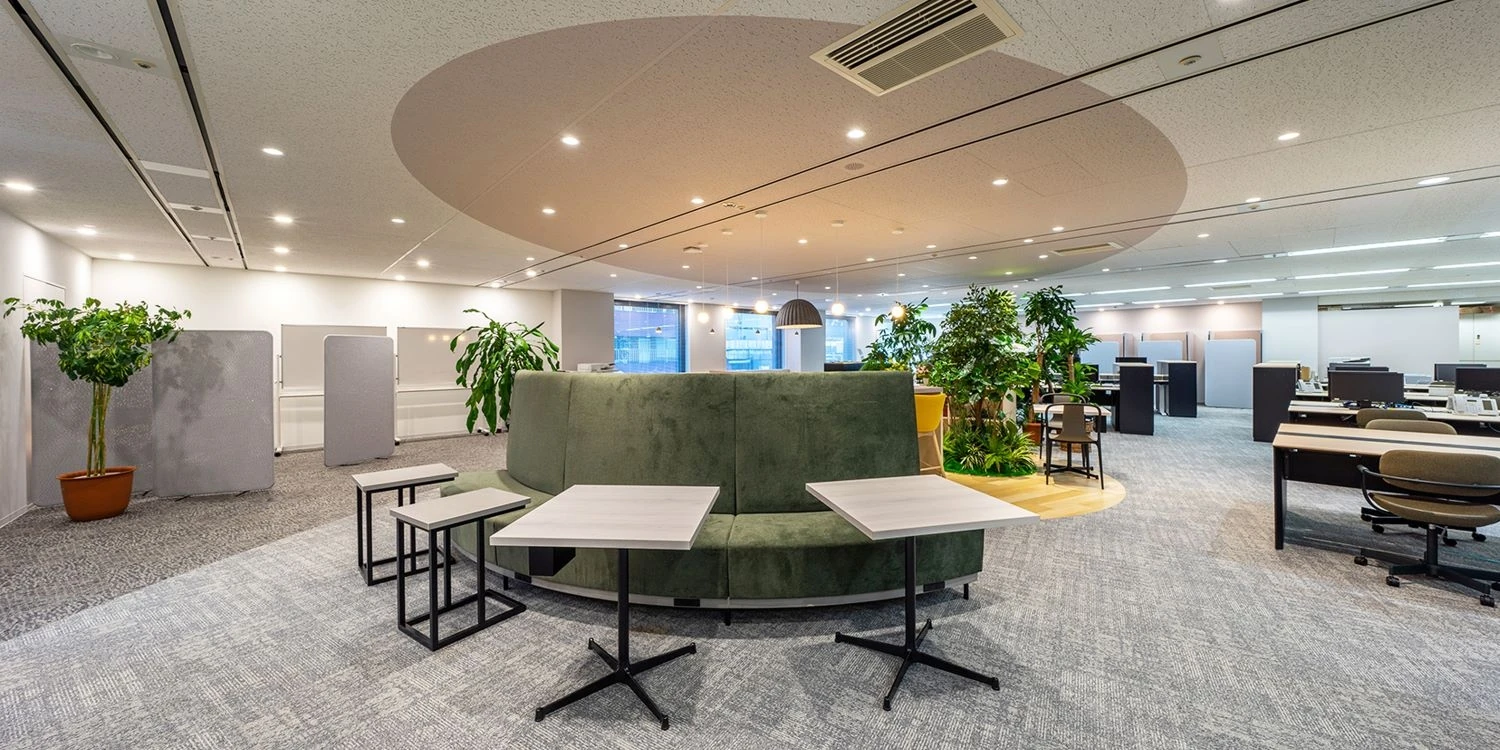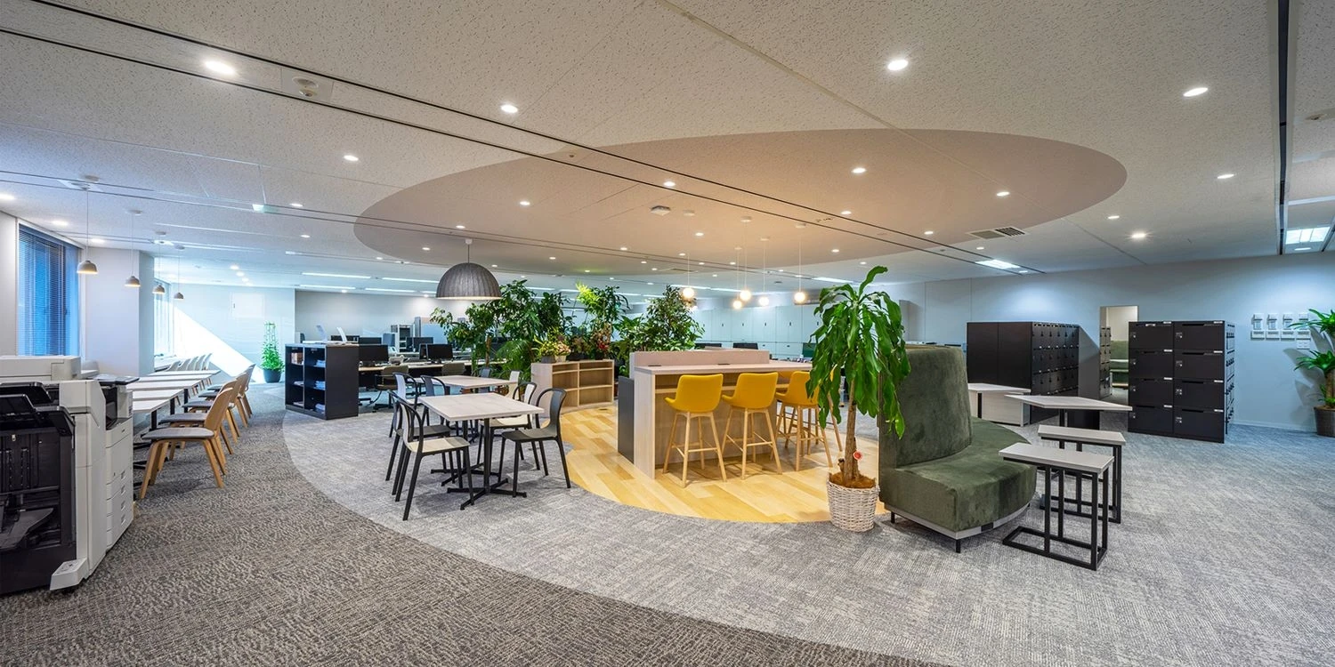 テレワークの導入に伴い、オフィスのライトサイジングを実施するためのご移転をお手伝いさせていただきました。「オフィスに革命を起こそう」というオリコミサービス様の強い想いを受け、「作業・保管・交流」をキーワードにオフィス計画を行いました。執務室は元々固定席でしたが、ABWを導入し、フリーアドレスデスクや昇降デスク、半個室のWEBブースを設置、窓際エリアにはカウンターデスクやソファー席を導入し、社員の皆さまが自ら場所を選んで働くことができます。オフィスの中央には大きなカフェカウンターを設け、自然と人が集まりコミュニケーションが生まれる仕組みを作りました。壁を一部ガラスにしてエントランスからも見えるようすることで、来客者に対してもオリコミサービス様を印象付けられるエリアとなっています。また、収納スペースをできるだけ多く設けるため、ソファ内部に収納できるようにするといった工夫をしています。